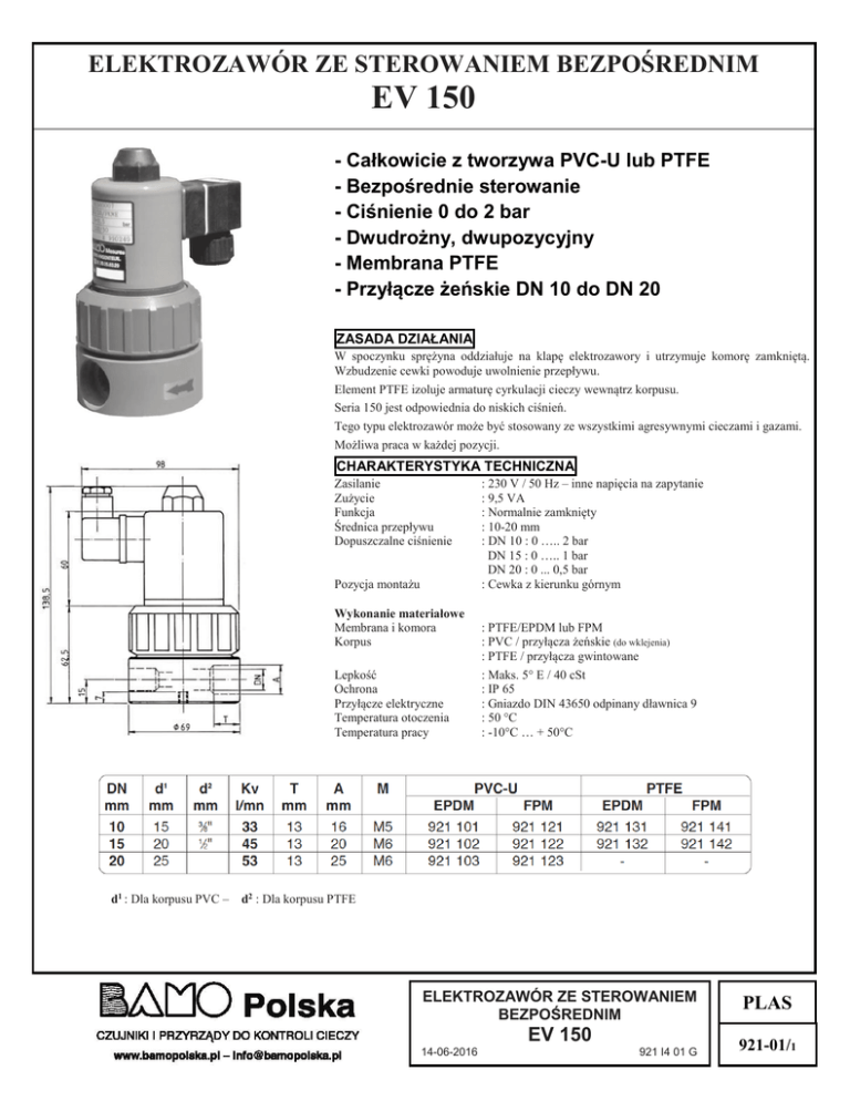 ELEKTROZAWÓR ZE STEROWANIEM BEZPOŚREDNIM EV 150 - Całkowicie z tworzywa PVC-U lub PTFE - Bezpośrednie sterowanie - Ciśnienie 0 do 2 bar - Dwudrożny, dwupozycyjny - Membrana PTFE - Przyłącze żeńskie DN 10 do DN 20 ZASADA DZIAŁANIA W spoczynku sprężyna oddziałuje na klapę elektrozawory i utrzymuje komorę zamkniętą. Wzbudzenie cewki powoduje uwolnienie przepływu. Element PTFE izoluje armaturę cyrkulacji cieczy wewnątrz korpusu. Seria 150 jest odpowiednia do niskich ciśnień. Tego typu elektrozawór może być stosowany ze wszystkimi agresywnymi cieczami i gazami. Możliwa praca w każdej pozycji. CHARAKTERYSTYKA TECHNICZNA Zasilanie Zużycie Funkcja Średnica przepływu Dopuszczalne ciśnienie Pozycja montażu Wykonanie materiałowe Membrana i komora Korpus Lepkość Ochrona Przyłącze elektryczne Temperatura otoczenia Temperatura pracy d1 : Dla korpusu PVC – : 230 V / 50 Hz – inne napięcia na zapytanie : 9,5 VA : Normalnie zamknięty : 10-20 mm : DN 10 : 0 ….. 2 bar DN 15 : 0 ….. 1 bar DN 20 : 0 ... 0,5 bar : Cewka z kierunku górnym : PTFE/EPDM lub FPM : PVC / przyłącza żeńskie (do wklejenia) : PTFE / przyłącza gwintowane : Maks. 5° E / 40 cSt : IP 65 : Gniazdo DIN 43650 odpinany dławnica 9 : 50 °C : -10°C … + 50°C d2 : Dla korpusu PTFE ELEKTROZAWÓR ZE STEROWANIEM BEZPOŚREDNIM EV 150 14-06-2016 921 I4 01 G PLAS 921-01/1