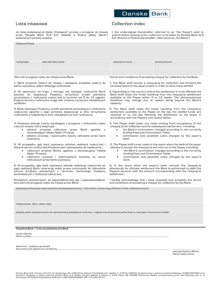 Lista inkasowa Collection index Ja niżej podpisany(-a) (dalej Podawca) proszę o przyjęcie do inkasa przez Danske Bank A/S S.A. Oddział w Polsce (dalej Bank) wskazanych poniżej czeków: I, the undersigned (hereinafter referred to as the Payee) wish to submit below cheque(-s) for collection to be taken by Danske Bank A/S S.A. Branch in Poland (hereinafter referred to as the Bank). Podawca/Payee rodzaj/type opis wartości/value waluta/currency kwota/amount Warunki przyjęcia czeku do inkasa przez Bank: Terms and conditions of accepting cheque for collection by the Bank: 1. Bank przyjmie czek(-i) do inkasa i następnie przekaże czek(-i) do banku wystawcy celem dalszego rozliczenia. 1. The Bank shall accept a cheque(-s) for collection and forward the received items to the payers bank in order to have them settled. 2. W zależności od kraju, z którego ma nastąpić rozliczenie Bank postawi do dyspozycji Podawcy otrzymane środki pieniężne pochodzące z rozliczenia czeku(-ów) w terminie od 3 do 12 tygodni. Podane terminy rozliczenia mogą ulec zmianie z przyczyn niezależnych od Banku. 2. Depending on the country where the settlement is to be effected the Bank shall make the funds resulting from the cheque(-s) settlement available to the Payee within 3 to 12 weeks. The aforementioned deadlines may change due to reason being beyond the Banks capacity. 3. Bank udostępni Podawcy środki pieniężne pochodzące z rozliczenia czeku(-ów) zgodnie z jego poniższą dyspozycją w dniu otrzymania rozliczenia, a najpóźniej w dniu następnym po tym rozliczeniu. 3. The Bank shall make the funds resulting from the cheque(-s) settlement available to the Payee on the day the settled funds are received or on the day following the settlement at the latest in accordance with the Payees instruction below. 4. Podawca pokryje koszty wynikające z przyjęcia i rozliczenia czeku (-ów) do inkasa, które obejmują: należne prowizje naliczone przez Bank zgodnie z obowiązującą Tabelą Opłat i Prowizji; należne prowizje i ewentualne koszty naliczane przez bank wystawcy. 4. The Payee shall cover any costs arising from acceptance of the cheque(-s) for collection and its subsequent settlement, including: the Banks commission charged according to the currently binding Fees and Commission Table; commission and potential costs charged by the payers bank. 5. W przypadku, gdy bank wystawcy odmówi realizacji czeku(-ów) i dokona zwrotu czeku(-ów) Podawca jest zobowiązany do zapłacenia: należnych prowizji Banku zgodnie z obowiązującą Tabelą Opłat i Prowizji; należnych prowizji i ewentualnych kosztów za zwrot naliczanych przez bank wystawcy. 5. The Payee shall cover costs in the event when the bank of the payer refuses to accept the cheque(-s) and returns to the Payee, including: the Banks commission charged according to the currently binding Fees and Commission Table; commission and potential costs charged by the payers bank. 6. W przypadku, gdy bank wystawcy odwoła realizację czeku(-ów) po jego realizacji Bank rezerwuje sobie prawo autoryzacji do dokonania zwrotu środków pieniężnych z rachunku bankowego Podawcy pochodzących z realizacji czeku(-ów). 6. In the event when the payers bank cancels the cheque(-s) afterwords its ultimate settlement the Bank is authorized to debit the Payees account with the amount corresponding with the cheque(-s) settlement. Niniejszym potwierdzam, że zapoznałem(-am) się i zaakceptowałem(am) warunki przyjęcia czeku do inkasa przez Bank. I hereby acknowledge that I have reviewed and accepted the terms and conditions of accepting a cheque for collection by the Bank. dyspozycja dotycząca wykorzystania zainkasowanej kwoty / instruction concerning utilization of the collected amount miejscowość, data / place, date podpisy osób upoważnionych do reprezentacji posiadacza rachunku / signatures of persons authorized to represent the account holder Wypełnia Bank / To be completed by the Bank numer klienta client number . dokument i podpisy sprawdził document and signatures verified by .. stempel dzienny Banku Banks daily stamp Danske Bank A/S, Holmens Kanal 2-12, Kopenhaga, DK-1092 Dania, Rejestr Przedsiębiorstw i Spółek nr CVR: 61126228, zarejestrowany i wpłacony kapitał zakładowy 10.086.200.000 koron duńskich, działający w Polsce poprzez Danske Bank A/S Spółka Akcyjna Oddział w Polsce, ul. Emilii Plater 28, 00-688 Warszawa, Polska, zarejestrowany przez Sąd Rejonowy dla m. st. Warszawy, XII Wydział Gospodarczy KRS pod nr KRS 0000250684, NIP: 107-000-49-37.
