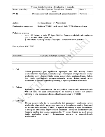 Numer procedury PN-12 WyŜsza Szkoła Turystyki i Hotelarstwa w Gdańsku Procedura Systemu Zarządzania Jakością tytuł: Ocena nauczycieli akademickich przez studentów Stron 3 Wydanie 1 Autor: M. Kurasińska i W. Nierzwicki Zaakceptowana przez: Rektora WSTiH prof. zw. dr hab. W.W. Gaworeckiego Podstawa prawna - Art. 132 Ustawy z dnia 27 lipca 2005 r. Prawo o szkolnictwie wyŜszym (Dz.U. 05.164.1365 z późn. zm.) - § 30 Statutu WyŜszej Szkoły Turystyki i Hotelarstwa w Gdańsku Data wydania 01.07.2012 Nr wydania Przyczyny kolejnego wydania Data 1. Cel Celem procedury jest spełnienie wymagań art. 132 ustawy Prawo o szkolnictwie wyŜszym, nakładającego obowiązek uwzględniania oceny studentów przy dokonywaniu oceny nauczyciela akademickiego. Celem jest takŜe zapewnienie przeprowadzania oceny dokonywanej przez studentów w sposób zestandaryzowany, z wykorzystaniem Internetu. 2. Zakres Procedura ma zastosowanie do wszystkich nauczycieli akademickich WSTiH oraz do osób zatrudnianych na umowę o dzieło lub umowę zlecenie w celu przeprowadzenia określonych zajęć w WSTiH. 3. Definicje Ocena nauczyciela to w rozumieniu tej procedury udzielanie przez studentów odpowiedzi na pytania zawarte w formularzu ankiety dostępnej na stronie internetowej WSTiH, w sposób określony w tym formularzu, a następnie obliczenie odpowiednich średnich i odchyleń standardowych. Średnia ogólna jest oceną nauczyciela. W ocenie bierze się pod uwagę takŜe swobodne uwagi i komentarze zawarte w odpowiedziach studenckich 1 Numer procedury PN-12 WyŜsza Szkoła Turystyki i Hotelarstwa w Gdańsku Procedura Systemu Zarządzania Jakością tytuł: Ocena nauczycieli akademickich przez studentów Stron 3 Wydanie 1 4. Odpowiedzialność 4.1. Rektor – za wyznaczenie pracownika administracyjnego do spraw ankietowania oraz za wykorzystanie wyników ankiety do oceny ogólnej nauczyciela akademickiego 4.2. Kanclerz – za zapewnienie odpowiednich środków dla administratora sieci w celu właściwego funkcjonowania aplikacji wykorzystywanej do ankietowania 4.3. Dziekan – za przeanalizowanie wyników oceny dokonywanej przez studentów i za ewentualne przeprowadzenie rozmów z nauczycielami i kierownikami zakładów jeŜeli oceny te będą takich rozmów wymagały 4.4. Kierownik dziekanatu – za współpracę z pracownikiem administracyjnym do spraw ankietowania w związku z koniecznością dostarczania administratorowi sieci odpowiednich danych dotyczących nazw przedmiotów i nazwisk osób je prowadzących aktualizowanych z semestru na semestr 4.5. Pracownik administracyjny do spraw ankietowania – za właściwą współpracę z administratorem sieci oraz za uruchomienie ankietowania w czasie przewidzianym procedurą, za rozpropagowywanie informacji o ankietowaniu wśród studentów, za przygotowanie raportów i przekazanie ich osobom wskazanym w procedurze. 4.6. Administrator sieci – za zapewnienie właściwego funkcjonowania aplikacji internetowej i za współpracę z pracownikiem administracyjnym do spraw ankietowania. 4.7. Samodzielne stanowisko ds. osobowych – za umieszczenie raportów dla poszczególnych nauczycieli akademickich w ich aktach osobowych. 5. Sposób postępowania a. Ocenianie nauczycieli akademickich przez studentów przeprowadza się po zakończeniu kaŜdego cyklu zajęć dydaktycznych, a więc dwa razy w ciągu roku akademickiego. Ze względu na to, Ŝe niektóre przedmioty mają rozmiar godzinowy umoŜliwiający ich zakończenie przed upływem semestru, ocenianie uruchamia się w połowie grudnia i zamyka na koniec lutego oraz uruchamia się w połowie maja i zamyka na początku lipca. b. Pracownik administracyjny ds. ankietowania wspólnie z kierownikiem dziekanatu zapewniają przekazanie administratorowi sieci (z odpowiednim wyprzedzeniem czasowym) aktualnych dla danego semestru danych obejmujących nazwiska nauczycieli, nazwy przedmiotów oraz rodzaje zajęć. 2 Numer procedury PN-12 WyŜsza Szkoła Turystyki i Hotelarstwa w Gdańsku Procedura Systemu Zarządzania Jakością tytuł: Ocena nauczycieli akademickich przez studentów Stron 3 Wydanie 1 c. Pracownik administracyjny ds. ankietowania zapewnia pojawienie się informacji dostępnej dla studentów o uruchomieniu ankietowania, wykorzystując tablice ogłoszeń stronę internetową WSTiH oraz konta WSTiH na portalach społecznościowych oraz zwraca się do samorządu studenckiego z prośbą o rozpropagowanie oceniania nauczycieli wśród studentów. d. Po zamknięciu oceniania pracownik administracyjny przygotowuje następujące raporty z wynikami oceniania: i.- raport zbiorczy obejmujący wszystkich nauczycieli w porządku alfabetycznym z informacją o wynikach oceny poszczególnych elementów wchodzących w jej skład, ujętych w pkt 6 ankiety, ii.- raport zbiorczy obejmujący wszystkich nauczycieli w postaci listy rankingowej uporządkowanej według malejącej oceny średniej ogólnej, iii.- raport zbiorczy obejmujący wszystkich nauczycieli z informacją o dodatkowych uwagach zgłoszonych przez studentów wykorzystujących moŜliwość daną punktem 7 ankiety, iv.- raport zbiorczy będący łącznym tabelarycznym zestawieniem ocen poszczególnych elementów z punktu 6 ankiety. v.- raport indywidualny dla kaŜdego ocenianego nauczyciela z ocenami dotyczącymi elementów podanych w pkt 6 ankiety vi.- raport indywidualny dla kaŜdego ocenianego nauczyciela akademickiego zawierający uwagi studentów zawarte w punkcie 7 ankiety e. Raporty zbiorcze i., ii., iii. oraz iv. przekazywane są Rektorowi, Kanclerzowi oraz Dziekanowi. Raporty indywidualne v. i vi. przekazywane są poszczególnym nauczycielom za pokwitowaniem po zakończeniu kaŜdego okresu oceniania (jeden egzemplarz) oraz pracownikowi na samodzielnym stanowisku ds. osobowych w celu dołączenia raportów do akt osobowych. Raport iv. przekazywany jest pełnomocnikowi rektora ds. jakości i rozwoju. f. Raportów dotyczących poszczególnych nauczycieli nie udo