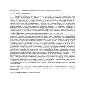 JC AUTO S.A. - Znacząca umowa leasingu zwrotnego nieruchomości RAPORT BIEŻĄCY NR 19/2005 Zarząd JC AUTO S.A. informuje, że w dniu 24.05.2005 r. zawarł z Fortis Lease Polska sp. z o.o. z siedzibą w Warszawie, ul. Postępu 15, Umowę leasingu zwrotnego nieruchomości na podstawie której Fortis Lease zobowiązuje się w zakresie działania swego przedsiębiorstwa do nabycia od Spółki na mocy Umowy sprzedaży i przekazania Spółce Przedmiotu Leasingu do używania w okresie obowiązywania umowy a Spółka zobowiązuje się do przejęcia przedmiotu leasingu do używania oraz do zapłaty opłaty manipulacyjnej, rat leasingowych oraz do wykonania innych obowiązków przewidzianych w umowie. Przedmiot leasingu stanowi budynek magazynowy z częścią biurową wraz z towarzyszącą infrastrukturą, budowany na działkach położonych w Kajetanach gmina Nadarzyn stanowiących jedną nieruchomość, dla której Sąd Rejonowy w Pruszkowie V Wydział Ksiąg Wieczystych prowadzi księgę wieczystą KW nr WA1P/00075159/2 o łącznej wartości 31.850.000,00 PLN (słownie: trzydzieści jeden milionów osiemset pięćdziesiąt tysięcy złotych). Umowa została zawarta w formie Aktu Notarialnego Repertorium A nr 2268/2004. Umowa wchodzi w życie z dniem podpisania, jednakże zobowiązanie Fortis Lease do nabycia przedmiotu leasingu powstaje pod warunkiem zapłaty opłat manipulacyjnych, wybudowania budynku i uzyskania przez Spółkę zezwolenia na użytkowanie nieruchomości oraz przedstawienia przez Spółkę badania audytu prawnego nieruchomości. Umowa zawarta została na czas oznaczony rozpoczynający się w dniu rozpoczęcia leasingu a kończący się po 120 miesiącach tj. w dniu wymagalności ostatniej raty leasingowej. Umowa ulega rozwiązaniu w wyniku decyzji podjętej przez Fortis Lease jeżeli warunki określone w umowie nie zostaną spełnione w terminie do 30 czerwca 2006 roku. Strony wspólnie postanowiły, że w dniu zawarcia Umowy Sprzedaży zawrą przedwstępną umowę sprzedaży od warunkiem, w której Fortis Lease zobowiąże się sprzedać Spółce, za cenę równą wartości końcowej przedmiotu leasingu, bez jakichkolwiek obciążeń na rzecz osób trzecich (za wyjątkiem obciążeń, na których ustanowienie Spółka wyrazi zgodę) zaś Spóła zobowiąże się nieruchomość kupić. W ww. umowie przedwstępnej strony zobowiążą się zawrzeć przyrzeczoną umowę sprzedaży przedmiotu leasingu w nieprzekraczalnym terminie 3 dni od daty wymagalności ostatniej raty leasingowej, lecz nie później niż do dnia 31 grudnia 2016 roku. Zabezpieczeniem kredytu jest rekta weksel własny in blanco opatrzony klauzulą „bez protestu” wraz z podpisaną deklaracją wekslową, upoważnienie do obciążenia rachunku w drodze polecenia zapłaty – „direct debit”, poddanie się rygorowi egzekucji w trybie art. 777 § 1 pkt 5 kodeksu postępowania cywilnego co do obowiązku zapłąty rat leasingowych i w zakresie obowiązku zwrotu przedmiotu leasingu w dniu upływu podstawowego okresu umowy. Kryterium uznania umowy za znaczącą jest jej wartość, która przekracza 10% wartości kapitałów własnych Spółki. Podstawa prawna: § 5 ust. 1 pkt 3 Rozporządzenia Rady Ministrów z dnia 16 października 2001 r. w sprawie informacji bieżących i okresowych przekazywanych przez emitentów papierów wartościowych. Data sporządzenia raportu: 25 maj 2005 roku