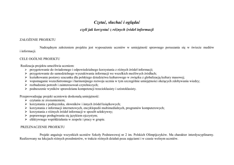 Czytać, słuchać i oglądać czyli jak korzystać z różnych źródeł informacji ZAŁOŻENIE PROJEKTU Nadrzędnym założeniem projektu jest wyposażenie uczniów w umiejętność sprawnego poruszania się w świecie mediów i informacji. CELE OGÓLNE PROJEKTU Realizacja projektu umożliwia uczniom: przygotowanie do świadomego i odpowiedzialnego korzystania z różnych źródeł informacji; przygotowanie do samodzielnego wyszukiwania informacji we wszelkich możliwych źródłach; kształtowanie postawy szacunku dla polskiego dziedzictwa kulturowego w związku z globalizacją kultury masowej; wspomaganie wszechstronnego i harmonijnego rozwoju ucznia w tym szczególnie umiejętności służących zdobywaniu wiedzy; rozbudzenie potrzeb i zainteresowań czytelniczych; podnoszenie wyników sprawdzianu kompetencji trzecioklasisty i szóstoklasisty. Przeprowadzając projekt uczniowie doskonalą umiejętność: czytania ze zrozumieniem; korzystania z podręcznika, słowników i innych źródeł książkowych; korzystania z informacji internetowych, encyklopedii multimedialnych, programów komputerowych; korzystania z różnych źródeł informacji w sposób selektywny; poprawnego posługiwania się językiem ojczystym; efektywnego współdziałania w zespole i pracy w grupie. PRZEZNACZENIE PROJEKTU Projekt angażuje wszystkich uczniów Szkoły Podstawowej nr 2 im. Polskich Olimpijczyków. Ma charakter interdyscyplinarny. Realizowany na lekcjach różnych przedmiotów, w trakcie różnych działań poza zajęciami i w czasie wolnym uczniów. CZAS REALIZACJI PROJEKTU Projekt realizowany będzie od września 2010 roku do czerwca 2011 roku. SPOSÓB REALIZACJI I etap: napisanie projektu II etap: przydzielenie zadań III etap: realizacja zadań przez cały rok szkolny (zbieranie punktów za wykonane zadania i zachowanie, wykonanie gazetek, wywieszanie haseł w wyznaczonym miejscu, przeprowadzenie konkursów, przeprowadzenie apeli, zorganizowanie spotkań itp.) IV etap: podsumowanie projektu (apel, prezentacja i nagrodzenie najlepszych prac, dyplomy dla klas itp.) PRZEBIEG PROJEKTU Miesiąc Środek masowego przekazu Wrzesień Październik Zadania do realizacji Apel: o wprowadzenie uczniów w tematykę projektu, o szczegółowe zapoznanie dzieci z zadaniami do realizacji w październiku. Telewizja o Zadanie dla wychowawcy – przygotowanie klasy do spotkania z ekspertem do spraw dziennikarstwa (przygotowanie pytań); o Odwiedziny dziennikarza z Regionalnej Telewizji „Eltronik”; o Dla klas I – III – przeprowadzenie wywiadu ze swoim wychowawcą; o Dla klas IV – VI – „Reklama naszej klasy” – prezentacja reklam (podczas konkursu np.: Mini playback show); o Wykonanie gazetki w holu głównym z hasłem przewodnim. Listopad Radio o Audycja przez radio-węzeł szkolny – uczniowie słuchają opowiadania, zapamiętują i zapisują najważniejsze informacje; o Odczytanie wywiadów z wychowawcami klas I – III przez radio-węzeł szkolny. Grudzień – styczeń Prasa, gazeta o Spotkanie z dziennikarzem wydawnictwa „Czas Brodnicy”; o „Zrób to sam” – ręczne przygotowanie czasopisma klasowego pt.: „Nasze sukcesy szkolne”; o Ścienne gazetki klasowe „Źródła informacji, z których korzystam”. Luty marzec Książka o Dla klas IV – VI – recenzja bądź reklama ulubionej książki – przygotowanie wystawki lub przygotowanie konkursu w formie ustnej; o Konkurs na tłumaczenie znaczenia trudnego wyrazu dla klas III; o Konkurs na wyszukiwanie hasła w słownikach dla klas IV-VI. Kwiecień Internet, komputer o Przygotowanie zaproszeń np.: na urodziny lub przedstawienie bądź inna okazję; o Przedstawienie dla kas I-II; o Przygotowanie okładki książki dla klas I-VI. Maj Plakat o Dla klas VI – przygotowanie plakatu ze swoimi zdjęciami „Absolwent”. Film, kino o Dla klas I – VI – wyjście do kina. Czerwiec Apel: o podsumowanie projektu, prezentacja i nagrodzenie najlepszych prac, dyplomy dla klas.