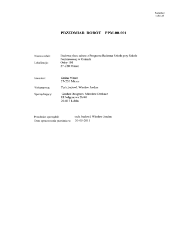 Samolicz sykal.pl PRZEDMIAR ROBÓT PPM-00-001 Nazwa robót: Lokalizacja: Budowa placu zabaw z Programu Radosna Szkoła przy Szkole Podstawowej w Osinach Osiny 101 27-220 Mirzec Inwestor: Gmina Mirzec 27-220 Mirzec Wykonawca: Tech.budowl. Wiesław Jordan Sporządzający: Garden Designers Mirosław Derkacz Ul.Poligonowa 2b/40 20-817 Lublin Przedmiar sporządził: Data opracowania przedmiaru: tech. budowl. Wiesław Jordan 30-05-2011 Samolicz sykal.pl SPIS DZIAŁÓW PRZEDMIAR ROBÓT PPM-00-001 Nazwa robót: Lokalizacja: Zamawiający: PRZEDMIAR PPM-00-001 Budowa placu zabaw z Programu Radosna Szkoła przy Szkole Podstawowej w Osinach Osiny 101 27-220 Mirzec Gmina Mirzec 27-220 Mirzec Strona 1 30-05-2011 SYKAL-NET DZIAŁ 1 2 3 4 5 6 N A ZW A D ZI A Ł U Nawierzchnia bezpieczna Nawierzchnia z kostki betonowej Zieleń Ogrodzenie Urządzenia Mała architektura Samolicz sykal.pl PRZEDMIAR ROBÓT PPM-00-001 Nazwa robót: Lokalizacja: Inwestor: PRZEDMIAR PPM-00-001 Budowa placu zabaw z Programu Radosna Szkoła przy Szkole Podstawowej w Osinach Osiny 101 27-220 Mirzec Gmina Mirzec 27-220 Mirzec Strona 1 30-05-2011 SYKAL-NET DZ 1 POZ SYMBOL POZYCJI NAZWA POZYCJI PRZEDMIAROWEJ JEDN MIARY ILOŚĆ Nawierzchnia bezpieczna 1 1 CEN 201-01-21-02-00 Roboty pomiarowe przy korytach pod place postojowe (wszystkich nawierzchni) HA 0,021 1 2 KNR 231-01-01-01-00 Mechaniczne wykonanie koryta na całej szer jezdni głęb 20 cm w gruncie kat 1/4 m² 170,000 1 3 KNR 231-01-01-02-00 Mechaniczne wykonanie koryta, w gruncie kategorii 1/4 - dadatek za każde 5 cm krotnośc 11 m² 170,000 401-01-08-06-00 Wywóz ziemi samochodami wywrotkami na odległość do 1 km w gruncie kategorii 3 m³ 127,000 231-01-03-04-00 Mechaniczne profilowanie i zagęszczenie podłoża kat 1/4 m² 170,000 1 4 CEN 1 5 KNR 1 6 Kalk.własna m² 170,000 1 7 CEN 231-01-04-05-00 Warstwa odsączająca w korycie, zagęszczenie mechaniczne grub 10 cm m² 126,000 1 8 CEN 231-01-04-06-00 Warstwa odsączająca w korycie, zagęszczenie mechaniczne - dodatek za 1 cm krotność 40 m² 126,000 231-04-07-01-00 ANALOGIA: Obrzeże betonowe 30x8cm na podsypce piaskowo-cementowej z wypełnieniem spoin zaprawą cementową metr 231-01-14-05-00 ANALOGIA: Warstwa dolna podbudowy z kruszywa łamanego grub 10 cm m² 126,000 Wykonanie podbudowy betonowej:. -Wykonanie płyty betonowej z betonu B-25 niwelacja i zawibrowanie. Grubość: 10cm. -Pielęgnacja posadzki. -Nacięcie szczelin dylatacyjnych. m² 126,000 1 9 CEN 1 10 CEN 1 11 Kalk.własana Dostawa i rozścielenie geowłókniny 75,000 1 12 Kalk.własna Nawierzchnia bezpieczna pomarańczowa HIC 1,5 (kolor: RAL:2011) m2 110,000 1 13 Kalk.własna Nawierzchnia bezpieczna niebieska HIC 1,5 (kolor:RAL:5003) m2 16,000 1 14 CEN 231-01-04-05-00 Warstwa odsączająca w korycie, zagęszczenie mechaniczne grub 10 cm m² 44,000 1 15 CEN 231-01-04-06-00 Warstwa odsączająca w korycie, zagęszczenie mechaniczne - dodatek za 1 cm krotność 36 m² 44,000 231-01-14-05-00 ANALOGIA: Warstwa dolna podbudowy z kruszywa łamanego grub 10 cm 1 16 CEN m² 44,000 1 17 Kalk.własana Wykonanie podbudowy betonowej:. -Wykonanie płyty betonowej z betonu B-25 niwelacja i zawibrowanie. Grubość: 10cm. -Pielęgnacja posadzki. -Nacięcie szczelin dylatacyjnych. m² 44,000 1 18 Kalk. własna Nawierzchnia bezpieczna pomarańczowa HIC 2,2 (kolor: RAL:2011) m² 40,000 1 19 Kalk. własna Nawierzchnia bezpieczna niebieska HIC 2,2 (kolor:RAL:5003) m² 4,000 1 21 Kalk. własna Nakładki gumowe na obrzeża betonowe metr 75,000 2 Nawierzchnia z kostki betonowej 2 21 KNR 231-01-01-01-00 Mechaniczne wykonanie koryta na całej szer jezdni głęb 20 cm w gruncie kat 1/4 m² 40,000 2 22 KNR 231-01-03-04-00 Mechaniczne profilowanie i zagęszczenie podłoża kat 1/4 m² 40,000 PRZEDMIAR PPM-00-001 Strona 2 30-05-2011 SYKAL-NET DZ POZ SYMBOL POZYCJI NAZWA POZYCJI PRZEDMIAROWEJ JEDN MIARY ILOŚĆ 2 23 KNR 231-04-07-01-00 ANALOGIA: Obrzeże betonowe 20x6cm na podsypce piaskowo-cementowej z wypełnieniem spoin zaprawą cementową metr 86,000 2 24 KNR 231-01-04-05-00 Warstwa odsączająca w korycie, zagęszczenie mechaniczne grub 10 cm m² 40,000 2 25 KNR 231-01-09-03-00 ANALOGIA: Podbudowa z chudego betonu 6cm, 2,5 MPA m² 40,000 2 26 KNR 231-01-18-01-00 Pielęgnacja podbudowy piaskiem z polewaniem wodą m² 40,000 2 28 CEN 231-05-11-02-01 Nawierzchnie z kostki betonowej kolorowej grub 6 cm na podsypce cementowo-piaskowej m² 40,000 3 Zieleń 3 28 Kalk.własna Nasadzenia na matach szkółkarskich wraz ze ściółkowaniem m² 47,000 3 29 Kalk.własna Trawnik m² 30,000 3 30 Kalk.włana Obrzeże trawnikowe metr 5,000 3 31 Kalk.wasna Nasadzenia z drzew szt 2,000 4 Ogrodzenie 4 32 Kalk.własna Ogrodzenie panelowe proste, ocynkowane fi 5+6+6mm, wys. 1,2 m metr 4 33 Kalk.własna Furtka ocynkowana wypełniona panelem zgrzewanym fi 5+6+6 szer. 1m, wys. 1,2m szt 4 34 Kalk. własna Piłkochwyt wys. 4m z siatki oczka 8x8cm metr 5 Urządzenia 5 35 Kalk.własna Wierza Activ(drabinka,zjeżdżalnia,ścianka do wspinaczki) szt 1,000 5 36 Kalk.własna Grzybki szt 5,000 5 37 Kalk.własna Drążek podwójny szt 1,000 5 38 Kalk.własna Huśtawka wagowa szt 1,000 5 39 Kalk.własna Huśtawka podwójna szt 1,000 5 40 Kalk.własna Małpi gaj (ścianka linowa,drabinka,drążki,lina) szt 1,000 6 Mała architektura 6 41 Kalk.własna Ławka szt 1,000 6 42 Kalk.własna Kosz szt 1,000 6 43 Kalk.wałasna Tablica informacyjna szt 1,000 33,000 1,000 31,000