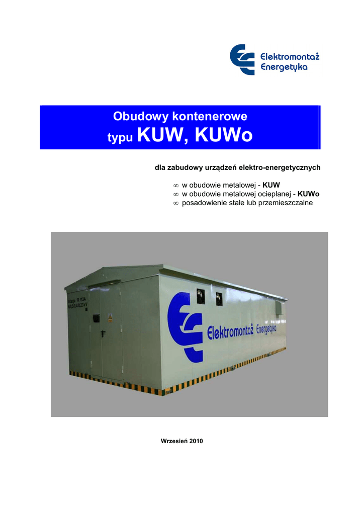Obudowy kontenerowe typu KUW, KUWo dla zabudowy urządzeń elektro-energetycznych • w obudowie metalowej - KUW • w obudowie metalowej ocieplanej - KUWo • posadowienie stałe lub przemieszczalne Wrzesień 2010 Elektromontaż Energetyka Sp. z o.o. Obudowy kontenerowe typu KUW, KUWo OBUDOWY KONTENEROWE typu KUW, KUWo Obudowy kontenerowe KUW, KUWo są przeznaczone do zabudowania w nich urządzeń elektroenergetycznych o stopniu ochrony IP4X. Można w nich montować np. : • rozdzielnice średniego napięcia : RS-12, RS-12m, RS-17, RS-17m, RS-24, RS-24m, RS-24 Jm, RXJ-35, RSU i inne urządzenia. • rozdzielnice niskiego napięcia:, RNZ, RNW, stojaki, szafy potrzeb własnych, szafki, transformatory, baterie akumulatorów, zasilacze, falowniki, rozruszniki i inne urządzenia. W kontenerze można wydzielić przedziały dla transformatora z osobnym wejściem lub podzielić stację na część średniego i niskiego napięcia, ewentualnie wydzielić pomieszczenie dla obsługi. KONSTRUKCJA Obudowa kontenerowa składa się z części nośnej oraz ścian bocznych, dachu i podłogi. Kontenery są ocieplone wełną mineralną - grubość 50 mm (ściany boczne) oraz l00 mm (sufit). Ściany zewnętrzne są wyłożone blachą płaską ocynkowaną, malowaną, wnętrze blachą trapezową ocynkowaną. Drzwi dwuskrzydłowe o szerokości 1200 mm lub 1600 mm. Mogą być zamykane na zamek z wkładką patentową lub ucieczkowe. Rama kontenera może być jednocześnie ramą posadowczą obudowy. Na życzenie klienta wykonujemy : • zamiast ramy nośnej - ponton umożliwiający przesuwanie, wysokości 500 mm, podłogi kontenera mogą być wyjmowane, prowadzenie kabli w pontonie • podłoga może być ocieplona wełną mineralną grubości 50 lub 100mm • podesty zgodnie z załączonym szkicem • schody zgodnie z załączonym szkicem Podłoga wykonana jest z blachy ocynkowanej , malowanej o grubości 3mm, w której są umieszczone przepusty kablowe w zależności od potrzeb, wsparta na ramie nośnej wykonanej z kształtników hutniczych w kształcie kratownicy. PRZEPUSTY KABLOWE Kable do kontenera można wprowadzać od dołu przez dławiki lub inne przepusty. Otworowanie podłóg należy podać przy zamówieniu. Możliwe jest wykonanie podejść kablowych innego rodzaju, w porozumieniu z wykonawcą. GABARYTY Wykonujemy obudowy o niżej podanych gabarytach: Szerokość B [mm] Wysokość H [mm] Wysokość wewnętrzna h [mm] 2300 2800 3100 3150 3200 3200 3700 3700 3700 2740 2780 2800 2810 2820 3020 2840 3040 3400 2450 2450 2450 2450 2450 2650 2450 2650 2800 Szerokość obudowy jest mierzona u jej podstawy, dach wystaje po 50 mm z każdej strony. Szerokość wewnętrzna zabudowy jest mniejsza o 200 mm od szerokości "B". Wysokość jest powiększona o grubość ramy nośnej (100-160 mm), pontonu (500 mm). Długość kontenera może być dowolna w zależności od potrzeb. Należy pamiętać, że najdłuższy moduł transportowy nie powinien przekraczać 13 m. Na życzenie i w uzgodnieniu z klientem możliwe jest wykonanie obudowy o innych gabarytach. WYPOSAŻENIE Obudowa standardowo jest wyposażona w oświetlenie podstawowe oraz awaryjne. Na życzenie klienta można zastosować wentylację wymuszoną lub grawitacyjną, ogrzewanie przy pomocy grzejników elektrycznych oraz zabudowanie klimatyzatora. Istnieje możliwość zamontowania instalacji telekomunikacyjnej wraz z telefonem. Można zamówić również samą konstrukcję kontenera bez wyposażenia. TRANSPORT Kontenery są transportowane w całości lub dzielone wg ustaleń inwestora z producentem. Najdłuższa obudowa, która może być przewieziona bez konieczności podziału nie powinna przekraczać 13 m. SPOSÓB ZAMAWIANIA Przy zamawianiu należy podać: • wielkość obudowy, • ocieplony lub nieocieplony, • sposób wentylacji i ogrzewania, • ewentualny podział wewnętrzny, • sposób prowadzenia kabli, • podziały transportowe, • wyposażenie w urządzenia elektroenergetyczne, • sposób posadowienia, Każdorazowo przy zamawianiu obudowy (ewentualnie jej projektowaniu) prosimy o kontakt z naszym przedsiębiorstwem, aby skonsultować szczegóły wykonania i wyposażenia stacji. Elektromontaż Energetyka Sp. z o.o. Obudowy kontenerowe typu KUW, KUWo Przykładowe rozmieszczenie urządzeń w obudowie kontenera Przykładowy rysunek obudowy kontenera POSADOWIENIE Kontener możemy posadowić w następujący sposób: • na przygotowanej przez inwestora konstrukcji wsporczej • na pontonie (z możliwością przesuwania kontenera) • na przygotowanych przez inwestora ławach fundamentowych UZIEMIENIE OCHRONNE Magistralę uziemiającą stanowi rama nośna kontenera wykonana z ceowników hutniczych 100 lub 160, do której przyspawane są zaciski uziemiające (złącza kontrolne). Zaciski uziemiające należy połączyć z uziemieniem obiektu. Połączenia wewnętrzne pomiędzy elementami konstrukcji szkieletu oraz blachami osłonowymi wykonane są poprzez wielokrotne skręcenie powierzchni ocynkowanych. Zaciski uziemiające urządzeń zamontowanych w kontenerze łączone są z zaciskami umieszczonymi na magistrali uziemiającej (ramy nośnej) za pomocą połączeń wykonanych bednarką, szyną miedzianą lub linką. ZGODNOŚĆ Z NORMAMI: Kontenerowa stacja transformatorowa spełnia następujące normy: • PN-EN 60069-2-1:2007; • PN-EN 60529:2003; EN 60529:1991+A1:2000 "Stopnie ochrony zapewnianej przez obudowy". • PN-EN 60068-2-2:2007; CERTYFIKAT • CERTYFIKAT wydany przez Instytut Elektrotechniki Warszawa, potwierdzający dane znamionowe, o nr.: 0820/NBR/2010 DANE TECHNICZNE Stopień ochronny: IP54 Wytrzymałość na temperatury: o o suche gorąco:+700C; 186h (próba Bp) zimno : -500C; 72h (próba Ab) Elektromontaż Energetyka Sp. z o.o. Obudowy kontenerowe typu KUW, KUWo Jedna z kontenerowych stacji transformatorowych na zwałowarce ZGOT – 11 500 w Kopalni Węgla Brunatnego TURÓW k/Bogatyni ul. Opolska 140 52-014 Wrocław fot. Jerzy Wie