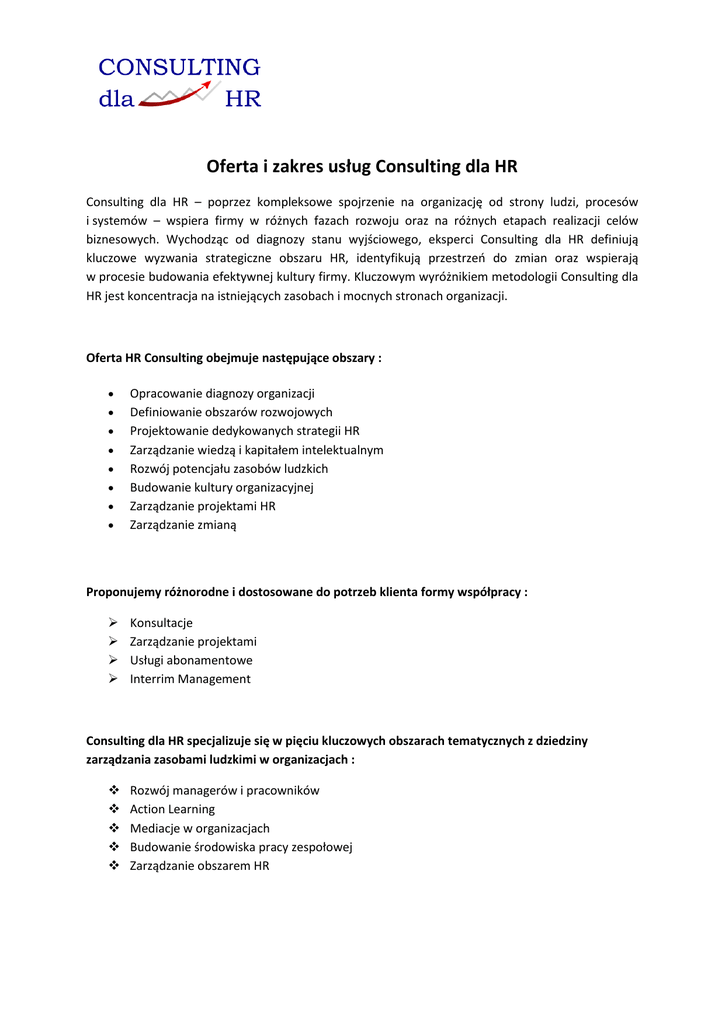 Oferta i zakres usług Consulting dla HR Consulting dla HR – poprzez kompleksowe spojrzenie na organizację od strony ludzi, procesów i systemów – wspiera firmy w różnych fazach rozwoju oraz na różnych etapach realizacji celów biznesowych. Wychodząc od diagnozy stanu wyjściowego, eksperci Consulting dla HR definiują kluczowe wyzwania strategiczne obszaru HR, identyfikują przestrzeń do zmian oraz wspierają w procesie budowania efektywnej kultury firmy. Kluczowym wyróżnikiem metodologii Consulting dla HR jest koncentracja na istniejących zasobach i mocnych stronach organizacji. Oferta HR Consulting obejmuje następujące obszary : Opracowanie diagnozy organizacji Definiowanie obszarów rozwojowych Projektowanie dedykowanych strategii HR Zarządzanie wiedzą i kapitałem intelektualnym Rozwój potencjału zasobów ludzkich Budowanie kultury organizacyjnej Zarządzanie projektami HR Zarządzanie zmianą Proponujemy różnorodne i dostosowane do potrzeb klienta formy współpracy : Konsultacje Zarządzanie projektami Usługi abonamentowe Interrim Management Consulting dla HR specjalizuje się w pięciu kluczowych obszarach tematycznych z dziedziny zarządzania zasobami ludzkimi w organizacjach : Rozwój managerów i pracowników Action Learning Mediacje w organizacjach Budowanie środowiska pracy zespołowej Zarządzanie obszarem HR Szczegółowy zakres usług oferowanych przez Consulting dla HR w poszczególnych obszarach tematycznych : Rozwój managerów i pracowników Systemy ocen pracowniczych i managerskich Projektowanie i wdrażanie systemów kompetencyjnych Analiza potrzeb szkoleniowych Kompleksowe programy rozwoju pracowników Ścieżki kariery Rozwój talentów Ewaluacja szkoleń Action Learning Cykl uczenia się dorosłych Temat i cele sesji Action Learning Uczenie się na bazie doświadczeń Kreatywność i poszukiwanie rozwiązań Budowa obszarów synergii Komunikacja nastawiona na współpracę Rozwój indywidualny i grupowy Mediacje w organizacjach O co walczą strony - wartości jako przyczyna konfliktu Kontekst społeczny i strukturalny konfliktu Bezpieczeństwo stron – kodeks etyczny mediatora Budowanie warunków zaufania w mediacjach Dialog jako narzędzie porozumienia bez przemocy Siła i rola emocji w procesie mediacyjnym Określenie celów i kryteriów sukcesu w procesie mediacji Budowanie środowiska pracy zespołowej Budowanie efektywnych strategii przywództwa Tworzenie warunków współpracy wewnętrznej Identyfikowanie obszarów synergii Modelowanie wspólnego systemu wartości Efektywne systemy komunikacji wewnętrznej Identyfikacja ról zespołowych (metoda Belbina) Tworzenie systemów motywacyjnych Zarządzanie sukcesem Zarządzanie obszarem HR Strategie HR dostosowane do wyzwań biznesowych Wytyczanie celów i ustalanie priorytetów Rekrutacja wewnętrzna i zewnętrzna Strategie utrzymania zasobów ludzkich Programy optymalizacji zasobów ludzkich Planowanie i wdrażanie sukcesji Budowanie kultury organizacyjnej Efektywna komunikacja wewnętrzna Systemy motywacyjne Etyka w biznesie