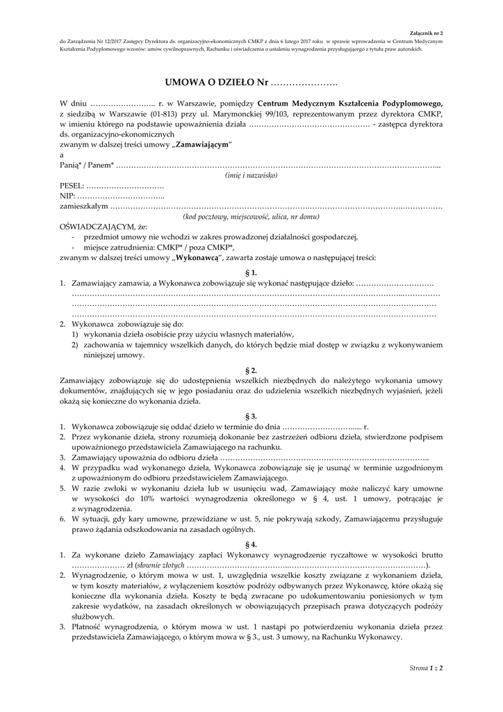 Załącznik nr 2 - Umowa o dzieło - wzór 2017
