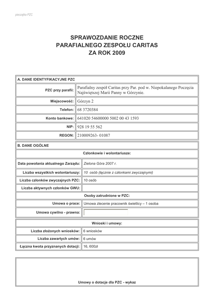 pieczątka PZC SPRAWOZDANIE ROCZNE PARAFIALNEGO ZESPOŁU CARITAS ZA ROK 2009 A. DANE IDENTYFIKACYJNE PZC PZC przy parafii: Miejscowość: Telefon: Konto bankowe: NIP: REGON: Parafialny zespół Caritas przy Par. pod w. Niepokalanego Poczęcia Najświętszej Marii Panny w Górzynie. Górzyn 2 68 3720384 641020 54600000 5002 00 43 1593 928 19 55 562 210009263- 01087 B. DANE OGÓLNE Członkowie i wolontariusze: Data powołania aktualnego Zarządu: Liczba wszystkich wolontariuszy: Liczba członków zwyczajnych PZC: Zielona Góra 2007 r. 10 osób (łącznie z członkami zwyczajnymi) 10 osób Liczba aktywnych członków GWU: Osoby zatrudnione w PZC: Umowa o prace: Umowa zlecenie pracownik świetlicy – 1 osoba Umowa cywilno - prawna: Wnioski i umowy: Liczba złoŜonych wniosków: 6 wniosków Liczba zawartych umów: 6 umów Łączna kwota przyznanych dotacji: 16, 600zł Umowy o dotacje dla PZC - wykaz Kto: Cel dotacji: Kwota dotacji: Urząd miasta Lubsko wakacje 2000zł Urząd Miasta Lubsko Konkurs wielkanocny 1000 zł Wynagrodzenie całoroczne 7,500zł GKRPA Lubsko Wakacje 2000 GKRPA Wynagrodzenie wakacyjne na 2 osoby 1600 Kuratorium Oświaty wakacje 1100 Powiat śary Wakacje 1000 SP Górzyn Działalność 200 Rada Sołecka Działalność 200 Urząd Miasta Lubsko C. DZIAŁALNOŚĆ CHARYTATYWNA Nazwa akcji: Ferie zimowe – półkolonie Organizacja: samodzielnie zorganizowana/zorganizowana z diecezjalną Caritas* Liczba dzieci: 30 dzieci Koszty X przeprowadzonej akcji: Dotacja z Caritas diecezjalnej ----------------------Dotacje z urzędów adm. pub., fundacji i innych instytucji 600 zł Darowizny finansowe Środki własne Nazwa akcji: Dzień Chorego Odwiedziny w domach - liczba osób Dzień chorego: Odwiedziny w szpitalach - liczba osób Liczba uczestników: Nazwa akcji: Liczba rozprowadzonych chlebków: Wielkanocne Dzieło Caritas - Chleb Miłości 150 chlebków Nazwa akcji: Liczba rozprowadzonych ----------------------------paschalików: Nazwa akcji: Świąteczna zbiórka Ŝywności: Pomoc świąteczna – Wielkanoc 20 kg Sprawozdanie roczne PZC za rok 2009 400 zł zł. (zebrane produkty) 2 Paczki świąteczne: 30 ilość (liczba paczek) Śniadanie wielkanocne -----------------------------liczba uczestników: *właściwe zaznaczyć Nazwa akcji: Dzień dziecka Organizacja: samodzielnie zorganizowana/zorganizowana z diecezjalną Caritas* Liczba dzieci: X Festyn Wycieczka Forma imprezy: Upominki Inne Nazwa akcji: Wakacyjna Akcja Caritas – półkolonie Organizacja: samodzielnie zorganizowana/zorganizowana z diecezjalną Caritas* Liczba dzieci: 30 dzieci Dotacja z Caritas diecezjalnej ------------------------- Koszty przeprowadzonej akcji: Dotacje z urzędów adm. pub., fundacji i innych instytucji 7 500 Darowizny finansowe Środki własne Nazwa akcji: Wakacyjna Akcja Caritas – kolonie Organizacja: samodzielnie zorganizowana/zorganizowana z diecezjalną Caritas* Liczba dzieci: ---------------------------------------------Dotacja z Caritas diecezjalnej Koszty przeprowadzonej akcji: Dotacje z urzędów adm. pub., fundacji i innych instytucji Darowizny finansowe Środki własne Nazwa akcji: Wyprawki szkolne dla dzieci Liczba dzieci: Wyprawki szkolne: Wartość: Nazwa akcji: Liczba dzieci: Zbiórka z uśmiechem do szkoły X Inne 230 zł DoŜywianie w szkołach --------- Sprawozdanie roczne PZC za rok 2009 3 Wartość: -------------------zł *właściwe zaznaczyć Nazwa akcji: Wigilijne Dzieło Pomocy Dzieciom Liczba rozprowadzonych świec małych: 420 Liczba rozprowadzonych świec duŜych: ------------ Nazwa akcji: Pomoc świąteczna - BoŜe Narodzenie Świąteczna zbiórka 20 kg 400 zł (zebrane produkty) Ŝywności: Paczki świąteczne: 30 ilość (liczba paczek) Wieczerza wigilijna liczba uczestników: Nazwa akcji: Liczba uczestników: Wartość: DoŜywianie w ramach programu PAED 140 12,948,3 zł placówki PZC systematycznie X okolicznościowo placówki zewnętrzne systematycznie Odbiorcy Ŝywności PAED: okolicznościowo dodatkowe systematycznie X okolicznościowo Indywidualne osoby systematycznie Nazwa akcji: okolicznościowo Programy medyczne Liczba uczestników: Poniesione przez PZC koszty: zł D. Placówki, koła: Placówki, koła; Ilość: Sprawozdanie roczne PZC za rok 2009 Ilość podopiecznych: 4 Szkolne Koła Caritas liczba Kół liczba osób E. Indywidualna, doraźna pomoc - zestawienie: Rodzaj: Kwota: Finansowa zł Rzeczowa (wartość pomocy w tym PEAD) zł Rodzaj: Ilość: bezdomny głodny chory niepełnosprawny umierający ofiara klęski Ŝywiołowej osoba starsza osoba samotna rodzina pełna rodzina niepełna osoba samotnie wychowująca jedno dziecko osoba samotnie wychowująca dwoje dzieci osoba samotnie wychowująca więcej niŜ dwoje dzieci dziecko Poza kategorią Sprawozdanie roczne PZC za rok 2009 5 F. Sprawozdanie finansowe: Bilans otwarcia: Stan na dzień: Kwota: 2009-01-01 1980 zł PRZYCHODY Nazwa konta: PKO Kwota: Wigilijne Dzieło Pomocy Dzieciom 575 zł Chleb Miłości 90zł Paschalik Wielkanocny zł Grono Wspierających Ubogich (GWU) zł Tydzień Miłosierdzia 100 zł razem: 765 zł Akcje Caritas "Mój 1 zł miesięcznie dla najbiedniejszych" Darowizny finansowe Dotacje Caritas zł Darowizny od osób fizycznych i prawnych razem: 765 zł Darowizny rzeczowe (w tym PEAD) 12,948,3 zł Diecezjalny Fundusz Stypendialny 2000zł Program "Skrzydła" 700zł Środki na pomoc indywidualną 230 zł razem: 2930zł Dotacje z urzędów i innych instytucji 16,600zł zł Pozostałe przychody Łącznie Bilans otwarcia 1980 zł 35,2233zł ROZCHODY Nazwa konta: Kwota: Akcja wakacyjna 7,700zł Diecezjalny Fundusz Stypendialny 2000 zł Akcje Caritas Sprawozdanie roczne PZC za rok 2009 6 Program "Skrzydła" 700 zł razem: 10,400 zł Koszty administracyjne Jadłodajnie Kluby seniora Koszty funkcjonowania placówek Magazyny Noclegownie, schroniska dla bezdomnych zł zł zł zł Świetlice dla dzieci i młodzieŜy 9,130 zł razem: 9130 zł Pomoc doraźna 1500 zł Pomoc rzeczowa (w tym PEAD) 