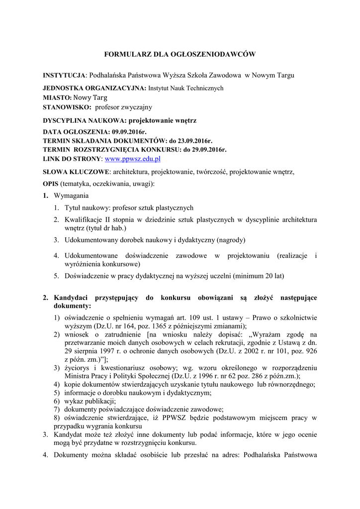 FORMULARZ DLA OGŁOSZENIODAWCÓW INSTYTUCJA: Podhalańska Państwowa Wyższa Szkoła Zawodowa w Nowym Targu JEDNOSTKA ORGANIZACYJNA: Instytut Nauk Technicznych MIASTO: Nowy Targ STANOWISKO: profesor zwyczajny DYSCYPLINA NAUKOWA: projektowanie wnętrz DATA OGŁOSZENIA: 09.09.2016r. TERMIN SKŁADANIA DOKUMENTÓW: do 23.09.2016r. TERMIN ROZSTRZYGNIĘCIA KONKURSU: do 29.09.2016r. LINK DO STRONY: www.ppwsz.edu.pl SŁOWA KLUCZOWE: architektura, projektowanie, twórczość, projektowanie wnętrz, OPIS (tematyka, oczekiwania, uwagi): 1. Wymagania 1. Tytuł naukowy: profesor sztuk plastycznych 2. Kwalifikacje II stopnia w dziedzinie sztuk plastycznych w dyscyplinie architektura wnętrz (tytuł dr hab.) 3. Udokumentowany dorobek naukowy i dydaktyczny (nagrody) 4. Udokumentowane doświadczenie wyróżnienia konkursowe) zawodowe w projektowaniu (realizacje i 5. Doświadczenie w pracy dydaktycznej na wyższej uczelni (minimum 20 lat) 2. Kandydaci przystępujący dokumenty: do konkursu obowiązani są złożyć następujące 1) oświadczenie o spełnieniu wymagań art. 109 ust. 1 ustawy – Prawo o szkolnictwie wyższym (Dz.U. nr 164, poz. 1365 z późniejszymi zmianami); 2) wniosek o zatrudnienie [na wniosku należy dopisać: „Wyrażam zgodę na przetwarzanie moich danych osobowych w celach rekrutacji, zgodnie z Ustawą z dn. 29 sierpnia 1997 r. o ochronie danych osobowych (Dz.U. z 2002 r. nr 101, poz. 926 z późn. zm.)”]; 3) życiorys i kwestionariusz osobowy; wg. wzoru określonego w rozporządzeniu Ministra Pracy i Polityki Społecznej (Dz.U. z 1996 r. nr 62 poz. 286 z późn.zm.); 4) kopie dokumentów stwierdzających uzyskanie tytułu naukowego lub równorzędnego; 5) informacje o dorobku naukowym i dydaktycznym; 6) wykaz publikacji; 7) dokumenty poświadczające doświadczenie zawodowe; 8) oświadczenie stwierdzające, iż PPWSZ będzie podstawowym miejscem pracy w przypadku wygrania konkursu 3. Kandydat może też złożyć inne dokumenty lub podać informacje, które w jego ocenie mogą być przydatne w rozstrzygnięciu konkursu. 4. Dokumenty można składać osobiście lub przesłać na adres: Podhalańska Państwowa Wyższa Szkoła Zawodowa w Nowym Targu, ul. Kokoszków 71, 34-400 Nowy Targ, Dział Kadr PPWSZ w Nowym Targu. 5. Jeżeli zgłoszenie nastąpiło pocztą o terminie zgłoszenia udziału w konkursie rozstrzyga data wpływu zgłoszenia na Uczelnię. 6. Komisja konkursowa zastrzega sobie prawo do przeprowadzenia rozmowy kwalifikacyjnej z kandydatami spełniającymi wymagane kryteria kwalifikacyjne. 7. Zastrzega się możliwość nie zawierania umowy o pracę z osobą, która wygrała konkurs w przypadku braku osiągnięcia poziomu oczekiwanej rekrutacji w roku akademickim 2016/17 8. Zgłoszenia nie spełniające warunków formalnych oraz przekazane po terminie nie będą rozpatrywane 9. Zastrzega się możliwość unieważnienia postępowania konkursowego bez podania przyczyny. Rektor PPWSZ w Nowym Targu
