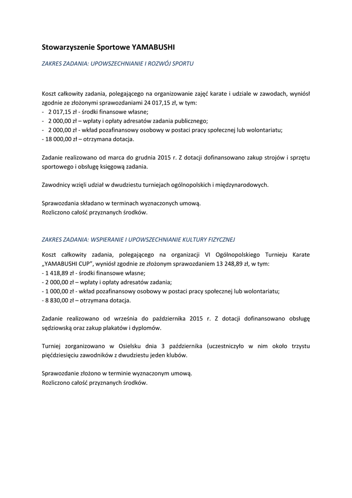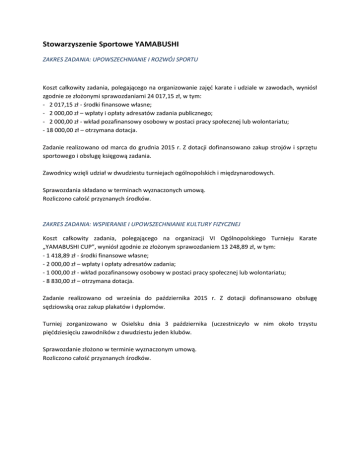 Stowarzyszenie Sportowe YAMABUSHI ZAKRES ZADANIA: UPOWSZECHNIANIE I ROZWÓJ SPORTU Koszt całkowity zadania, polegającego na organizowanie zajęć karate i udziale w zawodach, wyniósł zgodnie ze złożonymi sprawozdaniami 24 017,15 zł, w tym: - 2 017,15 zł - środki finansowe własne; - 2 000,00 zł – wpłaty i opłaty adresatów zadania publicznego; - 2 000,00 zł - wkład pozafinansowy osobowy w postaci pracy społecznej lub wolontariatu; - 18 000,00 zł – otrzymana dotacja. Zadanie realizowano od marca do grudnia 2015 r. Z dotacji dofinansowano zakup strojów i sprzętu sportowego i obsługę księgową zadania. Zawodnicy wzięli udział w dwudziestu turniejach ogólnopolskich i międzynarodowych. Sprawozdania składano w terminach wyznaczonych umową. Rozliczono całość przyznanych środków. ZAKRES ZADANIA: WSPIERANIE I UPOWSZECHNIANIE KULTURY FIZYCZNEJ Koszt całkowity zadania, polegającego na organizacji VI Ogólnopolskiego Turnieju Karate „YAMABUSHI CUP”, wyniósł zgodnie ze złożonym sprawozdaniem 13 248,89 zł, w tym: - 1 418,89 zł - środki finansowe własne; - 2 000,00 zł – wpłaty i opłaty adresatów zadania; - 1 000,00 zł - wkład pozafinansowy osobowy w postaci pracy społecznej lub wolontariatu; - 8 830,00 zł – otrzymana dotacja. Zadanie realizowano od września do października 2015 r. Z dotacji dofinansowano obsługę sędziowską oraz zakup plakatów i dyplomów. Turniej zorganizowano w Osielsku dnia 3 października (uczestniczyło w nim około trzystu pięćdziesięciu zawodników z dwudziestu jeden klubów. Sprawozdanie złożono w terminie wyznaczonym umową. Rozliczono całość przyznanych środków.