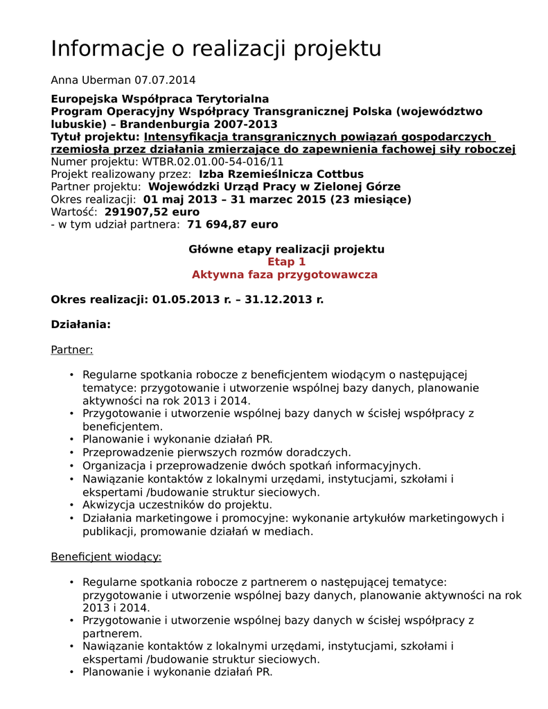 Informacje o realizacji projektu - Wojewódzki Urząd Pracy w Zielonej