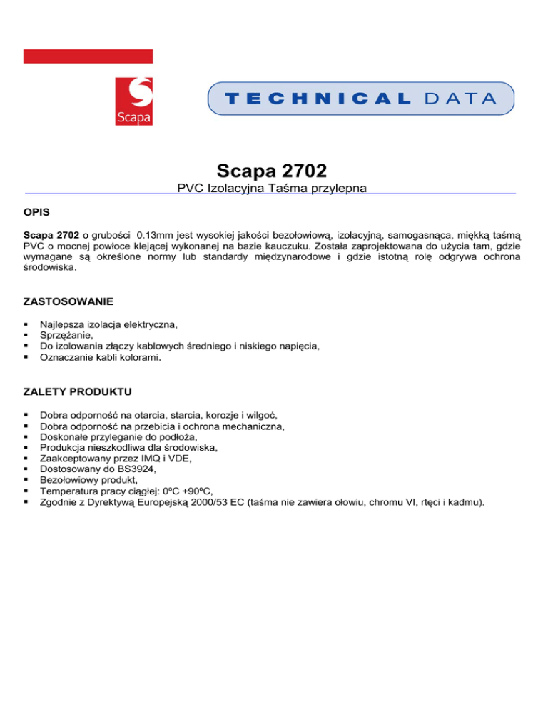 Scapa 2702 PVC Izolacyjna Taśma przylepna OPIS Scapa 2702 o grubości 0.13mm jest wysokiej jakości bezołowiową, izolacyjną, samogasnąca, miękką taśmą PVC o mocnej powłoce klejącej wykonanej na bazie kauczuku. Została zaprojektowana do użycia tam, gdzie wymagane są określone normy lub standardy międzynarodowe i gdzie istotną rolę odgrywa ochrona środowiska. ZASTOSOWANIE § § § § Najlepsza izolacja elektryczna, Sprzężanie, Do izolowania złączy kablowych średniego i niskiego napięcia, Oznaczanie kabli kolorami. ZALETY PRODUKTU § § § § § § § § § Dobra odporność na otarcia, starcia, korozje i wilgoć, Dobra odporność na przebicia i ochrona mechaniczna, Doskonałe przyleganie do podłoża, Produkcja nieszkodliwa dla środowiska, Zaakceptowany przez IMQ i VDE, Dostosowany do BS3924, Bezołowiowy produkt, Temperatura pracy ciągłej: 0ºC +90ºC, Zgodnie z Dyrektywą Europejską 2000/53 EC (taśma nie zawiera ołowiu, chromu VI, rtęci i kadmu). WŁAŚCIWOŚCI TECHNICZNE Metoda testowa CEI EN 60454 CEI EN 60454 CEI EN 60454 Nominalna grubość Siła zerwania Odporność na zerwanie mm N/cm % Wartość nominalna 0,13 25 180 Przyczepność do stali Przylepność do zewnętrznej powierzchni taśmy Odporność na przebicie elektryczne N/cm 1.8 CEI EN 60454 N/cm 1.8 CEI EN 60454 KV/mm > 40 CEI EN 60454 ºC 90 CEI EN 60454 Samogasnąca CEI EN 60454 Jednostka Wykaz temperatur Palność STANDARDOWA PREZENTACJA § § § § § Długość rolki: Szerokość rolki: Rdzen: Opakowanie: Kolory 10, 20, 25 i 33 metry 12, 15, 19 i 25mm 32 mm tekturowy rulon Scapa Owiniety w folię z etykietą Scapa i kodem paskowym Czarny, Niebieski, Brązowy, Zielony, Szary, Czerwony, Żółty, Żółto/Zielony i Biały ZALECENIA Rolki należy przechowywać w pozycji płaskiej w oryginalnym opakowaniu. Należy je chronić od kurzu, ciepła, wilgoci, bezpośrednich promieni słonecznych i oparów chemicznych. Temperatura przechowywania powinna wynosić od +10ºc do +25ºc. . Taśma powinna być nakładana z odpowiednim naprężeniem, aby zapewnić optymalną przylepność i w minimum dwóch warstwach w połowie nachodzących na siebie. Ostatnia warstwa powinna być nałożona z mniejszym naprężeniem, aby zapobiec osłabieniu taśmy i zawijaniu się jej. Powierzchnie, na które nakłada się taśmę, powinny być czyste, suche, pozbawione kurzu, tłuszczu, oleju I innych zanieczyszczeń.