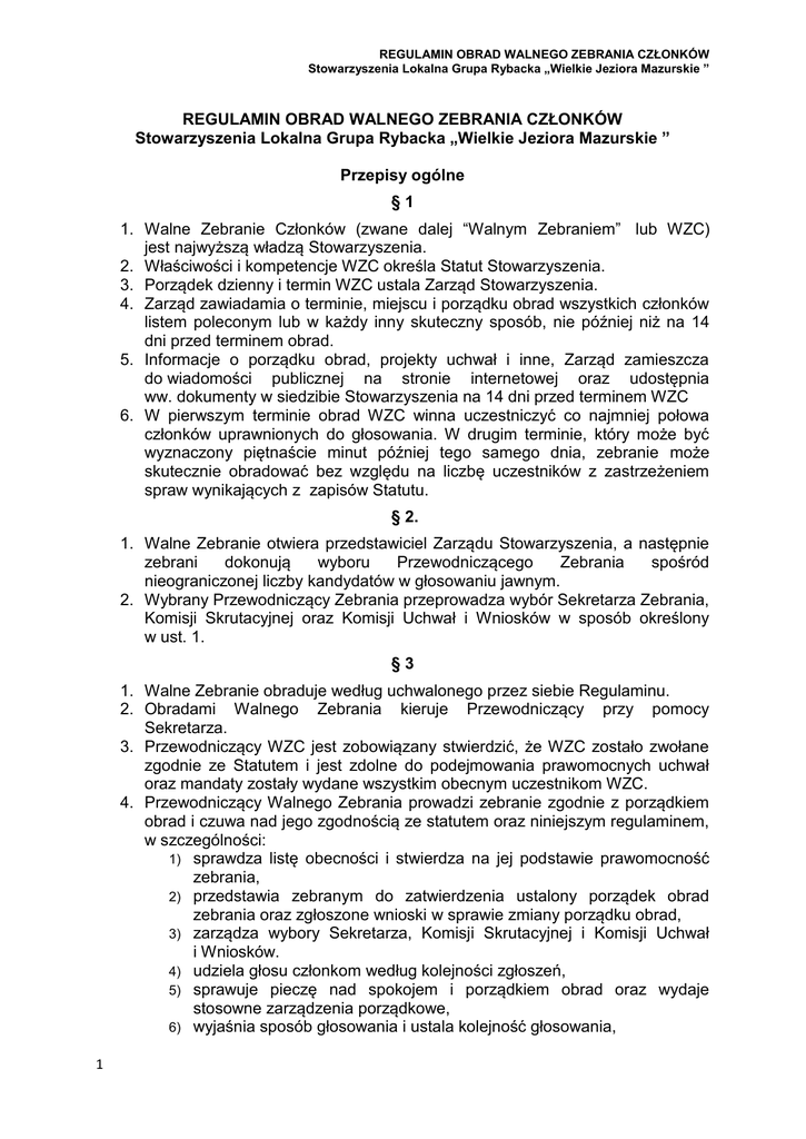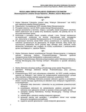 REGULAMIN OBRAD WALNEGO ZEBRANIA CZŁONKÓW Stowarzyszenia Lokalna Grupa Rybacka „Wielkie Jeziora Mazurskie ” REGULAMIN OBRAD WALNEGO ZEBRANIA CZŁONKÓW Stowarzyszenia Lokalna Grupa Rybacka „Wielkie Jeziora Mazurskie ” Przepisy ogólne §1 1. Walne Zebranie Członków (zwane dalej “Walnym Zebraniem” lub WZC) jest najwyższą władzą Stowarzyszenia. 2. Właściwości i kompetencje WZC określa Statut Stowarzyszenia. 3. Porządek dzienny i termin WZC ustala Zarząd Stowarzyszenia. 4. Zarząd zawiadamia o terminie, miejscu i porządku obrad wszystkich członków listem poleconym lub w każdy inny skuteczny sposób, nie później niż na 14 dni przed terminem obrad. 5. Informacje o porządku obrad, projekty uchwał i inne, Zarząd zamieszcza do wiadomości publicznej na stronie internetowej oraz udostępnia ww. dokumenty w siedzibie Stowarzyszenia na 14 dni przed terminem WZC 6. W pierwszym terminie obrad WZC winna uczestniczyć co najmniej połowa członków uprawnionych do głosowania. W drugim terminie, który może być wyznaczony piętnaście minut później tego samego dnia, zebranie może skutecznie obradować bez względu na liczbę uczestników z zastrzeżeniem spraw wynikających z zapisów Statutu. § 2. 1. Walne Zebranie otwiera przedstawiciel Zarządu Stowarzyszenia, a następnie zebrani dokonują wyboru Przewodniczącego Zebrania spośród nieograniczonej liczby kandydatów w głosowaniu jawnym. 2. Wybrany Przewodniczący Zebrania przeprowadza wybór Sekretarza Zebrania, Komisji Skrutacyjnej oraz Komisji Uchwał i Wniosków w sposób określony w ust. 1. §3 1. Walne Zebranie obraduje według uchwalonego przez siebie Regulaminu. 2. Obradami Walnego Zebrania kieruje Przewodniczący przy pomocy Sekretarza. 3. Przewodniczący WZC jest zobowiązany stwierdzić, że WZC zostało zwołane zgodnie ze Statutem i jest zdolne do podejmowania prawomocnych uchwał oraz mandaty zostały wydane wszystkim obecnym uczestnikom WZC. 4. Przewodniczący Walnego Zebrania prowadzi zebranie zgodnie z porządkiem obrad i czuwa nad jego zgodnością ze statutem oraz niniejszym regulaminem, w szczególności: 1) sprawdza listę obecności i stwierdza na jej podstawie prawomocność zebrania, 2) przedstawia zebranym do zatwierdzenia ustalony porządek obrad zebrania oraz zgłoszone wnioski w sprawie zmiany porządku obrad, 3) zarządza wybory Sekretarza, Komisji Skrutacyjnej i Komisji Uchwał i Wniosków. 4) udziela głosu członkom według kolejności zgłoszeń, 5) sprawuje pieczę nad spokojem i porządkiem obrad oraz wydaje stosowne zarządzenia porządkowe, 6) wyjaśnia sposób głosowania i ustala kolejność głosowania, 1 REGULAMIN OBRAD WALNEGO ZEBRANIA CZŁONKÓW Stowarzyszenia Lokalna Grupa Rybacka „Wielkie Jeziora Mazurskie ” podejmuje inne czynności wynikające z Regulaminu Walnego Zebrania, po wyczerpaniu spraw zamieszczonych w porządku obrad ogłasza zamknięcie WZC. 5. Przewodniczący Walnego Zebrania ma prawo i obowiązek: 1) otworzyć i zamknąć każdy kolejny punkt z porządku obrad, 2) zarządzać przerwy w obradach WZC, 3) prowadzić listę zgłoszeń dyskutantów do dyskusji, 4) ustalać maksymalny czas wystąpienia oraz wyjaśnienia, 5) przerwać mówcy i zwrócić mu uwagę, co do czasu, treści i sposobu wypowiadania się, 6) udzielać i odbierać głos każdej z osób reprezentujących członków WZC oraz innym osobom biorącym udział w WZC, odebranie głosu wymaga stosownego uzasadnienia. 7) prosić uczestnika dyskusji o podanie swojego imienia, nazwiska oraz nazwy instytucji/firmy, którą reprezentuje, 8) stawiać wnioski zwykłe i formalne oraz uchwały pod głosowanie, 9) ustalać kolejność głosowania, jeżeli wymaga tego zakres wniosków poddanych głosowaniu, 10) przeprowadzać procedurę głosowania, 11) zwracać uwagę uczestnikom WZC na wszelkie niestosowne zachowania, 12) zgłosić wniosek formalny o wykluczenie uczestnika z obrad WZC, wniosek wymaga stosownego uzasadnienia. 7) 8) §4 1. Wszyscy członkowie stowarzyszenia mają prawo brać udział w WZC, każdy z członków zwyczajnych posiada prawo do jednego głosu. 2. W Walnym Zebraniu biorą udział 1) z głosem stanowiącym – członkowie zwyczajni 2) z głosem doradczym – członkowie honorowi i wspierający oraz osoby zaproszone, 3. Osoby prawne reprezentowane są przez organ uprawniony do reprezentowania albo przez umocowanego pełnomocnika. 4. Osoby, które zamierzają wziąć udział w dyskusji nad określonym punktem porządku zebrania, zgłaszają się kolejno do głosu i zabierają głos w kolejności zgłoszenia, po zamknięciu listy przez Przewodniczącego WZC. §5 1. Z obrad Walnego Zebrania sporządza się protokół, który podpisuje przewodniczący i sekretarz zebrania. Protokół powinien zawierać: datę, porządek obrad, nazwiska przewodniczącego i sekretarza zebrania, krótki opis przebiegu dyskusji, wyniki głosowań, numery i treść podjętych uchwał i załączoną listę obecności członków Stowarzyszenia. 2. Zarząd zobowiązany jest do zamieszczenia na stronie internetowej protokołu z WZC w terminie 14 dni od daty odbycia WZC. 3. Uwagi i wnioski do protokołu członkowie mają prawo wnosić na piśmie w terminie do 14 dni przed kolejnym WZC. 4. Protokół z obrad WZC zatwierdzany jest przez WZC na kolejnym zebraniu. 2 REGULAMIN OBRAD WALNEGO ZEBRANIA CZŁONKÓW Stowarzyszenia Lokalna Grupa Rybacka „Wielkie Jeziora Mazurskie ” Porządek obrad §6 1. Przedmiotem obrad WZC są sprawy objęte porządkiem obrad, przedstawionym przez Zwołującego WZC w trybie określonym w Statucie. 2. Przewodniczący WZC przedstawia porządek obrad do zatwierdzenia przez WZC w głosowaniu jawnym zwykłą większością głosów. 3. WZC może zmienić kolejność punktów oraz wprowadzić dodatkowe punkty do porządku obrad przez podjęcie tej decyzji w głosowaniu jawnym zwykłą większością głosów. 4. Za zgodą wyrażoną zwykłą większością głosów uczestników W