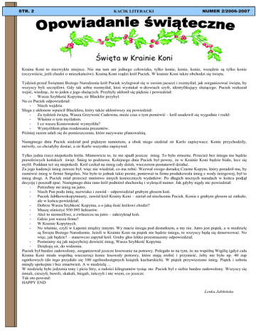 STR. 2 NUMER 2/2006-2007 KACIK LITERACKI Święta w Krainie Koni Kraina Koni to niezwykłe miejsce. Nie ma tam ani jednego człowieka, tylko konie, konie, konie, wszędzie są tylko konie (oczywiście, jeśli chodzi o mieszkańców). Krainą Koni rządzi król Puciek. W krainie Koni także obchodzi się święta. Tydzień przed Świętami Bożego Narodzenia król Puciek wylegiwał się w swoim jacuzzi i rozmyślał, jak zorganizować święta, by wszyscy byli szczęśliwi. Gdy tak sobie rozmyślał, ktoś wystukał w drzwiach szyfr, identyfikujący służącego. Puciek rozkazał wejść, wiedząc, że to jeden z jego służących. Przybyły ukłonił się pięknie i powiedział: Wasza Szybkość Kopytna, sir Blackfer przybył. Na co Puciek odpowiedział: Niech wejdzie. Sługa z ukłonem wpuścił Blackfera, który także ukłoniwszy się powiedział: Za tydzień święta, Wasza Grzywość Cudowna, może czas o tym pomówić – król usadowił się wygodnie i rzekł: Właśnie o tym myślałem. I co wasza Koniowatość wymyśliła? Wymyśliłem plan rozdawania prezentów. Później razem udali się do pomieszczenia, które nazywano planowalnią. Następnego dnia Puciek siedział pod pięknym namiotem, a obok niego siedział sir Karlo zapisywacz. Konie przychodziły, mówiły, co chciałyby dostać, a sir Karlo wszystko zapisywał. Tylko jedna rzecz niepokoiła króla. Mianowicie to, że nie spadł jeszcze śnieg. To było straszne. Przecież bez śniegu nie będzie prawdziwych końskich święt. Śnieg to podstawa. Kolejnego dnia Puciek był pewny, że w Krainie Koni będzie biało, lecz się mylił. Poddani też się niepokoili. Król czekał na śnieg cały dzień, wieczorem postanowił działać. Za jego kadencji śnieg zawsze był, więc nie wiedział, co ma robić. Wezwał swego doradcę Czarne Kopyto, który poradził mu, by zamówić śnieg w firmie Snigolux. Nie było to jednak takie proste, ponieważ ta firma produkowała śnieg z wody śniegowej, był to śnieg drogi. A Puciek miał przecież mnóstwo innych koniecznych wydatków. Po długich nocnych naradach w końcu podjął decyzję i poszedł spać. Następnego dnia rano król podniósł słuchawkę i wykręcił numer. Jak gdyby nigdy nic powiedział: Potrzebny mi śnieg na jutro. Niech Pan poda imię, nazwisko i zawód – odpowiedział grubym głosem koń. Puciek Jabłkowokopytniasty, zawód król Krainy Koni – zarżał od niechcenia Puciek. Konia z grubym głosem aż zatkało, ale w końcu powiedział. Dobrze Wasza Szybkość Kopytna, a o jaką ilość królowi chodzi? Muszę ośnieżyć 950 095 hektarów. Ależ to niemożliwe, a zwłaszcza na jutro – zakrzyknął koń. Gdzie jest wasza firma? W Krainie Kopytnych. No właśnie, czyli w Laponii między innymi. Wy macie śniegu pod dostatkiem, a my nie. Jutro jest piątek, a w niedzielę są Święta Bożego Narodzenia. Jeżeli w Krainie Koni na piątek nie będzie śniegu, to wszyscy będą się denerwować. No więc, jak będzie? – stanowczo zapytał król. Gruby głos lekko przestraszony odpowiedział. Postaramy się jak najszybciej dowieźć śnieg, Wasza Szybkość Kopytna. Dziękuję sir, do widzenia. Puciek był bardzo zadowolony, zorganizował jeszcze losowanie na potrawy. Polegało to na tym, że na wspólną Wigilię (gdyż cała Kraina Koni miała wspólną wieczerzę) konie losowały potrawy, które mają zrobić i przynieść, żeby nie było np. 40 zup ogórkowych (do tego przydało się 100 ogólnodostępnych książek kucharskich). W piątek przywieziono śnieg. Piątek i sobota minęły spokojnie i bez zmartwień. A w niedzielę… W niedzielę było jedzenia tony i picia litry, a radości kilogramów tysiąc sto. Puciek był z siebie bardzo zadowolony. Wszyscy się śmiali, cieszyli, bawili, skakali, biegali, tańczyli i nie wiem, co jeszcze. Tak oto powstał: HAPPY END SZKOLNE WIEŚCI