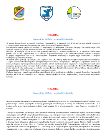 02.03.2013r. Dragon Cup 2013 dla rocznika 2005 i młodsi W sobotę do rywalizacji przystąpili zawodnicy i zawodniczki w kategorii U-8. W turnieju wzięło udział 10 drużyn z całego regionu które zostały rozlosowane na dwie grupy po 5 drużyn w każdej. Po rozegraniu meczy grupowych miejsca 1-2 awansowały do półfinałów. Natomiast drużyny które zajęły miejsca 3-5 w grupie zagrały po jednym meczu o miejsca 5-10 w klasyfikacji końcowej turnieju. Drużyna UKS Dragon Bojano po meczach grupowych (remisy 1:1 z Bałtykiem Gdynia, 1:1 z Jaguarem Gdańsk oraz porażki 0:1 z Arką Gdynia I oraz 0:1 z Błękitni Wejherowo) zdobyła 2 pkt które dało drużynie dopiero V miejsce w grupie. Wygrywając 1:0 z KS Chwaszczynem najmłodsi zawodnicy z Bojana zajęli ostatecznie IX miejsce w klasyfikacji końcowej turnieju. W małym finale spotkały się drużyny Arka Gdynia II oraz UKS Mosty. Mecz zakończył się wynikiem 4:1 dla drużyny z Gdyni. Natomiast finał rozegrał się pomiędzy Jaguarem Gdańsk a Arką Gdynia I. Drużyna z Gdyni która z meczu na mecz „rozkręcała się” rozgromiła drużynę z Gdańska aż 7:0. Był to najwyższa wygrana we wszystkich meczach które rozegrano podczas całego turnieju. Indywidualne nagrody i statuetki powędrowały do: Dawida Wiwatowskiego (Arka Gdynia I) jako najlepszego zawodnika turnieju, Kacpra Jaroń króla strzelców (Arka Gdynia II) oraz Jakuba Leszczyńskiego (UKS Mosty) najlepszego bramkarza turnieju. Puchary, dyplomy i medale oraz słodkie niespodzianki dla wszystkich zawodników wręczali: Bogusław Napieralski Dyrektor GCKSiR w Szemudzie oraz Grzegorz Mierzejewski (Wodomex Bojano) który reprezentował sponsorów turnieju . 03.03.2013r. Dragon Cup 2013 dla rocznika 2004 i młodsi Niedziela przywitała nam piękną słoneczną pogodą. Podobnie jak w sobotę do Szemuda przyjechało 10 drużyn które pełne energii i zapału przystąpiły do meczy grupowych. Podobnie jak w sobotę do półfinałów awansowały 1 i 2 miejsca z obu grup. Natomiast drużyny które zajęły miejsca 3-5 w grupie rozegrało 1 mecz finałowy o miejsca 5-10 turnieju. Z uwagi na wycofanie się drużyny Kadra Pomorza dziewcząt z turnieju trener Paweł Piper zgłosił do turnieju drugą drużynę pod nazwą UKS Dragon Bojano II składającą się z chłopców i dziewczynek rocznika 2005 a nawet 2007. Ku zaskoczeniu wszystkich obecnych drużyna ta spisała się w meczach grupowych bardzo dobrze. Zremisowała 3 mecze grupowe ( 0:0 z Liderem Dębogórze, 1:1 z FC Osowa oraz 1:1 z Arką Gdynia II) i doznała jednej porażki 0:1 z drużyną Huzar Choczewo gdzie samobójczą bramkę stracili w ostatnich sekundach meczu. Zdobyte 3 pkt. pozwoliły zająć IV miejsce w grupie. Mecz o 7 miejsce na turnieju przypadło UKS Dragon Bojano zmierzyć się z drużyną Jaguar Gdańsk które niestety przegrali 2:3. Zawodnicy UKS Dragon Bojano II jako drużyna najmłodsza na turnieju walcząca jak równy z równym strzelająca bramki starszym kolegom została bardzo pozytywnie doceniona przez grono licznie przybyłych kibiców poprzez doping oklaskami. Na długo zapamiętamy radość 5 letniego Oskara Śliwowskiego (najmłodszy zawodnik turnieju) po strzeleniu swojej pierwszej „turniejowej” bramki w życiu czy też Anastazję Krampa (2005) która ambitnie walczyła o każdą piłkę i nie raz wprowadziła zagrożenie w polu karnym przeciwnika. UKS DRAGON BOJANO I w składzie którego mieliśmy zawodników/czki z rocznika 2004 i 2005 mecze grupowe zostały rozegrały zgodnie z założeniami trenera i odnotowali 3 zwycięstwa (2:1 z Koroną Żelistrzewo, 3:0 z KP Sopot i 1:0 z Jaguarem Gdańsk) i 1 remis (0:0 z UKS Mosty). Pozwoliło to wywalczyć 10 pkt co oznaczało zajęcie I miejsca w grupie. W półfinale Bojano spotkało się z Huzarem Choczewo. Mecz został zdominowany przez jednego zawodnika drużyny z Choczewa który dał swojej drużynie wygraną 3:0. Przegrany półfinał odebrał zapał naszym zawodnikom którzy jeszcze na sam koniec pechowo przegrali mały finał z drużyną UKS Lider Dębogórze i ostatecznie zajęli IV miejsce w klasyfikacji końcowej turnieju. Mecz finałowy pomiędzy drużyną UKS Mosty i Huzar Choczewo zakończył się bezbramkowym remisem. O zwycięstwie zdecydowały rzuty karne w których lepsza okazała się drużyna z Mostów. Po meczu finałowym odbyła się ceremonia wręczania pucharów, medali i nagród rzeczowych. Z rąk Sekretarza Gminy Pana Albina Jaroszka oraz Radnego Gminy Jacka Nawrockiego wręczono wszystkich drużynom pamiątkowy puchar, dyplom oraz medale. Natomiast słodki poczęstunek dla każdej z drużyn wręczał przedstawiciel regionalny Detal Concept organizatora sieci Groszek. Statuetki i nagrody indywidualne otrzymali: Mateusz Klejnowski (Dragon Bojano I) który uzyskał miano najlepszego zawodnika turnieju, Szymon Kozielski (UKS Lider Dębogórze) król strzelców oraz Oskar Węsierski (UKS Mosty) jako najlepszy bramkarz całego turnieju. Podczas wręczania nagród organizatorzy turnieju nie zapomnieli o podziękowaniu obecnym na turnieju osobom którzy bezinteresowni wsparli nasz turniej. Podziękowania wręczono Bogusławowi Napieralskiemu, Jackowi Nawrockiemu, Andrzejowi Kowalewskiemu, Mateuszowi Skrzypkowskiemu oraz Rafałowi Kukowskiemu. Doceniono tym małym gestem fakt, że bez pomocy osób na co dzień nie związanych z działalnością klubu rodzicom i Zarządowi UKS Bojano nie udałoby się zorganizować tak dużej imprezy sportowej jaka miała miejsce. W ramach podsumowania całego dwudniowego turnieju kierujemy ogromne podziękowania niżej wymienionym osobom i firmom dzięki którym II edycja Dragon Cup mogła odbyć się: Gmina Szemud, firma KING z Kierzkowa, firma WODOMEX z Bojana, Jacek Nawrocki z Bojana, Rafał Kukowski z Redy, Andrzej Kowalewski z Szemuda , Sebastian Niemczewski z Gdyni, Sklep Spożywczy w Głazicy, Mikołąj Podgórniak z Zina pomorskie, firma Detal Concept organizator sieci francz