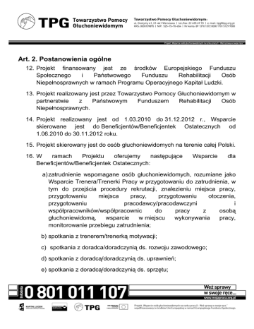 Art. 2. Postanowienia ogólne 12. Projekt finansowany jest ze środków Europejskiego Funduszu Społecznego i Państwowego Funduszu Rehabilitacji Osób Niepełnosprawnych w ramach Programu Operacyjnego Kapitał Ludzki. 13. Projekt realizowany jest przez Towarzystwo Pomocy Głuchoniewidomym w partnerstwie z Państwowym Funduszem Rehabilitacji Osób Niepełnosprawnych. 14. Projekt realizowany jest od 1.03.2010 do 31.12.2012 r., Wsparcie skierowane jest do Beneficjentów/Beneficjentek Ostatecznych od 1.06.2010 do 30.11.2012 roku. 15. Projekt skierowany jest do osób głuchoniewidomych na terenie całej Polski. 16. W ramach Projektu oferujemy następujące Beneficjentów/Beneficjentek Ostatecznych: Wsparcie dla a) zatrudnienie wspomagane osób głuchoniewidomych, rozumiane jako Wsparcie Trenera/Trenerki Pracy w przygotowaniu do zatrudnienia, w tym do przejścia procedury rekrutacji, znalezieniu miejsca pracy, przygotowaniu miejsca pracy, przygotowaniu otoczenia, przygotowaniu pracodawcy/pracodawczyni i współpracowników/współpracownic do pracy z osobą głuchoniewidomą, wsparcie w miejscu wykonywania pracy, monitorowanie przebiegu zatrudnienia; b) spotkania z trenerem/trenerką motywacji; c) spotkania z doradca/doradczynią ds. rozwoju zawodowego; d) spotkania z doradcą/doradczynią ds. uprawnień; e) spotkania z doradcą/doradczynią ds. sprzętu; Strona | 2 f) spotkania z instruktorem/instruktorką rehabilitacji podstawowej; g) wyposażenie w sprzęt niwelujący ograniczenia funkcjonalne; h) diagnoza medyczna (m.in. aktualnego stanu wzroku i słuchu, badania lekarza/lekarki medycyny pracy); i) szkolenia zawodowe; j) warsztaty aktywizacji zawodowej; k) finansowanie szkoleń zewnętrznych; l) Wsparcie towarzyszące – usługi tłumaczy-przewodników/tłumaczekprzewodniczek; m) Wsparcie migowego. towarzyszące – usługi tłumaczy/tłumaczek języka 17. Wsparcie indywidualne – to wsparcie, o którym mowa w punkcie. 5 lit. a) – f). 18. W ramach Projektu oferujemy następujące Wsparcie dla najbliższego otoczenia Beneficjenta Ostatecznego/Beneficjentki Ostatecznej Projektu: a) rodzina i opiekunowie wsparcie indywidualne ze specjalistami/specjalistkami wymienione w punkcie 5 lit. a) do f), spotkania informacyjne; b) otoczenie wspierające aktywizację społeczno-zawodową: szkolenia trenerów pracy. 19. Wsparcie w ramach Projektu jest bezpłatne. 20. Beneficjentom/Beneficjentkom Ostatecznym Projektu przysługuje zwrot kosztów podróży jedynie przy korzystaniu ze Wsparcia wymienionego w punkcie 5 lit. b) – f) i h). Strona | 3 21. Wsparcie w ramach Projektu ma charakter indywidualnych programów dostosowanych do potrzeb i możliwości Beneficjentów/Beneficjentek Ostatecznych. 22. Osoby, które otrzymały określone wsparcie w projekcie pilotażowym „Wsparcie osób głuchoniewidomych na rynku pracy", nie mogą w niniejszym Projekcie otrzymać takiego samego wsparcia, z zastrzeżeniem art. 6 pkt. 2 23. Wsparcie może odbywać się w domu Beneficjenta Ostatecznego/Beneficjentki Ostatecznej lub innym wskazanym przez niego/nią miejscu, bądź też w miejscu wskazanym przez Towarzystwo Pomocy Głuchoniewidomym. 24. Wszystkie osoby biorące udział w projekcie mają obowiązek brania udziału w ewaluacji Projektu, w szczególności zaś do wypełniania ankiet. 25. Osoba głuchoniewidoma przestaje być Beneficjentem Ostatecznym/Beneficjentką Ostateczną Projektu w momencie gdy: a) kończy udział w Projekcie; zrealizował/a indywidualny program dostosowany do jej potrzeb i możliwości; b) przerywa udział w projekcie poprzez złożenie pisma informującego o chęci wycofania się z Projektu; c) utraci status osoby niepełnosprawnej, za wyjątkiem przypadku, w którym złożyła wniosek o wydanie kolejnego orzeczenia i otrzymała je. Strona | 4