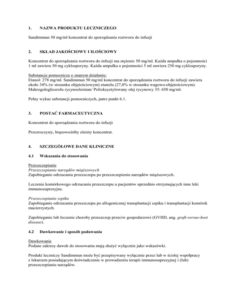 1. NAZWA PRODUKTU LECZNICZEGO Sandimmun 50 mg/ml koncentrat do sporządzania roztworu do infuzji 2. SKŁAD JAKOŚCIOWY I ILOŚCIOWY Koncentrat do sporządzania roztworu do infuzji ma stężenie 50 mg/ml. Każda ampułka o pojemności 1 ml zawiera 50 mg cyklosporyny. Każda ampułka o pojemności 5 ml zawiera 250 mg cyklosporyny. Substancje pomocnicze o znanym działaniu: Etanol: 278 mg/ml. Sandimmun 50 mg/ml koncentrat do sporządzania roztworu do infuzji zawiera około 34% (w stosunku objętościowym) etanolu (27,8% w stosunku wagowo-objętościowym). Makrogologlicerolu rycynooleinian/ Polioksyetylowany olej rycynowy 35: 650 mg/ml. Pełny wykaz substancji pomocniczych, patrz punkt 6.1. 3. POSTAĆ FARMACEUTYCZNA Koncentrat do sporządzania roztworu do infuzji Przezroczysty, brązowożółty oleisty koncentrat. 4. SZCZEGÓŁOWE DANE KLINICZNE 4.1 Wskazania do stosowania Przeszczepianie Przeszczepianie narządów miąższowych Zapobieganie odrzucaniu przeszczepu po przeszczepieniu narządów miąższowych. Leczenie komórkowego odrzucania przeszczepu u pacjentów uprzednio otrzymujących inne leki immunosupresyjne. Przeszczepianie szpiku Zapobieganie odrzucaniu przeszczepu po allogenicznej transplantacji szpiku i transplantacji komórek macierzystych. Zapobieganie lub leczenie choroby przeszczep przeciw gospodarzowi (GVHD, ang. graft-versus-host disease). 4.2 Dawkowanie i sposób podawania Dawkowanie Podane zakresy dawek do stosowania mają służyć wyłącznie jako wskazówki. Produkt leczniczy Sandimmun może być przepisywany wyłącznie przez lub w ścisłej współpracy z lekarzem posiadającym doświadczenie w prowadzeniu terapii immunosupresyjnej i (lub) przeszczepianiu narządów. Przeszczepianie Przeszczepianie narządów miąższowych W przypadku zastosowania produktu leczniczego Sandimmun koncentrat do sporządzania roztworu do infuzji zalecana dawka wynosi około jednej trzeciej odpowiadającej jej dawki doustnej produktu leczniczego Sandimmun i zaleca się, by pacjenci przechodzili na leczenie doustne tak szybko, jak to możliwe. Leczenie produktem leczniczym Sandimmun w postaci doustnej lub Sandimmun Neoral w postaci doustnej należy rozpocząć dawką od 10 do 15 mg/kg mc. podaną w 2 dawkach podzielonych. Należy ją podać w ciągu 12 godzin przed transplantacją. Dawka ta powinna być stosowana przez 1 do 2 tygodni po operacji jako dawka dobowa i powinna ona być stopniowo zmniejszana, odpowiednio do stężenia cyklosporyny we krwi, aż do osiągnięcia zalecanej dawki podtrzymującej wynoszącej około 2 do 6 mg/kg mc. na dobę podawanej w 2 dawkach podzielonych. Jeżeli produkt leczniczy Sandimmun w postaci doustnej lub Sandimmun Neoral w postaci doustnej jest podawany razem z innymi lekami immunosupresyjnymi (np. z kortykosteroidami lub jako składnik leczenia trzema lub czterema produktami leczniczymi), mogą być stosowane mniejsze dawki (np. 3 do 6 mg/kg mc. na dobę w początkowym okresie leczenia, podawane w 2 dawkach podzielonych). Przeszczepianie szpiku Pierwszą dawkę należy podać w dniu poprzedzającym transplantację. W większości przypadków zaleca się zastosowanie w tym celu produktu leczniczego Sandimmun w postaci koncentratu do sporządzania roztworu do infuzji. Zalecana dawka wynosi 3 do 5 mg/kg mc. na dobę. Tę dawkę podaje się w infuzjach dożylnych w czasie do 2 tygodni bezpośrednio po transplantacji, a następnie zaleca się doustne leczenie podtrzymujące produktem leczniczym Sandimmun w postaci doustnej lub Sandimmun Neoral w postaci doustnej w dawce około 12,5 mg/kg mc. na dobę, podawanej w 2 dawkach podzielonych. Leczenie podtrzymujące należy kontynuować przez co najmniej 3 miesiące (i najlepiej przez 6 miesięcy), następnie należy stopniowo zmniejszać dawkę aż do odstawienia produktu w rok po transplantacji. Jeżeli produkt leczniczy Sandimmun w postaci doustnej lub Sandimmun Neoral w postaci doustnej jest podawany od początku leczenia, to zaleca się dawkę od 12,5 do 15 mg/kg mc. na dobę, podawaną w 2 dawkach podzielonych, zaczynając od dnia poprzedzającego transplantację. Stosowanie większych dawek produktu leczniczego Sandimmun w postaci doustnej lub Sandimmun Neoral w postaci doustnej lub dożylne podanie produktu leczniczego Sandimmun może być konieczne w przypadku zaburzeń żołądka i jelit, które mogą zmniejszyć wchłanianie. U niektórych pacjentów, po przerwaniu podawania cyklosporyny może wystąpić choroba przeszczep przeciw gospodarzowi (GVHD), jednak zwykle ustępuje ona po ponownym podaniu cyklosporyny. W takich przypadkach należy podać początkowo doustną dawkę uderzeniową wynoszącą 10 do 12,5 mg/kg mc., a następnie codziennie podawać doustną dawkę podtrzymującą w wysokości, która wcześniej dawała zadowalające wyniki. W leczeniu łagodnej, przewlekłej GVHD należy stosować małe dawki produktu leczniczego Sandimmun. Szczególne populacje pacjentów Pacjenci z zaburzeniami czynności nerek Wszystkie wskazania Cyklosporyna jest w stopniu minimalnym wydalana przez nerki, a zaburzenia czynności nerek nie mają dużego wpływu na jej farmakokinetykę (patrz punkt 5.2). Jednak ze względu na możliwe działania nefrotoksyczne (patrz punkt 4.8), zaleca się uważne monitorowanie czynności nerek (patrz punkt 4.4). 2 Pacjenci z zaburzeniami czynności wątroby Cyklosporyna jest intensywnie metabolizowana przez wątrobę. U pacjentów z zaburzeniami czynności wątroby może wystąpić około 2 do 3-krotne zwiększenie ekspozycji na cyklosporynę. Może zajść konieczność zmniejszenia dawki leku u pacjentów z ciężkimi zaburzeniami czynności wątroby, aby utrzymać stężenia leku we krwi w zalecanym zakresie wartości docelowych (patrz punkty 4.4 i 5.2) i zaleca się monitorowanie stężeń cyklosporyny we krwi aż do ich stabilizacji. Dzieci i młodzież W badaniach klinicznych uczestniczyły dzieci w wieku od 1. roku życia. W kilku badaniach u dzieci i młodzieży było 