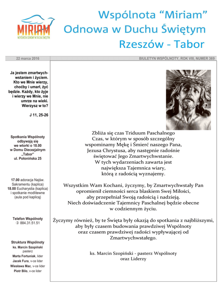 22 marca 2016 BIULETYN WSPÓLNOTY, ROK VIII, NUMER 369 Ja jestem zmartwychwstaniem i życiem. Kto we Mnie wierzy, choćby i umarł, żyć będzie. Każdy, kto żyje i wierzy we Mnie, nie umrze na wieki. Wierzysz w to? J 11, 25-26 Spotkania Wspólnoty odbywają się we wtorki o 18.00 w Domu Diecezjalnym „Tabor” ul. Połonińska 25 17.00 adoracja Najśw. Sakramentu (kaplica) 18.00 Eucharystia (kaplica) i spotkanie modlitewne (aula pod kaplicą) Telefon Wspólnoty 884.31.51.51 Struktura Wspólnoty ks. Marcin Szopiński pasterz Marta Fortuniak, lider Jacek Fura, v-ce lider Wiesława Mac, v-ce lider Piotr Bilo, v-ce lider Zbliża się czas Triduum Paschalnego Czas, w którym w sposób szczególny wspominamy Mękę i Śmierć naszego Pana, Jezusa Chrystusa, aby następnie radośnie świętować Jego Zmartwychwstanie. W tych wydarzeniach zawarta jest największa Tajemnica wiary, którą z radością wyznajemy. Wszystkim Wam Kochani, życzymy, by Zmartwychwstały Pan opromienił ciemności serca blaskiem Swej Miłości, aby przepełniał Swoją radością i nadzieją. Niech doświadczenie Tajemnicy Paschalnej będzie obecne w codziennym życiu. Życzymy również, by te Święta były okazją do spotkania z najbliższymi, aby były czasem budowania prawdziwej Wspólnoty oraz czasem prawdziwej radości wypływającej od Zmartwychwstałego. ks. Marcin Szopiński - pasterz Wspólnoty oraz Liderzy Animatorzy diakonii Alicja Smalarz diakonia adoracyjna Marta Fortuniak diakonia prorocka Jacek Fura diakonia modlitwy wstawienniczej i uwolnienia Marta Fortuniak diakonia nauczania Jolanta Skotnicka diakonia uwielbienia Ewa Kruczek diakonia miłosierdzia Wiesława Mac diakonia organizacyjna Paweł Wiśniowski diakonia technicznoporządkowa Klaudia Winiarska diakonia medialna Maria Bassara diakonia modlitwy osłonowej Paweł Kobosz diakonia modlitwy w nagłych potrzebach Maria Hubert diakonia modlitwy za kapłanów Marek Wiśniewski diakonia liturgiczna Piotr Bilo diakonia ewangelizacyjna Maciej Mierzejewski diakonia prowadzenia spotkań Słowo Boże do medytacji śr. – Mt 26, 14-25 Zdrada Judasza czw. – J 13, 1-15 Do końca ich umiłował pt .– J 18, 1-19, 42 Męka naszego Pana Jezusa Chrystusa według świętego Jana. niedz. – J 20, 1-9 Apostołowie przy grobie Zmartwychwstałego pn. – Mt 28, 8-15 Chrystus zmartwychwstały ukazuje się niewiastom wt. – J 20, 11-18 Ukazanie się Zmartwychwstałego Marii Magdalenie Intencje do modlitwy W intencji Ojca Świętego Franciszka o światło Ducha Świętego i siły fizyczne potrzebne do prowadzenia Kościoła, o zdrowie i błogosławieństwo Boże dla Benedykta XVI i ks. bpa Jana Wątroby. W intencji wszystkich kapłanów posługujących w Odnowie w naszej Diecezji. O moc Ducha Świętego i światłe oczy serca. O rozwój naprotechnologii w Rzeszowie. O błogosławieństwo Boże i ochronę przed działaniem złych duchów dla ks. Marcina w jego posłudze egzorcysty i modlitwy uwolnienia, oraz dla posługujących członków Wspólnoty, ich rodzin i bliskich. O rozpalenie charyzmatów we Wspólnocie, o jedność, chęć służby i ochronę przed zniechęceniem. W intencji małżeństw przeżywających kryzysy. O dobre owoce ewangelizacji prowadzonej przez Wspólnotę i Fundację Charismata (katechezy audiowizualne, portal Żywa Wiara, Wieczory Charyzmatyczne, Światowe Dni Młodzieży, Seminarium Odnowy Wiary). We wszystkich intencjach powierzanych modlitwom naszej Wspólnoty. Ogłoszenia 1. 6 kwietnia rozpoczyna się Seminarium Wiary II stopnia. Są to rekolekcje zamknięte wyłącznie dla członków Wspólnoty Miriam. Miejsce DD Tabor. Zgłoszenia do 30 marca 2016 poprzez formularz na stronie www.miriam.rzeszow.pl. 2. 29 marca 2016 r. odbędzie się spotkanie animatorów Seminarium Wiary (do każdego animatora zostanie wysłany e-mail z informacją). 3. Dla osób chętnych na przekazanie 1% podatku na dzieła ewangelizacyjne przygotowaliśmy ulotki informacyjne Fundacji Charismata. Modlitwy wstawiennicze odbywają się we wtorki o 17.15 – zgłoszenia przez stronę www.miriam.rzeszow.pl Redaktor biuletynu: Edyta Fortuniak Biuletyn przeznaczony jest wyłącznie do użytku wewnętrznego telefon Wspólnoty i pogotowie modlitewne: 884.31.51.51 e-mail: [email protected] www.miriam.rzeszow.pl www.facebook.com/miriam.rzeszow Jeśli chcesz przekazać darowiznę, ofiarę lub dziesięcinę możesz to zrobić na rzecz Fundacji, która działa przy naszej Wspólnocie Fundacja „Charismata” im. św. Pawła Apostoła, ul. Osmeckiego 9/1, 35-506 Rzeszów Bank Spółdzielczy w Jarosławiu oddział Rzeszów, nr konta: 91 9096 0004 2012 0064 7957 0002 W tytule przelewu należy wpisać: „Na cele statutowe” Fundacja Charismata jest organizacją OPP – przekaż nam 1% swojego podatku - KRS 0000431262