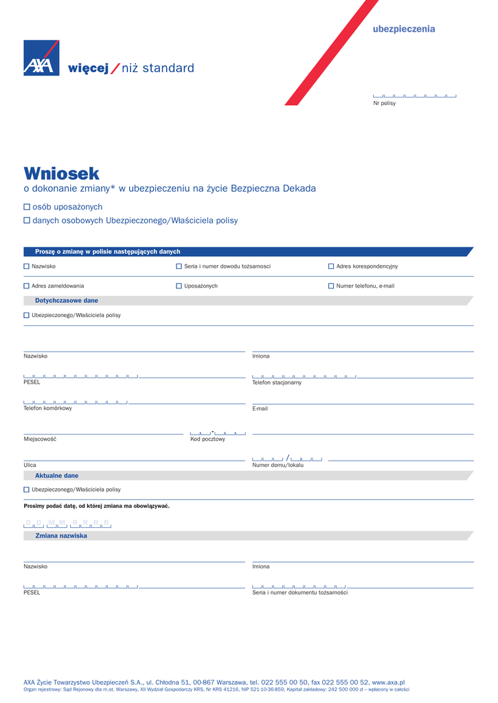 ubezpieczenia Nr polisy Wniosek o dokonanie zmiany* w ubezpieczeniu na życie Bezpieczna Dekada osób uposażonych danych osobowych Ubezpieczonego/Właściciela polisy Proszę o zmianę w polisie następujących danych Nazwisko Seria i numer dowodu tożsamosci Adres korespondencyjny Adres zameldowania Uposażonych Numer telefonu, e-mail Dotychczasowe dane Ubezpieczonego/Właściciela polisy Nazwisko Imiona PESEL Telefon stacjonarny Telefon komórkowy E-mail Miejscowość Ulica Kod pocztowy Numer domu/lokalu Aktualne dane Ubezpieczonego/Właściciela polisy Prosimy podać datę, od której zmiana ma obowiązywać. D D M M R R R R Zmiana nazwiska Nazwisko Imiona PESEL Seria i numer dokumentu tożsamości AXA Życie Towarzystwo Ubezpieczeń S.A., ul. Chłodna 51, 00-867 Warszawa, tel. 022 555 00 50, fax 022 555 00 52, www.axa.pl Organ rejestrowy: Sąd Rejonowy dla m.st. Warszawy, XII Wydział Gospodarczy KRS, Nr KRS 41216, NIP 521-10-36-859, Kapitał zakładowy: 242 500 000 zł – wpłacony w całości Zmiana adresu korespondencyjnego Kod pocztowy Miejscowość Telefon stacjonarny Numer domu/lokalu Ulica Zmiana adresu zameldowania Kod pocztowy Miejscowość Telefon stacjonarny Numer domu/lokalu Ulica Zmiana numeru telefonu i adresu e-mail Telefon stacjonarny Telefon komórkowy E-mail Zmiana osób uposażonych Unieważniam wszystkie moje poprzednie dyspozycje dotyczące Uposażonych i jednocześnie wyznaczam jako Uposażonych następujące osoby: Aktualne dane Uposażonych % 1. Nazwisko, imię PESEL Udział procentowy w świadczeniu** 2. Nazwisko, imię PESEL Udział procentowy w świadczeniu** 3. Nazwisko, imię PESEL Udział procentowy w świadczeniu** 4. Nazwisko, imię PESEL Udział procentowy w świadczeniu** 5. Nazwisko, imię PESEL Udział procentowy w świadczeniu** % % % % Prosimy podać datę, od której zmiana ma obowiązywać. D D M M R R R R Podpis Ubezpieczonego/Właściciela polisy * Prosimy zaznaczyć odpowiednie pole. ** Suma udziałów procentowych w świadczeniu powinna łącznie wynosić 100%; prosimy o podanie wysokości udziałów w pełnych procentach. 0611009 Uwaga! podpisany wniosek należy przesłać na adres: AXA Życie Towarzystwo Ubezpieczeń S.A., ul. Chłodna 51, 00-867 Warszawa