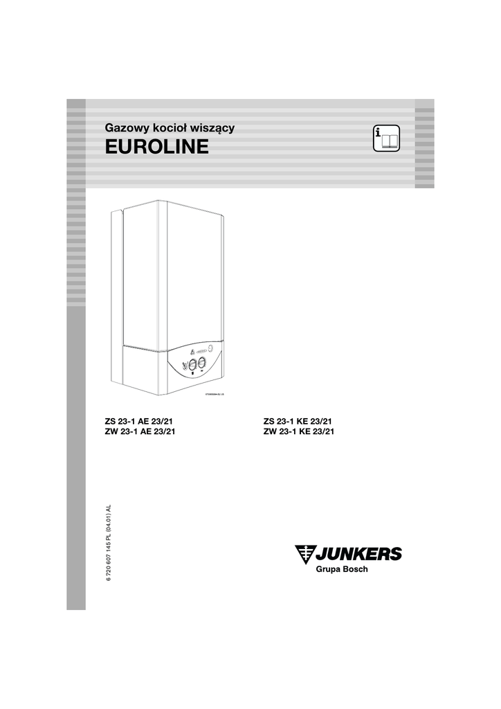 Gazowy kocioł wiszący EUROLINE 6 720 607 145 PL (04.01) AL ZS 23-1 AE 23/21 ZW 23-1 AE 23/21 ZS 23-1 KE 23/21 ZW 23-1 KE 23/21 Spis treści Spis treści Wskazówki dotyczące bezpieczeństwa 3 Objaśnienia symboli 3 1 4 Elementy obsługi 2 2.1 2.2 2.3 2.4 Uruchomienie 5 Przed uruchomieniem 5 Włączanie i wyłączanie kotła 6 Włączenie ogrzewania 6 Regulacja c.o. za pomocą regulatora temperatury w pomieszczeniu 6 2.5 Kotły typu ZS z zasobnikiem: nastawa temperatury c.w.u. 7 2.6 Kotły typu ZW bez zasobnika: nastawa temperatury c.w.u. 7 2.7 Praca w okresie letnim (tylko c.w.u.) 7 2.8 Ochrona przeciw zamarzaniu 7 2.9 Zabezpieczenie przed zablokowaniem się pompy 8 2.10 Diagnozowanie usterek 8 3 3.1 3.2 3.3 3.4 Wskazówki ogólne Usterki Kontrola działania Czyszczenie obudowy kotła Oszczędność energii 4 Dane urządzenia 10 5 Krótka instrukcja obsługi 11 2 8 8 8 8 9 6 720 607 145 Wskazówki dotyczące bezpieczeństwa Wskazówki dotyczące bezpieczeństwa Powietrze do spalania (w pomieszczeniu) B Aby uniknąć korozji: powietrze w pomieszczeniu nie powinno zawierać materiałów agresywnych np. zawierających związki chloru i fluoru. Jeśli poczujesz zapach gazu: B Zamknij zawór gazu. B Otwórz okna. B Nie przełączaj żadnych przełączników. Objaśnienia symboli Wskazówki dotyczące bezpieczeństwa będą oznaczone w tekście trójkątem ostrzegawczym i szarym polem. B Zgaś otwarte płomienie. B Natychmiast wezwij pogotowie gazowe. Jeśli poczujesz spaliny: B Wyłącz urządzenie (patrz str. 6). B Otwórz okna i drzwi. Słowa wytłuszczone oznaczają możliwe niebezpieczeństwo, jeśli nie będzie się przestrzegało odpowiednich zaleceń. B Powiadom autoryzowany serwis. Montaż, zmiany B Montaż kotła zlecać uprawnionemu instalatorowi. wyłącznie B Nie zmieniać elementów odprowadzających spaliny. B Nie zasłaniać i nie zmniejszać otworów wentylacyjnych w drzwiach, oknach i ścianach. W przypadku montażu szczelnych okien należy zagwarantować dopływ powietrza do spalania. • Uwaga oznacza, że może nastąpić lekkie uszkodzenie instalacji. • Ostrzeżenie oznacza, że może pojawić się niewielkie zagrożenie dla personelu, lub duże uszkodzenie instalacji. • Niebezpieczeństwo oznacza, że może pojawić się duże zagrożenie dla personelu, w szczególnych przypadkach może być zagrożone życie. Konserwacja B Zaleca się wykonywanie okresowych konserwacji, co najmniej raz w roku. Producent oferuje specjalną umowę serwisową, która szczegółowo opisana jest w książce gwarancyjnej. B Użytkownik jest odpowiedzialny za bezpieczeństwo urządzenia i instalacji. B Stosować zamienne! tylko oryginalne części i Wskazówki w tekście będą oznaczone znajdującym się obok symbolem. Będą one ograniczone poziomymi liniami nad i pod tekstem. Wskazówki zawierają ważne informacje w przypadkach, gdy nie istnieje niebezpieczeństwo dla ludzi i sprzętu. Materiały wybuchowe i łatwopalne B Nie wolno składować ani używać w pobliżu urządzenia materiałów łatwopalnych (papier, rozpuszczalniki, farby, itp.). 6 720 607 145 3 Elementy obsługi 1 Elementy obsługi przód tył Rys. 1 8 8.1 38 43 44 45 46 47 61 97 135 136 170 172 173 4 Manometr Sygnalizacja temperatury, rodzaju usterki i funkcji roboczych Zawór do uzupełniania wody w obiegu c.o. Zasilanie c.o. Wylot c.w.u. Przyłącze gazu Przyłącze wody zimnej Powrót z obiegu c.o. Przycisk kasujący Regulator temperatury c.w.u. Wyłącznik główny Regulator temperatury zasilania c.o. Zawory odcinające c.o. Zawór gazowy Zawór odcinający dopływ zimnej wody 6 720 607 145 Uruchomienie 2 Uruchomienie Kontrola ciśnienia c.o. 2.1 Przed uruchomieniem Wskazówka manometrze (8.1) powinna wskazywać wartość 1 do 2 bar. Otworzyć zawór gazowy (172) B Uchwyt przekręcić w lewo do oporu (uchwyt ustawiony w kierunku przepływu = zawór otwarty). Zawory odcinające c.o. B Otworzyć zawór tak aby nacięcie skierowane było w kierunku przepływu. Nacięcie skierowane poprzecznie do kierunku przepływu = zawór zamknięty. Urządzenia typu ZW Woda zimna (173) B Otworzyć zawór tak aby nacięcie skierowane było w kierunku przepływu. Nacięcie skierowane poprzecznie do kierunku przepływu = zawór zamknięty. i Pracownik serwisu poinformuje Pańswa, jeśli konieczna będzie zmiana tej wartości. Ciśnienie maksymalne wynoszące 3 bar nie może zostać przekroczone nawet po osiągnięciu przez wodę c.o. najwyższych wartości temperatury (otwierany jest zawór bezpieczeństwa). B Jeżeli wskazówka (przy zimnej instalacji) wskazuje wartość niższą od 1 bar: napełniać instalację wodą do momentu, aż wskazówka pokaże wartość między 1 i 2 bar. Rys. 3 Rys. 2 6 720 607 145 5 Uruchomienie 2.2 Włączanie i wyłączanie kotła Włączenie wskazuje aktualną temperature zasilania c.o. B Wyłącznik główny ustawić w pozycji I. Wskażnik temperatury wskazuje temperaturę zasilania c.o. Rys. 5 2.4 Rys. 4 Regulacja c.o. za pomocą regulatora temperatury w pomieszczeniu Wyłączenie B Wyłącznik główny ustawić w pozycji 0. 2.3 B W regulatorze temperatury (TR...) ustawić ządaną temperaturę pomieszczenia. Włączenie ogrzewania Wartość temperatury zasilania c.o. można ustawić w zakresie od 45 do 90 ˚C. Regulator dopasowuje w sposób ciągły moc pracy palnika do aktualnego zapotrzebowania. B Obracając pokrętło dopasować temperaturę zasilania c.o. do potrzeb instalacji (zakres regulacji 45 do 90 ˚C). Jeżeli palnik pracuje, pali sie dioda sygnalizująca pracę palnika. Termometr Rys. 6 6 6 720 607 145 Uruchomienie 2.5 Kotły typu ZS z zasobnikiem: nastawa temperatury c.w.u. Ostrzeżenie: Niebezpieczeństwo poparzenia! B W normalnej eksploatacji nie ustawiać temperatury wyższej niż 60 ˚C. B Wartości do 70 ˚C można ustawiać tylko na krótki okres czasu (dezynfekcja termiczna). Pozycja pokrętła Temperatura c.w.u. do oporu w lewo ok. 10˚C (zabezpieczenie przed zamarzaniem). do