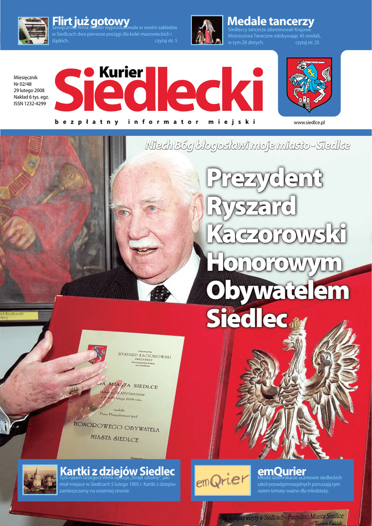 Flirt już gotowy Szwajcarska firma Stadler wyprodukowała w swoim zakładzie w Siedlcach dwa pierwsze pociągi dla kolei mazowieckich i śląskich. czytaj str. 5 Miesięcznik Nr 02/48 29 lutego 2008 Nakład 6 tys. egz. ISSN 1232-4299 Medale tancerzy Siedleccy tancerze zdominowali Krajowe Mistrzostwa Taneczne zdobywając 45 medali, w tym 28 złotych. czytaj str. 25 Kurier b e z p ł a t n y i n f o r m a t o r m i e j s k i www.siedlce.pl Niech Bóg błogosławi moje miasto - Siedlce Prezydent Ryszard Kaczorowski Honorowym Obywatelem Siedlec Kartki z dziejów Siedlec Tym razem Grzegorz Welik opisuje „Strajk szkolny”, jaki miał miejsce w Siedlcach 5 lutego 1905 r. Kartki z dziejów zamieszczamy na ostatniej stronie. www.siedlce.pl emQurier Młodzi dziennikarze uczniowie siedleckich szkół ponadgimnazjalnych poruszają tym razem tematy ważne dla młodzieży. Kurier Siedlecki Luty 2008 1 Prezydent Ryszard Kaczorowski w Siedlcach Fot. Dariusz Dybciak 2 Luty 2008 Kurier Siedlecki Styczeń 2008 www.siedlce.pl Aktualności R Ryszard Kaczorowski Honorowym Obywatelem Miasta Siedlce yszard Kaczorowski urodził się 26 listopada 1919 roku w Białymstoku, w rodzinie Wacława i Jadwigi z Sawickich. Miał siostrę Felicję Katarzynę i brata Andrzeja. Edukację rozpoczął w Szkole Podstawowej nr 11. Druh Ryszard Kaczorowski w 1933 roku złożył przyrzeczenie harcerskie. Harcerstwo stało się jego pasją. Prowadził drużyny, uczestniczył w obozach letnich. W 1934 roku podjął naukę w Szkole Handlowej. Miał też wiele okazji do wzmacniania postawy patriotycznej. Przyszły Prezydent Rzeczypospolitej w 1939 roku podjął służbę w pogotowiu harcerskim, był współzałożycielem białostockiej organizacji Szarych Szeregów i komendantem chorągwi. Aresztowany przez NKWD w lipcu 1940 roku, został skazany na karę śmierci, zamienioną na 10 lat łagrów. Wywieziony na Kołymę odzyskał wolność po podpisaniu układu Sikorski-Majski, następnie dotarł do armii generała Władysława Andersa. Jako łącznościowiec brał udział w walce pod Monte Cassino. Po demobilizacji Ryszard Kaczorowski pozostał w Londynie. Tam skończył studia i poświęcił się harcerstwu. Od 1955 roku piastował godność Naczelnika Harcerzy, a od 1976 roku Przewodniczącego Związku Harcerstwa Polskiego poza granicami kraju. W 1988 roku Ryszard Kaczorowski został ministrem do spraw krajowych w rządzie Kazimierza Sabbata, a 19 lipca 1989 roku objął urząd Prezydenta II Rzeczypospolitej na Uchodźstwie. Ostatni Prezydent RP na uchodźstwie Ryszard Kaczorowski otrzymał tytuł Honorowego Obywatela Miasta Siedlce. Uchwałę w tej sprawie jednogłośnie podjęła 26 lutego, podczas uroczystej sesji w obecności samego dostojnego gościa Rada Miasta Siedlce. „To zaszczytne wyróżnienie przyjmuję z wdzięcznością, jako wyraz uznania dla wszystkich Polaków, którzy po II wojny światowej pozostali poza krajem na znak protestu przeciwko traktatom jałtańskim wikłającym Polskę w zależność od ZSRR” – powiedział odbierając tytuł prezydent Kaczorowski. „Niech Bóg błogosławi moje miasto” – zakończył swoje wystąpienie Honorowy Obywatel Siedlec. Prezydent Miasta Siedlce Wojciech Kudelski podkreślił, że obecność prezydenta Ryszarda Kaczorowskiego w naszym mieście należy odbierać jako hołd wszystkim żołnierzom podziemia, którzy walczyli i oddawali swoje życie za wolną Polskę. Podczas całodniowej wizyty w Siedlcach, która rozpoczęła się od zapalenia zniczy pod pomnikiem Ojca Świętego Jana Pawła II, prezydentowi Ryszardowi Kaczorowskiemu towarzyszyli małżonka – Karolina Kaczorowska, o. Eustachy Rakoczy, rektor Akademii Polonijnej w Częstochowie, senator Piotr Andrzejewski, dyrektor Gabinetu Prezydenta Jan Tarczyński oraz prezes Europejskiego Centrum Młodzieży i Rozwoju Demokracji Lokalnej Gniewomir Rokosz-Kuczyński. Inicjatorem wizyty www.siedlce.pl prezydenta Kaczorowskiego w Siedlcach był Zastępca Dyrektora Generalnego Służby Więziennej gen. Paweł Nasiłowski. W uroczystej Sesji Rady Miasta uczestniczyli również m.in. księża biskupi Zbigniew Kiernikowski i Jan Mazur, poseł Krzysztof Tchórzewski. Po sesji prezydent Ryszard Kaczorowski, w towarzystwie władz miasta Siedlce prezydenta miasta Wojciecha Kudelskiego, przewodniczącego Rady Miasta Mariusza Dobijańskiego i gen. Pawła Nasiłowskiego złożył wiązanki kwiatów pod pomnikiem 5. i 6. Wileńskiej Brygady AK. Pod pomnikiem odebrał również wartę od siedleckich harcerzy. W sali I Liceum Ogólnokształcącego im. Bolesława Prusa odbyło się spotkanie z młodzieżą, przedstawicielami duchowieństwa, biznesu i samorządowcami podczas którego prezydent mówił o funkcjonowaniu rządu na uchodźstwie. Prezydent Ryszard Kaczorowski był również gościem Zakładu Karnego i Instytutu im. Kofoeda. W programie wizyty znalazły się również wizyta w Muzeum Diecezjalnym i Katedrze Siedleckiej. Po miesiącach intensywnej działalności, 22 grudnia 1990 roku, przekazał na Zamku Królewskim w Warszawie insygnia władzy prezydenckiej Lechowi Wałęsie. Także po roku 1990, Ryszard Kaczorowski brał i nadal bierze aktywny udział w życiu publicznym Ojczyzny. Spotyka się z Polakami w kraju i zagranicą. Jest obywatelem honorowym 19 polskich miast, w tym od 26 lutego 2008 roku - Siedlec. Piastuje liczne funkcje honorowe, cieszy się powszechnym szacunkiem i uznaniem ogromnej rzeszy rodaków. W 2007 roku Prezydent Ryszard Kaczorowski objął Patronat Honorowy nad obchodami Jubileuszu 460-lecia Nadania Praw Miejskich Siedlcom. Kurier Siedlecki Luty 2008 3 Aktualności W SKRÓCIE Nowe radiowozy dla siedleckiej policji Boisko przy SP nr 4 Do końca sierpnia zostanie przebudowane boisko przy Szkole Podstawowej nr 4 w Siedlcach. 6 marca została podpisana umowa na realizację zadania z firmą ZAWAR z Warszawy. Wartość inwestycji opiewa na sumę blisko 719,5 tys. złotych. W ramach zadania wykonane zo