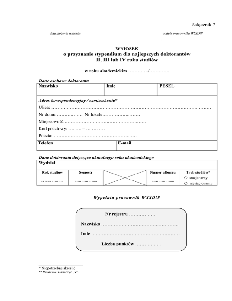 Załącznik 7 data złożenia wniosku podpis pra cownika WSSDiP ………………………… ………………………………… WNIOSEK o przyznanie stypendium dla najlepszych doktorantów II, III lub IV roku studiów w roku akademickim …………./…………. Dane osobowe doktoranta Nazwisko Imię PESEL Adres korespondencyjny / zamieszkania* Ulica: ………………………………………………………………………………….……… Nr domu:……….……. Nr lokalu:……………..……. Miejscowość:……………………….……………….…… Kod pocztowy: …. …. – … …. …. Poczta: …………………………………………..…. Telefon E-mail Dane doktoranta dotyczące aktualnego roku akademickiego Wydział Rok studiów Semestr Numer albumu ……………….. ……………….. ……………….. Wypełnia pracownik WSSDiP Nr rejestru ……………… Nazwisko ……………………………….………….. Imię ………………………………………………… Liczba punktów …………….. ___________________ * Niepotrzebne skreślić. ** Właściwe zaznaczyć „x”. Tryb studiów* o stacjonarny o niestacjonarny 1. Średnia ocen (max 20 pkt) Wypełnia pracownik sekretariatu studiów doktoranckich Zaświadcza się, że średnia ocen doktoranta …………………………………………………………………………… Imię i nazwisko doktoranta z egzaminów objętych programem studiów doktoranckich za poprzedni rok akademicki wynosi: …………………. . …………………………………………………… Data, pieczątka i podpis pracownika sekretariatu Oświadczenie doktoranta Zgodnie z art. 199 ust. 5 pkt 3 ustawy – Prawo o szkolnictwie wyższym, oświadczam, że w roku akademickim …….………/………….… uzyskałem(am) dobre i bardzo dobre wyniki z egzaminów objętych programem studiów doktoranckich. …………………………………….. Miejscowość i data …………………………………….. Podpis doktoranta Wypełnia Rektorska Komisja Stypendialna Punkty za średnią ocen: …………..….. 2 /20 pkt 1. Lp. Postępy w pracy naukowej (max 36 pkt) A Czynny udział w konferencji, sympozjum, seminarium: opracowanie i wygłoszenie referatu lub/i opublikowanie artykułu w wydawnictwie pokonferencyjnym W JĘZYKU POLSKIM 1. Temat konferencji / sympozjum / seminarium Tytuł referatu/artykułu Data, nazwa i miejsce przedsięwzięcia / wydania druku zwartego Dokument potwierdzający osiągnięcie 2. Wypełnia Rektorska Komisja Stypendialna Numer załącznika ……………… .…………………………. pkt 3 pkt Tytuł referatu/artykułu Temat konferencji lub seminarium naukowego Data i miejsce wygłoszenia referatu Dokument potwierdzający osiągnięcie 3. Numer załącznika Wypełnia Rektorska Komisja Stypendialna ……………… .…………………………. pkt 3 pkt Temat konferencji / sympozjum / seminarium Tytuł referatu/artykułu Data, nazwa i miejsce przedsięwzięcia / wydania druku zwartego Dokument potwierdzający osiągnięcie 4. Wypełnia Rektorska Komisja Stypendialna Numer załącznika ……………… .…………………………. pkt 3 pkt Tytuł referatu/artykułu Temat konferencji lub seminarium naukowego Data i miejsce wygłoszenia referatu Dokument potwierdzający osiągnięcie Numer załącznika Wypełnia Rektorska Komisja Stypendialna ……………… 3 .…………………………. pkt 3 pkt Lp. B Czynny udział w konferencji, sympozjum, seminarium: opracowanie i wygłoszenie referatu lub/i opublikowanie artykułu w wydawnictwie pokonferencyjnym W JĘZYKU KONGRESOWYM 1. Temat konferencji / sympozjum / seminarium Tytuł referatu / artykułu Data, nazwa i miejsce przedsięwzięcia / wydania druku zwartego Dokument potwierdzający osiągnięcie 2. Wypełnia Rektorska Komisja Stypendialna Numer załącznika ……………… .…………………………. pkt 6 pkt Tytuł referatu/artykułu Temat konferencji lub seminarium naukowego Data i miejsce wygłoszenia referatu Dokument potwierdzający osiągnięcie Numer załącznika Wypełnia Rektorska Komisja Stypendialna ……………… .…………………………. pkt 6 pkt Łączna liczba punktów (z części A i B) …………..….. 4 /12 pkt Lp. C PUBLIKACJE ARTYKUŁÓW (o objętości min. 0,5 arkusza wydawniczego) W: CZASOPISMACH RECENZOWANYCH, MONOGRAFIACH W JĘZYKU POLSKIM 1. Tytuł czasopisma / monografii Tytuł artykułu Nazwa wydawnictwa Data i miejsce wydania czasopisma / monografii Dokument potwierdzający osiągnięcie, tj. ksero okładki i spisu treści 2. Wypełnia Rektorska Komisja Stypendialna Numer załącznika ……………… .…………………………. pkt 4 pkt Tytuł czasopisma / monografii Tytuł artykułu Nazwa wydawnictwa Data i miejsce wydania czasopisma / monografii Dokument potwierdzający osiągnięcie, tj. ksero okładki i spisu treści 3. Numer załącznika Wypełnia Rektorska Komisja Stypendialna ……………… .…………………………. pkt 4 pkt Tytuł czasopisma / monografii Tytuł artykułu Nazwa wydawnictwa Data i miejsce wydania czasopisma / monografii Dokument potwierdzający osiągnięcie, tj. ksero okładki i spisu treści Wypełnia Rektorska Komisja Stypendialna Numer załącznika ……………… 5 .…………………………. pkt 4 pkt Lp. D PUBLIKACJE ARTYKUŁÓW (o objętości min. 0,5 arkusza wydawniczego) W: CZASOPISMACH RECENZOWANYCH, MONOGRAFIACH W JĘZYKU OBCYM 1. Tytuł czasopisma / monografii Tytuł artykułu Nazwa wydawnictwa Data i miejsce wydania czasopisma / monografii Dokument potwierdzający osiągnięcie, tj. ksero okładki i spisu treści 2. Wypełnia Rektorska Komisja Stypendialna Numer załącznika ……………… .…………………………. pkt 6 pkt Tytuł czasopisma / monografii Tytuł artykułu Nazwa wydawnictwa Data i miejsce wydania czasopism