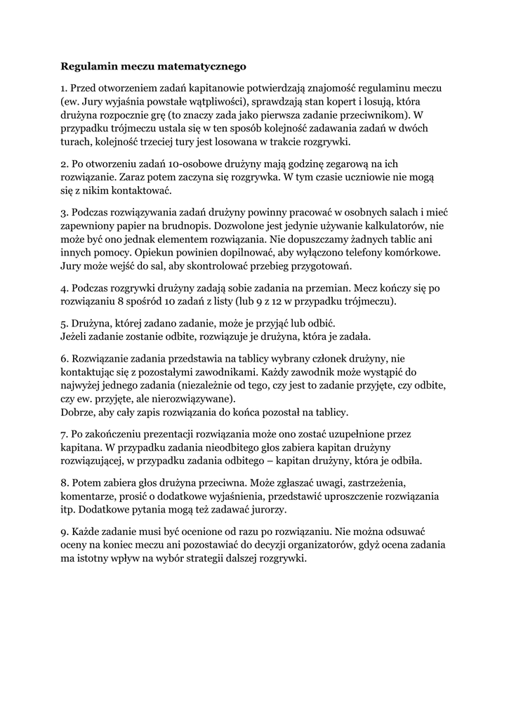 Regulamin meczu matematycznego 1. Przed otworzeniem zadań kapitanowie potwierdzają znajomość regulaminu meczu (ew. Jury wyjaśnia powstałe wątpliwości), sprawdzają stan kopert i losują, która drużyna rozpocznie grę (to znaczy zada jako pierwsza zadanie przeciwnikom). W przypadku trójmeczu ustala się w ten sposób kolejność zadawania zadań w dwóch turach, kolejność trzeciej tury jest losowana w trakcie rozgrywki. 2. Po otworzeniu zadań 10-osobowe drużyny mają godzinę zegarową na ich rozwiązanie. Zaraz potem zaczyna się rozgrywka. W tym czasie uczniowie nie mogą się z nikim kontaktować. 3. Podczas rozwiązywania zadań drużyny powinny pracować w osobnych salach i mieć zapewniony papier na brudnopis. Dozwolone jest jedynie używanie kalkulatorów, nie może być ono jednak elementem rozwiązania. Nie dopuszczamy żadnych tablic ani innych pomocy. Opiekun powinien dopilnować, aby wyłączono telefony komórkowe. Jury może wejść do sal, aby skontrolować przebieg przygotowań. 4. Podczas rozgrywki drużyny zadają sobie zadania na przemian. Mecz kończy się po rozwiązaniu 8 spośród 10 zadań z listy (lub 9 z 12 w przypadku trójmeczu). 5. Drużyna, której zadano zadanie, może je przyjąć lub odbić. Jeżeli zadanie zostanie odbite, rozwiązuje je drużyna, która je zadała. 6. Rozwiązanie zadania przedstawia na tablicy wybrany członek drużyny, nie kontaktując się z pozostałymi zawodnikami. Każdy zawodnik może wystąpić do najwyżej jednego zadania (niezależnie od tego, czy jest to zadanie przyjęte, czy odbite, czy ew. przyjęte, ale nierozwiązywane). Dobrze, aby cały zapis rozwiązania do końca pozostał na tablicy. 7. Po zakończeniu prezentacji rozwiązania może ono zostać uzupełnione przez kapitana. W przypadku zadania nieodbitego głos zabiera kapitan drużyny rozwiązującej, w przypadku zadania odbitego – kapitan drużyny, która je odbiła. 8. Potem zabiera głos drużyna przeciwna. Może zgłaszać uwagi, zastrzeżenia, komentarze, prosić o dodatkowe wyjaśnienia, przedstawić uproszczenie rozwiązania itp. Dodatkowe pytania mogą też zadawać jurorzy. 9. Każde zadanie musi być ocenione od razu po rozwiązaniu. Nie można odsuwać oceny na koniec meczu ani pozostawiać do decyzji organizatorów, gdyż ocena zadania ma istotny wpływ na wybór strategii dalszej rozgrywki. 10. CO PODLEGA OCENIE. Oceniane jest rozumowanie prowadzące do wyniku, a nie podanie prawidłowego wyniku (za sam wynik można przyznać 0-2 pkt.). Punkty odejmuje się za wszystkie luki w rozumowaniu. Oceniana jest nie tylko formalna poprawność, ale i sposób rozwiązania. Jeśli jest ono żmudne, zawiłe, „na palcach” i daje się istotnie uprościć - stanowi to podstawę do odjęcia 1-2 pkt. 10 punktów można przyznać tylko za zadanie rozwiązane bez żadnych usterek. 11. OCENA. Po zakończeniu dyskusji jurorzy oceniają tylko oryginalne rozwiązanie (tzn. nie biorąc pod uwagę komentarzy kapitana) w skali 0-10 (liczbami całkowitymi!). Jury podaje uzasadnienie oceny, wskazując błędy, za które odjęto poszczególne punkty. Zadanie uznane za nierozwiązane może być ocenione w skali 05, a uznane za rozwiązane - w skali 6-10. 12. PRZEJĘCIE. W przypadku nieodbitego zadania rozwiązanego (ocenianego 6-10), jeśli drużyna przeciwna zgłosiła w swoich uwagach te zastrzeżenia, za które później Jury odjęło co najmniej 2 punkty - przejmuje 2 punkty na swoje konto, za wytknięte błędy, których Jury nie uznało za istotne dla oceny rozwiązania, nie ma przejęcia punktów). Podobnie, jeśli przeciwnik wskaże istotnie krótszy lub łatwiejszy sposób rozwiązania (co stanowi podstawę do odjęcia 1-2 pkt.), jeśli odjęto 2 punkty, mogą one przejść na jego konto. Jeśli usterki wskazał wcześniej kapitan drużyny rozwiązującej zadanie, zabiera przeciwnikom możliwość przejęcia punktów „za uwagi”. 13. PUNKTACJA: Drużyna, która rozwiązywała zadanie podane przez przeciwników, otrzymuje tyle punktów, ile wynosiła ocena jej rozwiązania (punktacja 0-10). W przypadku zadania odbitego liczba punktów przyznanych za rozwiązanie obliczana jest wg wzoru n = 2p – 10, gdzie p jest oceną zadania podaną przez Jury (czyli ostatecznie zadanie punktowane jest w skali od -10 do 10). 14. Podczas meczu Jury może przyznać zawodnikowi „żółtą kartkę” za niesportowe zachowanie (np. niestosowne uwagi pod adresem przeciwnika). Po dwukrotnym otrzymaniu żółtej kartki zawodnik zostaje natychmiast wykluczony z drużyny. 15. Po zakończeniu meczu Jury może przedstawić szkice rozwiązań zadań, których nie umieli zrobić zawodnicy. Można też wybrać i nagrodzić autora najlepszej prezentacji zadania. 16. Dalsze szczegółowe ustalenia dotyczące przebiegu meczu są w gestii Jury. Wzorowany na regulaminie Dolnośląskich Meczów Matematycznych