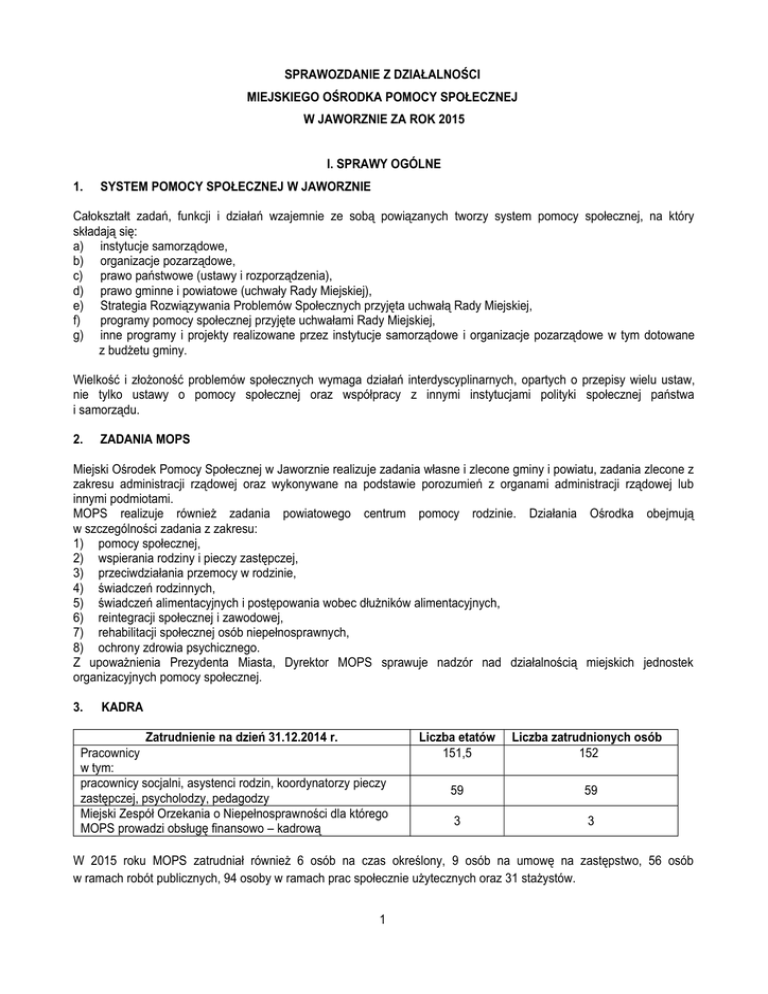 SPRAWOZDANIE Z DZIAŁALNOŚCI MIEJSKIEGO OŚRODKA POMOCY SPOŁECZNEJ W JAWORZNIE ZA ROK 2015 I. SPRAWY OGÓLNE 1. SYSTEM POMOCY SPOŁECZNEJ W JAWORZNIE Całokształt zadań, funkcji i działań wzajemnie ze sobą powiązanych tworzy system pomocy społecznej, na który składają się: a) instytucje samorządowe, b) organizacje pozarządowe, c) prawo państwowe (ustawy i rozporządzenia), d) prawo gminne i powiatowe (uchwały Rady Miejskiej), e) Strategia Rozwiązywania Problemów Społecznych przyjęta uchwałą Rady Miejskiej, f) programy pomocy społecznej przyjęte uchwałami Rady Miejskiej, g) inne programy i projekty realizowane przez instytucje samorządowe i organizacje pozarządowe w tym dotowane 1111z budżetu gminy. Wielkość i złożoność problemów społecznych wymaga działań interdyscyplinarnych, opartych o przepisy wielu ustaw, nie tylko ustawy o pomocy społecznej oraz współpracy z innymi instytucjami polityki społecznej państwa i samorządu. 2. ZADANIA MOPS Miejski Ośrodek Pomocy Społecznej w Jaworznie realizuje zadania własne i zlecone gminy i powiatu, zadania zlecone z zakresu administracji rządowej oraz wykonywane na podstawie porozumień z organami administracji rządowej lub innymi podmiotami. MOPS realizuje również zadania powiatowego centrum pomocy rodzinie. Działania Ośrodka obejmują w szczególności zadania z zakresu: 1) pomocy społecznej, 2) wspierania rodziny i pieczy zastępczej, 3) przeciwdziałania przemocy w rodzinie, 4) świadczeń rodzinnych, 5) świadczeń alimentacyjnych i postępowania wobec dłużników alimentacyjnych, 6) reintegracji społecznej i zawodowej, 7) rehabilitacji społecznej osób niepełnosprawnych, 8) ochrony zdrowia psychicznego. Z upoważnienia Prezydenta Miasta, Dyrektor MOPS sprawuje nadzór nad działalnością miejskich jednostek organizacyjnych pomocy społecznej. 3. KADRA Zatrudnienie na dzień 31.12.2014 r. Pracownicy w tym: pracownicy socjalni, asystenci rodzin, koordynatorzy pieczy zastępczej, psycholodzy, pedagodzy Miejski Zespół Orzekania o Niepełnosprawności dla którego MOPS prowadzi obsługę finansowo – kadrową Liczba etatów 151,5 Liczba zatrudnionych osób 152 59 59 3 3 W 2015 roku MOPS zatrudniał również 6 osób na czas określony, 9 osób na umowę na zastępstwo, 56 osób w ramach robót publicznych, 94 osoby w ramach prac społecznie użytecznych oraz 31 stażystów. 1 4. WYDATKI Źródło finansowania Wydatki ogółem, z tego: Wydatki z budżetu gminy Wydatki z budżetu państwa Wydatki w ramach projektów z udziałem środków unijnych Wydatki ze środków funduszu PFRON Wykonanie 38 820 147,52 zł 10 982 728,94 zł 25 243 395,04 zł 552 216,01 zł 2 041 807,53 zł Udział w % 100,00 28,29 65,03 1,42 5,26 Zrealizowane dochody: 465 108,10 zł 5. OGÓLNA LICZBA OSÓB LUB RODZIN KORZYSTAJĄCYCH ZE ŚWIADCZEŃ MOPS W 2015 r. z wszystkich świadczeń MOPS korzystało 15 544 osób lub rodzin. Niektóre osoby lub rodziny korzystały kilkakrotnie z tego samego rodzaju świadczenia lub z różnych świadczeń. 6. OGÓLNA LICZBA DECYZJI ADMINISTRACYJNYCH W 2015 r. Dyrektor MOPS oraz na jego wniosek inni pracownicy MOPS upoważnieni przez Prezydenta Miasta wydali łącznie 21 380 decyzji administracyjnych. 7. SZKOLENIA RODZAJ SZKOLENIA LICZBA PRACOWNIKÓW z zakresu pomocy społecznej z zakresu przeciwdziałania bezrobociu i wykluczeniu społecznemu z zakresu prawa pracy i finansów z zakresu świadczeń rodzinnych i alimentacyjnych z zakresu pieczy zastępczej z zakresu „Niebieskiej Karty” z zakresu „Karty Dużej Rodziny” 7. Lp. 1. 36 10 19 10 15 46 3 INFRASTRUKTURA LOKALOWA MOPS Nazwa komórek organizacyjnych Siedziba główna: - Dział Administracyjny - Dział Finansowy - Zespół Pracy Socjalnej Nr 1 (pracownicy socjalni) - Dział Reintegracji Społecznej i Zawodowej - Dział Domów Pomocy Społecznej i Usług Opiekuńczych - Dział Świadczeń Społecznych - Dział Świadczeń Alimentacyjnych - Dział Świadczeń Rodzinnych - Dział Rehabilitacji Społecznej Osób Niepełnosprawnych Adres ul. Północna 9b Zespół Pracy Socjalnej Nr 2 (pracownicy socjalni) 2. 3. Zespół Asysty Rodzinnej ul. Grunwaldzka 235 Dział Strategii i Projektów Społecznych w tym: - obsługa Karty Dużej Rodziny Zespół Pracy Socjalnej Nr 3 (pracownicy socjalni) 2 ul. Kolbego 20 Dział Pieczy Zastępczej (koordynatorzy pieczy i pracownicy socjalni) 4. Dział Świadczeń Pieczy Zastępczej ul. Inwalidów Wojennych 14 Informatycy Dział ds. Bezdomności w tym: - Dom Noclegowy dla Bezdomnych Mężczyzn ul. Łukasiewicza 6 6. - Dom Noclegowy dla Bezdomnych Kobiet ul. Ks. Mroczka 49 7. Miejski Zespół ds. Orzekania o Niepełnosprawności ul. Łukasiewicza 7 8. Dział Pracy Socjalnej Nr 4 (pracownicy socjalni) ul. Jagiellońska 9 5. II. ŚWIADCZENIA Z POMOCY SPOŁECZNEJ 1. RODZAJE ŚWIADCZEŃ PIENIĘŻNYCH Rodzaj świadczenia 1 514 311 462 X X 371 411 9 Liczba rodzin 972 308 449 X X 360 410 9 Koszt świadczeń 840 942,00 zł 139 614,00 zł 575 712,00 zł 514 890,00 zł 60 822,00 zł 1 426 576,00 zł 145 765,00 zł 26 384,00 zł 302 178 222 377,00 zł 162 (219 decyzji) 161 17 120,00 zł Liczba osób Zasiłki celowe i pomoc w naturze w tym: zasiłki celowe specjalne Zasiłki okresowe w tym: kwota gwarantowana (budżet Wojewody) kwota własna (budżet Gminy) Zasiłki stałe Składki na ubezpieczenia zdrowotne Usługi pogrzebowe Posiłki w szkołach i przedszkolach w ramach realizacji programu wieloletniego „Pomoc państwa w zakresie dożywiania” Decyzje potwierdzające prawo do korzystania ze świadczeń zdrowotnych (ustawa z dnia 27 sierpnia 2004 r. o świadczeniach zdrowotnych finansowanych ze środków publicznych) 2. LICZBA OSÓB I RODZIN OBJĘTYCH ŚWIADCZENIAMI Liczba osób, którym Rodzaj świadczenia przyznano decyzją świadczenie Świadczenia przyznane w ramach zadań zleconych i zadań własnych (bez względu na ich rodzaj, formę, liczbę oraz źródło finansowania) – 2 041 bez świadczeń 