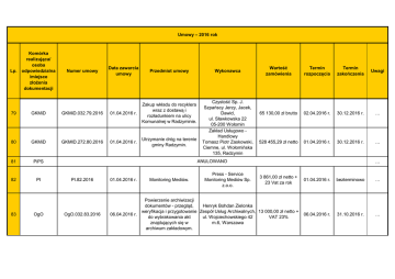 Umowy – 2016 rok Lp. Komórka realizująca/ osoba odpowiedzialna /miejsce złożenia dokumentacji Numer umowy Data zawarcia umowy Przedmiot umowy 79 GKMiD GKMiD.032.79.2016 01.04.2016 r. Zakup wkładu do recyklera wraz z dostawą i rozładunkiem na ulicy Komunalnej w Radzyminie. 80 GKMiD GKMID.272.80.2016 01.04.2016 r. Utrzymanie dróg na terenie gminy Radzymin. 81 PiPS 82 PI 83 OgO Wykonawca Czystość Sp. J. Szpańscy Jerzy, Jacek, Dawid, ul. Sławkowska 22 05-200 Wołomin Zakład Usługowo Handlowy Tomasz Piotr Zaskowski, Ciemne, ul. Wołomińska 135, Radzymin Wartość zamówienia Termin rozpoczęcia Termin zakończenia Uwagi 65 130,00 zł brutto 02.04.2016 r. 30.12.2016 r. … 528 455,29 zł netto 01.04.2016 r. 30.12.2016 r. … … ANULOWANO PI.82.2016 OgO.032.83.2016 01.04.2016 r. 06.04.2016 r. Press - Service Monitoring Mediów Sp. z.o.o. 3 861,00 zł netto + 23 Vat za rok 01.04.2016 r. bezterminowo … Powierzenie archiwizacji dokumentów - przegląd, Henryk Bohdan Zielonka weryfikacja i przygotowanie Zespół Usług Archiwalnych, 13 000,00 zł netto + do wybrakowania akt ul. Wojciechowskiego 42 VAT 23% znajdujących się w m.6, Warszawa archiwum zakładowym. 06.04.2016 r. 31.10.2016 r. … Monitoring Mediów. 84 85 86 Gzeas Gzeas PiPS Gzeas.032.84.2016 Realizacja zadania publicznego - zapewnienie dzieciom w wieku Przedszkole Niepubliczne przedszkolnym Calineczka 05.04.2016 r. zamieszkałym na terenie Aleja Jana Pawła II 64 gminy Radzymin możliwości Radzymin korzystania z wychowania przedszkolnego. 1,00 zł za godzinę za czas powyżej 5 godzin 05.04.2016 r. 31.08.2016 r. … Gzeas.032.85.2016 Realizacja zadania publicznego - zapewnienie dzieciom w wieku Przedszkole Niepubliczne przedszkolnym 05.04.2016 r. Wyspa Malucha, ul. Nowa zamieszkałym na terenie 76 b, Radzymin gminy Radzymin możliwości korzystania z wychowania przedszkolnego. 1,00 zł za godzinę za czas powyżej 5 godzin 05.04.2016 r. 31.08.2016 r. … 2 500,00 zł 02.05.2016 r. 10.06.2016 r. … 5 700,00 zł 11.04.2016 r. 29.04.2016 r. Fundusz Sołecki 3 051,00 zł 11.04.2016 r. 06.05.2016 r. Fundusz Sołecki 5 km x 0,8358 zł/ 1dzień 11.04.2016 r. 30.06.2016 r. … PiPS.524.86.2016 11.04.2016 r. Realizacja zadania publicznego w zakresie edukacji, oświaty i wychowania. 87 IN IN.032.87.2016 11.04.2016 r. Wykonanie boiska do piłki nożnej w starym Dybowie. 88 IN IN.032.88.2016 11.04.2016 r. Wykonanie boiska do siatkówki plażowej w Starym Dybowie. 89 PIPS PiPS.032.89.2016 11.04.2016 r. Dowóz dziecka niepełnosprawnego do placówki oświatowej. Fundacja Kamyk w Nowych Załubicach Czystość Sp. J. Szpańscy Jerzy, Jacek, Dawid, ul. Sławkowska 22 05-200 Wołomin Czystość Sp. J. Szpańscy Jerzy, Jacek, Dawid, ul. Sławkowska 22 05-200 Wołomin Dane wrażliwe. 90 91 92 93 GKMiD IN IN IN Remont odwodnienia 13.04.2016 r. korpusu drogowego, ul. Diamentowej w Radzyminie. Zakład Usługowo Handlowy Tomasz Piotr Zaskowski, Ciemne, ul. Wołomińska 135, Radzymin 12.04.2016 Wykonanie dokumentacji, kosztorysów i specyfikacji technicznych dla inwestycji: "Modernizacja chodnika w ul. Broniewskiego w Radzyminie. LINUM - Grzegorz Zlot ul. Obrońców Traktu 27 lok. 4 Warszawa 12.04.2016 r. Wykonanie PFU na modernizację budynku administratora w parku Eleonory Czartoryskiej w Radzyminie pod przeznaczenie usługowe. Arch - Eko Projekt Jolanta Kotowska, ul. H. Kołłątaja 15/17 Białystok IN.032.93.2016 12.04.2016 r. Opracowanie dokumentacji do wniosku o dofinansowanie w ramach działania 5.3 dziedzictwo kulturowe PRO WM 20142020. GKMiD.032.90.2016 IN.032.91.2016 IN.032.92.2016 Gemicon Sp. z.o.o. ul. Berlinga 36/37 Białystok 94 AB AB.524.94.2016 Realizacja zadania publicznego z zakresu Fundacja "Bezpieczny przeciwdziałania Przedszkolak, Bezpieczny 13.04.2016 r. uzależnieniom i patologiom Uczeń", ul. Flisaków 46 społecznym pt. "Bezpieczny Warszawa przedszkolak". 95 TiM TiM.032.95.2016 14.04.2016 r. Zakup i dostarczenie przedłużenia licencji wraz ze wsparciem technicznym. NBIT Sp. z.o.o. ul. Metalowców 13A Chorzów 17 220,00 zł brutto 13.04.2016 r. 28.04.2016 r. … 1320,00 zł brutto 12.04.2016 r. 1 miesiąc od dnia podpisania umowy … 14 760,00 zł brutto 12.04.2016 r. 18.05.2016 r. … 14 760,00 zł brutto 12.04.2016 r. Studium wykonalności 23.05.2016 r., Przygotowanie wniosku 30.05.2016 r. … 5505,00 zł brutto 18.04.2016 r. 24.06.2016 r. … 3 498,12 zł brutto 14.04.2016 r. 14 dnia od dnia zakupu … 96 97 98 99 TiM IN IN GKMiD TiM.032.96.2016 14.04.2016 r. Zakup i dostarczenie przedłużenia licencji oprogramowania wraz ze wsparciem technicznym. IN.271.97.2016 I. Nakładka asfaltowa na ulicy Radosnej w Wiktorowie - I etap; II. Nakładka asfaltowa w ul. 15.04.2016 r. Prymasa Tysiąclecia w Nadmie; III. Modernizacja ulicy Dabrowszczaków w Nowych Załubiacach. IN.032.98.2016 Pełnienie nadzoru inwestorskiego nad realizacją zadań: I. nakładka asfaltowa na ul. Radosnej - I i II etap; 15.04.2016 r. II. Nakładka asfaltowa w ul. Prymasa Tysiąclecia w Nadmie; III. Modernizacja ul. Dąbrowszczaków w Nowych Załubicach. GKMiD.032.99.2016 14.04.2016 r. Remont odwodnienia skrzyżowania ulic Hallera i Al.. Jana Pawła II w Radzyminie. NBIT Sp. z.o.o. ul. Metalowców 13A Chorzów 3 444,00 zł brutto 14.04.2016 r. Przedsiębiorswto Produkcji I. 87 751,19 zł netto; Handlu i Obrotu POLHILO I II. 20 579,14 zł Paweł Piotrowski, Zygmunt netto; 15.04.2016 r. Piotrowski Spółka Jawna, III. 75 730,25 zł ul. Sienkiewicza 13, netto 05-230 Kobyłka 15 dnia od dnia zakupu … 2 miesiace od dnia podpisania umowy … … … LINUM - Grzegorz Zlot ul. Obrońców Traktu 27 lok. 4 Warszawa I. 4 000,00 zł; II. 1 000,00 zł; III. 3500,00 zł 15.04.2016 r. 2 miesiace od dnia podpisania umowy AQUA BUD Artur Karpiński Kołaków 74 05-254 Dąbrówka 14 760,00 zł brutto 14.04.2016 r. do dnia 20.04.2016 r. 100 GKMiD GKMiD.032.100.2016 20.04.2016 r. Świadczenie usług elektrycznych. Usługi Elektryczne, Zwierzyniec 93, Radzymin AGB
