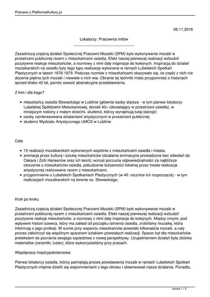 Pobrano z PlatformaKultury.pl 06.11.2016 Lokatorzy. Pracownia mitów ____________________________ Zasadniczą częścią działań Społecznej Pracowni Mozaiki (SPM) było wykonywanie mozaik w przestrzeni publicznej razem z mieszkańcami osiedla. Efekt naszej pierwszej realizacji wzbudził pozytywne reakcje mieszkańców, a rozmowy z nimi dały inspiracje do kolejnych. Inspiracją do działań mozaikarskich na osiedlu były tego typu realizacje wykonane w ramach Lubelskich Spotkań Plastycznych w latach 1976-1979. Podczas rozmów z mieszkańcami okazywało się, że część z nich nie docenia piękna tych mozaik i niewiele o nich wie. Obranie tej techniki miało przypomnieć o historiach sprzed blisko 40 lat, pomóc oswoić abstrakcyjne przedstawienia. Z kim i dla kogo? mieszkańcy osiedla Słowackiego w Lublinie (głównie osoby starsze - w tym pierwsi lokatorzy Lubelskiej Spółdzielni Mieszkaniowej, dorośli 40+ (dorastający w przestrzeni osiedla), w mniejszym rodziny z małym dziećmi, studenci, którzy wynajmują tutaj stancje) osoby zainteresowana działaniami artystycznymi w przestrzeni publicznej studenci Wydziału Artystycznego UMCS w Lublinie Cele 15 realizacji mozaikarskich wykonanych wspólnie z mieszkańcami osiedla i miasta. animacja przez kulturę i sztukę mieszkańców (działania animacyjne prowadzone bez odwołań do Oskara i Zofii Hansenów oraz ich teorii); wzrost poczucia odpowiedzialności za najbliższe otoczenie u mieszkańców osiedla, pobudzenie tożsamości lokalnej przez trwale realizacje artystycznej realizowane razem z mieszkańcami; przypomnienie o Lubelskich Spotkaniach Plastycznych (w 40. rocznice ich rozpoczęcia) - w tym realizacjach mozaikarskich na terenie os. Słowackiego; Krok po kroku Zasadniczą częścią działań Społecznej Pracowni Mozaiki (SPM) było wykonywanie mozaik w przestrzeni publicznej razem z mieszkańcami osiedla. Efekt naszej pierwszej realizacji wzbudził pozytywne reakcje mieszkańców, a rozmowy z nimi dały inspiracje do kolejnych. Między innymi, pod wpływem historii szewca, który ma zakład od początku istnienia osiedla, zrobiliśmy mozaikę, która informuję o jego profesji. W sumie przy wsparciu mieszkańców powstało kilkanaście mozaik, a cały proces zakończył się wspólnym spacerem szlakiem powstałych realizacji. Spacer był dla mieszkańców pretekstem do poznania swojego sąsiedztwa z nowej perspektywy. Uzupełnieniem działań była zbiórka materiałów (ceramiki, luster), które wykorzystaliśmy przy pracach. Współpraca międzypokoleniowa Pierwsi lokatorzy osiedla, którzy pamiętają proces powstawania mozaik w ramach Lubelskich Spotkań Plastycznych chętnie dzielili się wspomnieniami z tego okresu i obserwowali nasze działania. Ponadto, strona 1 / 2 Pobrano z PlatformaKultury.pl wieloletni mieszkańcy osiedla dużo nam o nim opowiadali, a niektóre relacje zostały przekute w mozaiki. Młodsi mieszkańcy zainspirowani opowieściami pomagali nam w układaniu mozaik i opowiadali o swoich pomysłach odpowiadających na ich potrzeby. Działania szczególnie wspierał gimnazjalista - pasjonat motoryzacji. Widział w przestrzeni osiedla samochód malucha - koniecznie w skali 1:1. Mozaikę upodobali sobie członkowie fanklubu Fiata 126p, którzy do tej pory regularnie organizują tam zjazdy maluchów, zaprzyjaźnili się z pomysłodawcą mozaik. Metody i narzędzia Działania Pracowni wzmacniały projekt o działania z kręgu community arts, dawały możliwość twórczego spędzenia czasu, wspólnej pracy, poszerzenia kompetencji i umiejętności z zakresu tworzenia i odbierania sztuki. Naczelnym celem działań Pracowni była wspólna praca z mieszkańcami i przemienienie już zebranych (w edycji “Lokatorów” z 2014 roku) i ciągle wzbogacanych opowieści o osiedlu i jego mieszkańcach. Finansowanie Projekt “Lokatorzy” finansowany był z budżetu miasta Lublin, w ramach środków pozyskanych w ramach konkursu gruntowego “Miasto Kultury”. Trudności Największą przeszkodą była niesprzyjająca pogoda, która momentami opóźniała realizację mozaik. Niewielkim ograniczeniem była konieczność konsultowania projektów z Administracją osiedla (zwłaszcza na początku projektu, zanim zdobyliśmy zaufanie pracowników administracji) Co dalej? Po zakończeniu projektu SPM przekształcił się w niezależny kolektyw, który w 2015 roku dostał zaproszenia do nowych działań animacyjno-artystycznych, 2016 rok przyniósł kolejne realizację w przestrzeni publicznej. SPM będzie kontynuować. Link do filmu http://lublin.tvp.pl/22530289/6-listopada-2015 strona 2 / 2