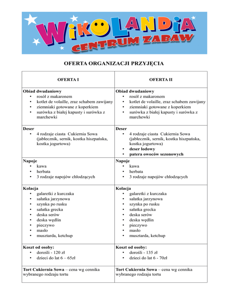 OFERTA ORGANIZACJI PRZYJĘCIA OFERTA I OFERTA II Obiad dwudaniowy Obiad dwudaniowy • rosół z makaronem • rosół z makaronem • kotlet de volaille, zraz schabem zawijany • kotlet de volaille, zraz schabem zawijany • ziemniaki gotowane z koperkiem • ziemniaki gotowane z koperkiem • surówka z białej kapusty i surówka z • surówka z białej kapusty i surówka z marchewki marchewki Deser • 4 rodzaje ciasta Cukiernia Sowa (jabłecznik, sernik, kostka hiszpańska, kostka jogurtowa) Deser • 4 rodzaje ciasta Cukiernia Sowa (jabłecznik, sernik, kostka hiszpańska, kostka jogurtowa) • deser lodowy • patera owoców sezonowych Napoje • kawa • herbata • 3 rodzaje napojów chłodzących Napoje • kawa • herbata • 3 rodzaje napojów chłodzących Kolacja • galaretki z kurczaka • sałatka jarzynowa • szynka po rusku • sałatka grecka • deska serów • deska wędlin • pieczywo • masło • musztarda, ketchup Kolacja • galaretki z kurczaka • sałatka jarzynowa • szynka po rusku • sałatka grecka • deska serów • deska wędlin • pieczywo • masło • musztarda, ketchup Koszt od osoby: • dorośli - 120 zł • dzieci do lat 6 – 65zł Koszt od osoby: • dorośli - 135 zł • dzieci do lat 6 - 70zł Tort Cukiernia Sowa – cena wg cennika wybranego rodzaju tortu Tort Cukiernia Sowa – cena wg cennika wybranego rodzaju tortu