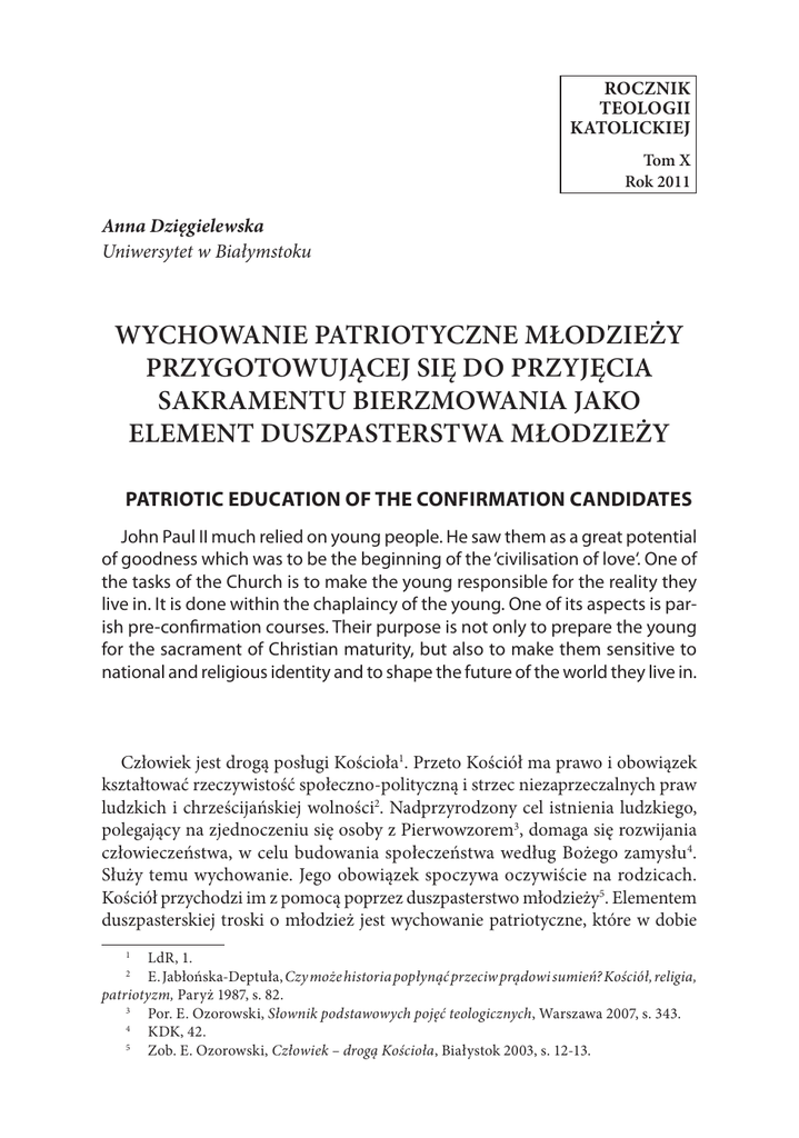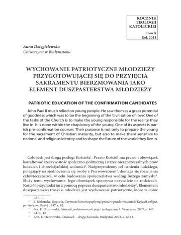 ROCZNIK TEOLOGII KATOLICKIEJ Tom X Rok 2011 Anna Dzięgielewska Uniwersytet w Białymstoku WYCHOWANIE PATRIOTYCZNE MŁODZIEŻY PRZYGOTOWUJĄCEJ SIĘ DO PRZYJĘCIA SAKRAMENTU BIERZMOWANIA JAKO ELEMENT DUSZPASTERSTWA MŁODZIEŻY PATRIOTIC EDUCATION OF THE CONFIRMATION CANDIDATES John Paul II much relied on young people. He saw them as a great potential of goodness which was to be the beginning of the ‘civilisation of love‘. One of the tasks of the Church is to make the young responsible for the reality they live in. It is done within the chaplaincy of the young. One of its aspects is parish pre-confirmation courses. Their purpose is not only to prepare the young for the sacrament of Christian maturity, but also to make them sensitive to national and religious identity and to shape the future of the world they live in. Człowiek jest drogą posługi Kościoła1. Przeto Kościół ma prawo i obowiązek kształtować rzeczywistość społeczno-polityczną i strzec niezaprzeczalnych praw ludzkich i chrześcijańskiej wolności2. Nadprzyrodzony cel istnienia ludzkiego, polegający na zjednoczeniu się osoby z Pierwowzorem3, domaga się rozwijania człowieczeństwa, w celu budowania społeczeństwa według Bożego zamysłu4. Służy temu wychowanie. Jego obowiązek spoczywa oczywiście na rodzicach. Kościół przychodzi im z pomocą poprzez duszpasterstwo młodzieży5. Elementem duszpasterskiej troski o młodzież jest wychowanie patriotyczne, które w dobie LdR, 1. E. Jabłońska-Deptuła, Czy może historia popłynąć przeciw prądowi sumień? Kościół, religia, patriotyzm, Paryż 1987, s. 82. 3 Por. E. Ozorowski, Słownik podstawowych pojęć teologicznych, Warszawa 2007, s. 343. 4 KDK, 42. 5 Zob. E. Ozorowski, Człowiek – drogą Kościoła, Białystok 2003, s. 12-13. 1 2 204 Anna Dzięgielewska globalizacji, istnienia nacjonalizmu i kosmopolityzmu, migracji narodów, stanowi podstawę integralnego rozwoju człowieka i pokoju światowego. Celem tegoż wychowania jest wychowanie do wolności, łączącej się z odpowiedzialnością za wspólnotę narodową6. Ma ono miejsce w sposób szczególny w formacji dojrzałości chrześcijańskiej, jak się określa Sakrament Bierzmowania. W tym okresie ludzkiego życia, kiedy kształtują się wzorce postępowania, Kościół nie tylko budzi świadomość religijną młodych, lecz nadto narodową. 1. Wychowanie patriotyczne – szkołą bogatszego człowieczeństwa Episkopat Polski w swych programach duszpasterskich, poświęconych młodzieży, poruszał zagrożenia wiary: ateizacja, demoralizacja, bezideowość, osłabienie więzi z przeszłością narodu, osamotnienie młodzieży, wynarodowienie7. Przeciwdziałać tym tendencjom miało duszpasterstwo młodzieży, umacniające w niej zadania wynikające z dojrzałości chrześcijańskiej. W sercu działalności Kościoła zawsze jest młodzież, ponieważ od jej postaw moralnych zależy przyszłość nie tylko Kościoła, ale i Ojczyzny, a w szerszej perspektywie – i świata. Stąd nacisk na kształtowanie wrażliwych sumień i odpowiedzialności młodych za Kościół i społeczeństwo. W formację osobowości młodych ludzi wpisuje się tegoroczny program duszpasterski pod hasłem „W komunii z Bogiem”, będący pierwszym cyklem trzyletniego programu obejmującego lata 2010-2013, wyrażający się w sformułowaniu „Kościół domem i szkołą komunii”. Motyw przewodni tegoż programu koncentruje się wokół eklezjologicznego pojęcia komunii8. Ma ono doniosłe znaczenie nie tylko z uwagi na naukę doktrynalną, lecz dla mentalności młodego człowieka, który chętnie wprowadza do rozumienia natury Kościoła dualizm: „ja” i „oni”, przy czym to „ja”- buntownicze, uważające się za jedyną ostoję nieskazitelności i czystości ideałów, zaś „oni” – do których zalicza „dorosłych” (tak duchownych, jak i świeckich) – to zakłamany zdrajca wartości, którego trzeba – w obronie prawdy i szlachetności – piętnować i zmieniać. Przeto kluczowym zagadnieniem, przed którym staje Kościół jest ukazanie wrażliwej na wartości młodzieży, że Kościół to nie zwalczające się ze sobą gangi, lecz wspólnota, za którą jest również ona odpowiedzialna, gdyż jacy są młodzi, taki i Kościół. Odejście od instytucyjnego pojmowania Kościoła, jawi się jako priorytet wprowadzania gimnazjalistów w chrześcijański paradygmat wartości, jakim są honor, odwaga, szlachetność, sprawiedliwość, miłość. W motywach podjęcia zmiany wizerunku Kościoła nie Por. T. Zadykowicz, Czy może istnieć świat bez wartości?, Białystok 2003, s. 21; DWCH, Wstęp. 7 M. Olszewski, Duszpasterstwo parafialne. W świetle programów duszpasterskich Episkopatu Polski 1967-2000. Studium teologiczno-pastoralne, Białystok 2005, s. 299-302. 8 Trzyletni program duszpasterski w Polsce 2010-2013, I. 6 Wychowanie patriotyczne młodzieży przygotowującej się do przyjęcia... 205 chodzi o dalekowzroczną obawę, którą wyraził Episkopat, odchodzenia młodych od Kościoła9, lecz o swoisty nowy antyklerykalizm, zjawisko, dla którego możemy dać roboczą i umowną nazwę – antysuperbianizm (od. łac. „superbia” – „pycha”; „superbio” – „przechwalać się”; „superbus” – „wyniosły”, „okazały”). Antyklerykalizm, jak podkreśla każda encyklopedia, jest fundamentalistyczną i fanatyczną ideologią społeczno – polityczną, wymierzoną w Kościół i wrogo ustosunkowująca się do duchowieństwa jako takiego10. Antysuperbianizm zaś możemy pojmować jako doświadczenie egzystencjalne, jeden z owoców postmodernistycznego myślenia, który nie jest ukierunkowany na niszczenie instytucji kościelnej ani duchowieństwa, spychanie na margines życia społecznego. U jego podłoża znajduje się Norwidowskie doświadczenie ideałów, które sięgnęły bruku, sprzeciw wobec wyniosłości członków Kościoła, a także – jak to zost