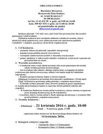 ORGANIZATORZY: Burmistrz Brzozowa Brzozowski Dom Kultury ul. Armii Krajowej 3 36-200 Brzozów tel./fax 13 43 419 38 w godz. od 9:00 do 16:00 kom. 509 027 876 w godz. od 13:00 do 20:00 od poniedziałku do piątku [email protected] Konkurs piosenki “Nie takie stare..(jak świat)”jest przeznaczony dla uczniów gimnazjum i szkół średnich. Zadaniem konkursu jest rozwijanie zdolności wokalnych uczniów, którzy ukończyli szkołę podstawową, oraz zainteresowanie ich repertuarem polskich wokalistów i zespołów, począwszy od lat 60 do współczesnych. 1. Cel Konkursu. - poznanie ciekawych piosenek i sposobów interpretacji - popularyzacja polskiej muzyki rozrywkowej - rozwijanie zainteresowań uczniów w kierunku artystycznym - pomoc młodzieży w odkrywaniu talentów wokalnych, scenicznych i sposobu ich prezentowania na scenie. 2. Warunki uczestnictwa. - w konkursie może wziąć udział uczennica lub uczeń gimnazjum lub każdej szkoły średniej powiatu brzozowskiego. - Jest to konkurs dla solistów, dlatego większa ilość występujących będzie traktowana jak chórek towarzyszący soliście i nie będzie mógł być oddzielnie nagradzany. - Konkurs przeprowadzony będzie w dwóch etapach: Eliminacje (wykonawca prezentuje dwie piosenki z podkładem CD lub mp3) Finał (wykonawca prezentuje jedną piosenkę z zespołem muzycznym) - Uczestnik wybiera piosenki z listy utworów podanych przez organizatora (w każdej edycji konkursu będzie to repertuar dwóch polskich solistów lub zespołów) - W konkursie finałowym wezmą udział wykonawcy, którzy zostaną wytypowani przez Komisję Konkursową( do 20 wokalistów). - Uczestnicy, którzy wezmą udział w finale opłacają akredytację w wysokości 20zł przed próbami z zespołem muzycznym 3. Terminy konkursu : - Eliminacje - 21 kwietnia 2016 r. godz. 10:00 - Finał - 9 czerwca, godz. 17:00 -zgłoszenia należy dostarczyć do Brzozowskiego Domu Kultury do 14 kwietnia 2016. 4. Kategorie wiekowe i nagrody - I kategoria ( klasy 1-3 Gimnazjum) - II kategoria ( klasy 1-3 Szkoły średnie) Przewidziano po trzy nagrody dla każdej kategorii 5. Organizacja konkursu - Instruktorzy BDK mogą pomóc w wyborze piosenki czy podkładu muzycznego - Organizator zapewnia zespół muzyczny, który będzie akompaniował finalistom. - Zapewnia się przeprowadzenie co najmniej dwóch prób z zespołem. - Terminy prób będą ustalane indywidualnie z każdym z finalistów po przeprowadzonych eliminacjach. - Przed Konkursem Eliminacyjnym przewidujemy jedynie próbę akustyczną i sprawdzenie nośnika podkładu w godz. 8:30 do 10:00 6. Repertuar do wyboru. W tej edycji największe przeboje Anny German oraz Maryli Rodowicz - Lista utworów do wyboru: „Człowieczy los” „Tańczące Eurydyki” „ Ballada o ziemi i niebie” „Być może” „Jedna chwila wystarczyła” „Bal u Posejdona” „Zakwitnę różą” „Jesteś moją miłością” „Cztery karty” „Wszystko w życiu ma swój kres” „Małgośka” „Wariatka tańczy” „Damą być” „Rozmowa przez ocean” „Diabeł i raj” „Niech żyje bal” „Łatwopalni” „Wielka woda” „Sing, sing” „Co się stało z mamą” 7. Wybór piosenek i ocena W czasie Eliminacji prezentowane są po 2 piosenki wybrane z listy . W Finale konkursu prezentujemy jedną piosenkę, wybraną przez jury z dwóch prezentowanych w czasie Eliminacji. Wszystkie utwory są dostępne w sieci internetowej, dlatego można je łatwo poznać i dostosować do swoich możliwości. W razie potrzeby instruktorzy BDK pomogą w wyborze podkładu. Dopuszczamy możliwość powtórzenia się tej samej piosenki do trzech razy w konkursie (w tym wypadku obowiązywać będzie kolejność zgłoszeń). W razie niższego poziomu wykonawczego w konkursie eliminacyjnym, komisja zastrzega sobie możliwość zakwalifikowania większej niż 10 osób z jednej kategorii na niekorzyść drugiej. Kryteria oceny: - dykcja i emisja głosu - intonacja - interpretacja utworu - prezentacja sceniczno-ruchowa BRZOZÓW kwiecień-czerwiec 2016 r.