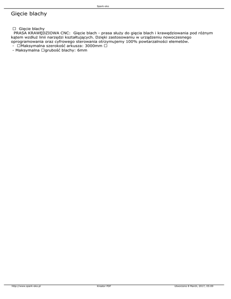 Spark-eko Gięcie blachy Gięcie blachy PRASA KRAWĘDZIOWA CNC: Gięcie blach - prasa służy do gięcia blach i krawędziowania pod różnym kątem wzdłuż linii narzędzi kształtujących. Dzięki zastosowaniu w urządzeniu nowoczesnego oprogramowania oraz cyfrowego sterowania otrzymujemy 100% powtarzalności elemetów. - Maksymalna szerokość arkusza: 3000mm - Maksymalna grubość blachy: 6mm http://www.spark-eko.pl Kreator PDF Utworzono 8 March, 2017, 05:09