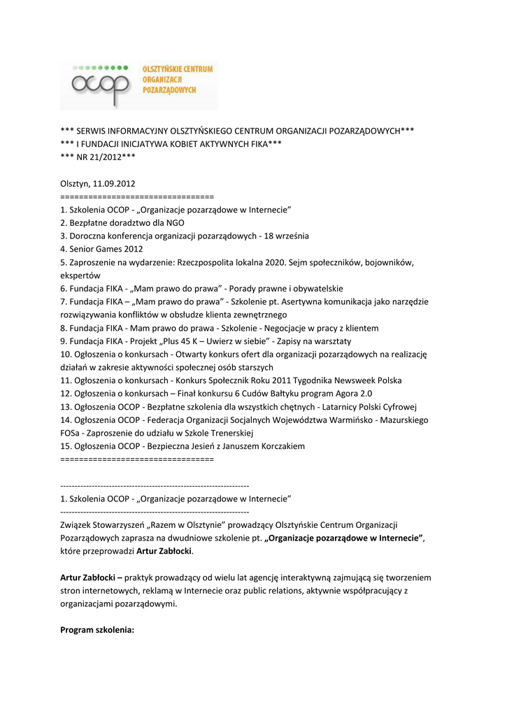 *** SERWIS INFORMACYJNY OLSZTYŃSKIEGO CENTRUM ORGANIZACJI POZARZĄDOWYCH*** *** I FUNDACJI INICJATYWA KOBIET AKTYWNYCH FIKA*** *** NR 21/2012*** Olsztyn, 11.09.2012 ================================= 1. Szkolenia OCOP - „Organizacje pozarządowe w Internecie” 2. Bezpłatne doradztwo dla NGO 3. Doroczna konferencja organizacji pozarządowych - 18 września 4. Senior Games 2012 5. Zaproszenie na wydarzenie: Rzeczpospolita lokalna 2020. Sejm społeczników, bojowników, ekspertów 6. Fundacja FIKA - „Mam prawo do prawa” - Porady prawne i obywatelskie 7. Fundacja FIKA – „Mam prawo do prawa” - Szkolenie pt. Asertywna komunikacja jako narzędzie rozwiązywania konfliktów w obsłudze klienta zewnętrznego 8. Fundacja FIKA - Mam prawo do prawa - Szkolenie - Negocjacje w pracy z klientem 9. Fundacja FIKA - Projekt „Plus 45 K – Uwierz w siebie” - Zapisy na warsztaty 10. Ogłoszenia o konkursach - Otwarty konkurs ofert dla organizacji pozarządowych na realizację działań w zakresie aktywności społecznej osób starszych 11. Ogłoszenia o konkursach - Konkurs Społecznik Roku 2011 Tygodnika Newsweek Polska 12. Ogłoszenia o konkursach – Finał konkursu 6 Cudów Bałtyku program Agora 2.0 13. Ogłoszenia OCOP - Bezpłatne szkolenia dla wszystkich chętnych - Latarnicy Polski Cyfrowej 14. Ogłoszenia OCOP - Federacja Organizacji Socjalnych Województwa Warmińsko - Mazurskiego FOSa - Zaproszenie do udziału w Szkole Trenerskiej 15. Ogłoszenia OCOP - Bezpieczna Jesień z Januszem Korczakiem ================================= -----------------------------------------------------------------1. Szkolenia OCOP - „Organizacje pozarządowe w Internecie” -----------------------------------------------------------------Związek Stowarzyszeń „Razem w Olsztynie” prowadzący Olsztyńskie Centrum Organizacji Pozarządowych zaprasza na dwudniowe szkolenie pt. „Organizacje pozarządowe w Internecie”, które przeprowadzi Artur Zabłocki. Artur Zabłocki – praktyk prowadzący od wielu lat agencję interaktywną zajmującą się tworzeniem stron internetowych, reklamą w Internecie oraz public relations, aktywnie współpracujący z organizacjami pozarządowymi. Program szkolenia: Dzień 1 (25 września): ♦ Możliwości i zagrożenia wynikające z obecności organizacji w Internecie. ♦ Jak zbudować i prowadzić stronę internetową? ♦ Organizacje pozarządowe wykorzystują serwisy społecznościowe. Dzień 2 (26 września): ♦ Tworzenie treści na potrzeby Internetu: - jak przygotowywać teksty? - jak przygotowywać materiały graficzne? - prawo autorskie, czyli, na co trzeba uważać pobierając materiały z Internetu. ♦ Promocja i pozycjonowanie stron internetowych: - wykorzystanie boksów reklamowych AdWords, - samodzielne pozycjonowanie strony internetowej w wyszukiwarkach, ♦ Strona organizacji na Facebooku: - jak założyć profil? - jak prowadzić fanpage w serwisie Facebook? Szkolenie prowadzone będzie w formie wykładu a także poprzez aktywny udział jego uczestników. Miejsce szkolenia: Olsztyńskie Centrum Organizacji Pozarządowych, ul. Tarasa Szewczenki 1, 10-274 Olsztyn mapa >> Termin: 25-26 września 2012, godz. 16.00 - 19.30 Szkolenie jest nieodpłatne i skierowane do przedstawicieli organizacji pozarządowych z Olsztyna i powiatu olsztyńskiego. Uczestnicy szkolenia otrzymają materiały szkoleniowe oraz poczęstunek. Prosimy o wypełnienie formularza zgłoszeniowego >> (u dołu strony). O udziale w szkoleniu decyduje kolejność zgłoszeń. O zakwalifikowaniu się do udziału w szkoleniu poinformujemy Państwa telefonicznie lub pocztą elektroniczną najpóźniej 3 dni przed szkoleniem. Informacje na temat szkolenia: Olsztyńskie Centrum Organizacji Pozarządowych ul. Tarasa Szewczenki 1 10-274 Olsztyn tel. 503 680 500 [email protected] Szkolenie jest organizowane przez Związek Stowarzyszeń „Razem w Olsztynie” w ramach projektu „Olsztyńskie Centrum Organizacji Pozarządowych" realizowanego przy współudziale finansowym Gminy Olsztyn oraz projektu "W kierunku profesjonalizacji" współfinansowanego przez Powiat Olsztyński. --------------------------------------------------------------------2. Bezpłatne doradztwo dla NGO --------------------------------------------------------------------Olsztyńskie Centrum Organizacji Pozarządowych oferuje bezpłatną pomoc przy przygotowaniu ofert konkursowych. Organizacje zainteresowane ofertą OCOP proszone są o kontakt: [email protected], tel. 512558349 Bezpłatne doradztwo uzyskać można również w zakresie m.in.: rozliczania ofert z realizacji zadań publicznych oraz pisania i rozliczania projektów. Osoby zajmujące się w organizacji sprawami księgowymi i finansowymi zapraszamy do skorzystania z bezpłatnego doradztwa w Olsztyńskim Centrum Organizacji Pozarządowych we wtorki g.17.00-18.00. Miejsce: Olsztyńskie Centrum Organizacji Pozarządowych, ul. Tarasa Szewczenki 1, 10-274 Olsztyn mapa >> Doradztwo jest organizowane przez Związek Stowarzyszeń „Razem w Olsztynie” w ramach projektu „Olsztyńskie Centrum Organizacji Pozarządowych" realizowanego przy współudziale finansowym Gminy Olsztyn oraz projektu "W kierunku profesjonalizacji" współfinansowanego przez Powiat Olsztyński. --------------------------------------------------------------------3. Doroczna konferencja organizacji pozarządowych - 18 września --------------------------------------------------------------------Samorząd Województwa Warmińsko-Mazurskiego oraz Rada Organizacji Pozarządowych Województwa Warmińsko-Mazurskiego zapraszają na doroczną konferencję organizacji pozarządowych Województwa Warmińsko-Mazurskiego pod hasłem: „Społeczności lokalne i ich organizacje a dobro wspólne jakim jest przestrzeń publiczna”. Zobacz więcej >> --------------------------------------------------------------------4. Senior Games 2012 --------------------------------------------------------------------Roz