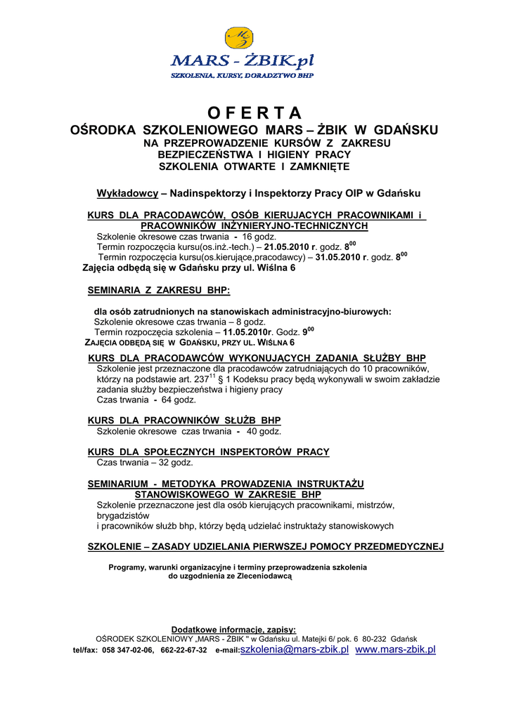 OFERTA OŚRODKA SZKOLENIOWEGO MARS – śBIK W GDAŃSKU NA PRZEPROWADZENIE KURSÓW Z ZAKRESU BEZPIECZEŃSTWA I HIGIENY PRACY SZKOLENIA OTWARTE I ZAMKNIĘTE Wykładowcy – Nadinspektorzy i Inspektorzy Pracy OIP w Gdańsku KURS DLA PRACODAWCÓW, OSÓB KIERUJACYCH PRACOWNIKAMI i PRACOWNIKÓW INśYNIERYJNO-TECHNICZNYCH Szkolenie okresowe czas trwania - 16 godz. Termin rozpoczęcia kursu(os.inŜ.-tech.) – 21.05.2010 r. godz. 800 Termin rozpoczęcia kursu(os.kierujące,pracodawcy) – 31.05.2010 r. godz. 800 Zajęcia odbędą się w Gdańsku przy ul. Wiślna 6 SEMINARIA Z ZAKRESU BHP: dla osób zatrudnionych na stanowiskach administracyjno-biurowych: Szkolenie okresowe czas trwania – 8 godz. Termin rozpoczęcia szkolenia – 11.05.2010r. Godz. 900 ZAJĘCIA ODBĘDĄ SIĘ W GDAŃSKU, PRZY UL. WIŚLNA 6 KURS DLA PRACODAWCÓW WYKONUJĄCYCH ZADANIA SŁUśBY BHP Szkolenie jest przeznaczone dla pracodawców zatrudniających do 10 pracowników, którzy na podstawie art. 23711 § 1 Kodeksu pracy będą wykonywali w swoim zakładzie zadania słuŜby bezpieczeństwa i higieny pracy Czas trwania - 64 godz. KURS DLA PRACOWNIKÓW SŁUśB BHP Szkolenie okresowe czas trwania - 40 godz. KURS DLA SPOŁECZNYCH INSPEKTORÓW PRACY Czas trwania – 32 godz. SEMINARIUM - METODYKA PROWADZENIA INSTRUKTAśU STANOWISKOWEGO W ZAKRESIE BHP Szkolenie przeznaczone jest dla osób kierujących pracownikami, mistrzów, brygadzistów i pracowników słuŜb bhp, którzy będą udzielać instruktaŜy stanowiskowych SZKOLENIE – ZASADY UDZIELANIA PIERWSZEJ POMOCY PRZEDMEDYCZNEJ Programy, warunki organizacyjne i terminy przeprowadzenia szkolenia do uzgodnienia ze Zleceniodawcą Dodatkowe informacje, zapisy: OŚRODEK SZKOLENIOWY „MARS - śBIK '' w Gdańsku ul. Matejki 6/ pok. 6 80-232 Gdańsk tel/fax: 058 347-02-06, 662-22-67-32 e-mail:[email protected] www.mars-zbik.pl