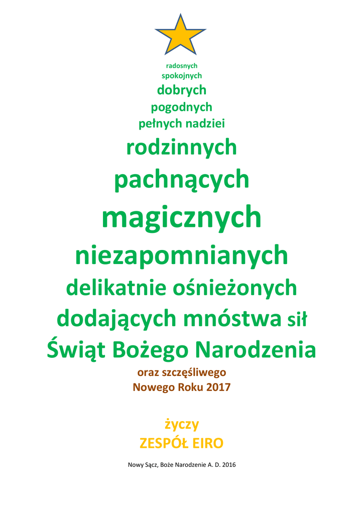 radosnych spokojnych dobrych pogodnych pełnych nadziei rodzinnych pachnących magicznych niezapomnianych delikatnie ośnieżonych dodających mnóstwa sił Świąt Bożego Narodzenia oraz szczęśliwego Nowego Roku 2017 życzy ZESPÓŁ EIRO Nowy Sącz, Boże Narodzenie A. D. 2016