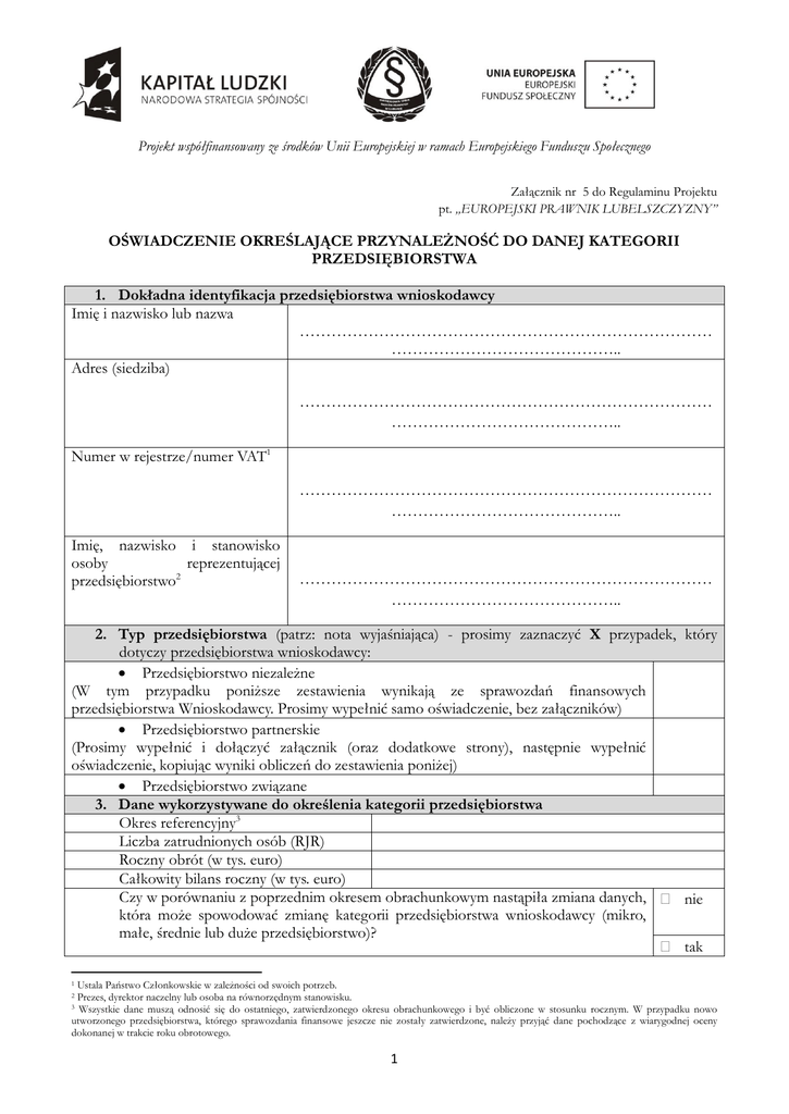 Projekt współfinansowany ze środków Unii Europejskiej w ramach Europejskiego Funduszu Społecznego Załącznik nr 5 do Regulaminu Projektu pt. „EUROPEJSKI PRAWNIK LUBELSZCZYZNY” OŚWIADCZENIE OKREŚLAJĄCE PRZYNALEŻNOŚĆ DO DANEJ KATEGORII PRZEDSIĘBIORSTWA 1. Dokładna identyfikacja przedsiębiorstwa wnioskodawcy Imię i nazwisko lub nazwa …………………………………………………………………… …………………………………….. Adres (siedziba) …………………………………………………………………… …………………………………….. Numer w rejestrze/numer VAT1 …………………………………………………………………… …………………………………….. Imię, nazwisko i stanowisko osoby reprezentującej przedsiębiorstwo2 …………………………………………………………………… …………………………………….. 2. Typ przedsiębiorstwa (patrz: nota wyjaśniająca) - prosimy zaznaczyć X przypadek, który dotyczy przedsiębiorstwa wnioskodawcy: Przedsiębiorstwo niezależne (W tym przypadku poniższe zestawienia wynikają ze sprawozdań finansowych przedsiębiorstwa Wnioskodawcy. Prosimy wypełnić samo oświadczenie, bez załączników) Przedsiębiorstwo partnerskie (Prosimy wypełnić i dołączyć załącznik (oraz dodatkowe strony), następnie wypełnić oświadczenie, kopiując wyniki obliczeń do zestawienia poniżej) Przedsiębiorstwo związane 3. Dane wykorzystywane do określenia kategorii przedsiębiorstwa Okres referencyjny3 Liczba zatrudnionych osób (RJR) Roczny obrót (w tys. euro) Całkowity bilans roczny (w tys. euro) Czy w porównaniu z poprzednim okresem obrachunkowym nastąpiła zmiana danych, nie która może spowodować zmianę kategorii przedsiębiorstwa wnioskodawcy (mikro, małe, średnie lub duże przedsiębiorstwo)? tak Ustala Państwo Członkowskie w zależności od swoich potrzeb. Prezes, dyrektor naczelny lub osoba na równorzędnym stanowisku. 3 Wszystkie dane muszą odnosić się do ostatniego, zatwierdzonego okresu obrachunkowego i być obliczone w stosunku rocznym. W przypadku nowo utworzonego przedsiębiorstwa, którego sprawozdania finansowe jeszcze nie zostały zatwierdzone, należy przyjąć dane pochodzące z wiarygodnej oceny dokonanej w trakcie roku obrotowego. 1 2 1 Projekt współfinansowany ze środków Unii Europejskiej w ramach Europejskiego Funduszu Społecznego Uwaga. W przypadku zaznaczenia „tak” prosimy wypełnić i dołączyć oświadczenie dotyczące poprzedniego okresu obrachunkowego)4 Oświadczam, że dane zawarte w niniejszym oświadczeniu i załącznikach do niego są zgodne ze stanem faktycznym. …………………………………………………… …………………………………………………… Miejscowość i data 4 Pieczęć i podpis osoby uprawnionej do reprezentacji Przedsiębiorcy Definicja. Art. 4 ust. 2 załącznika do zalecenia Komisji 2003/361/WE. 2 Projekt współfinansowany ze środków Unii Europejskiej w ramach Europejskiego Funduszu Społecznego NOTA WYJAŚNIAJĄCA DOTYCZĄCA TYPÓW PRZEDSIĘBIORSTW BRANYCH POD UWAGĘ PRZY OBLICZANIU LICZBY OSÓB ZATRUDNIONYCH I DANYCH FINANSOWYCH I. TYP PRZEDSIĘBIORSTWA Definicja MŚP5 rozróżnia trzy typy przedsiębiorstwa, w zależności od ich związków z innymi przedsiębiorstwami pod względem udziału w kapitale, prawach głosu lub wywierania dominującego wpływu6. Typ 1: Przedsiębiorstwo niezależne Jak dotąd jest to najczęściej spotykany typ przedsiębiorstwa. Oznacza on każde przedsiębiorstwo, którego nie można zaliczyć do żadnego z dwóch pozostałych typów (przedsiębiorstwo partnerskie lub związane). Przedsiębiorstwo wnioskodawcy jest niezależne, jeśli: - nie posiada 25% lub więcej udziałów lub głosów7 w innym przedsiębiorstwie, - inne przedsiębiorstwa lub podmioty publiczne nie posiadają, samodzielnie lub wspólnie z jednym lub kilkoma przedsiębiorstwami związanymi lub podmiotami publicznymi 25% lub więcej3 udziałów lub głosów w przedsiębiorstwie wnioskodawcy, poza niektórymi wyjątkami8, - nie sporządza skonsolidowanych sprawozdań finansowych i nie jest ujęte w sprawozdaniach finansowych przedsiębiorstwa, które sporządza sprawozdania skonsolidowane, a zatem nie jest przedsiębiorstwem związanym9. Typ 2: Przedsiębiorstwo partnerskie 5 Odtąd w tekście termin „definicja" odnosi się do załącznika do zalecenia Komisji 2003/361/WE dotyczącego definicji MŚP. Definicja, art. 3. 7 Jeśli chodzi o udział w kapitale lub prawach głosu, należy przyjąć tę wartość, która jest większa. Do tej wartości procentowej należy dodać udziały, jakie w tym przedsiębiorstwie mają poszczególne przedsiębiorstwa związane z przedsiębiorstwem dominującym (definicja, art. 3 ust. 2). 8 Jednakże przedsiębiorstwo można uznać za niezależne, nawet jeśli wartość progowa wynosząca 25% kapitału lub głosów została osiągnięta lub przekroczona, jeżeli udział ten należy do następujących kategorii inwestorów (pod warunkiem że nie są oni związani z przedsiębiorstwem wnioskodawcy): a) publiczne korporacje inwestycyjne, spółki kapitałowe podwyższonego ryzyka, osoby fizyczne lub grupy osób prowadzące regularną działalność inwestycyjną podwyższonego ryzyka, które inwestują kapitał własny w przedsiębiorstwa nienotowane na giełdzie („business angels"), pod warunkiem że cała kwota inwestycji tych inwestorów („business angels") w to samo przedsiębiorstwo nie przekroczy 1 250 000 EUR, b) uniwersytety lub niedochodowe ośrodki badawcze, c) inwestorzy instytucjonalni łącznie z regionalnymi funduszami rozwoju, d) samorządy lokalne z rocznym budżetem nieprzekraczającym 10 milionów EUR oraz liczbą mieszkańców poniżej 5000. (Definicja, art. 3 ust. 2 akapit drugi). 9 Jeśli siedziba przedsiębiorstwa znajduje się w Państwie Członkows