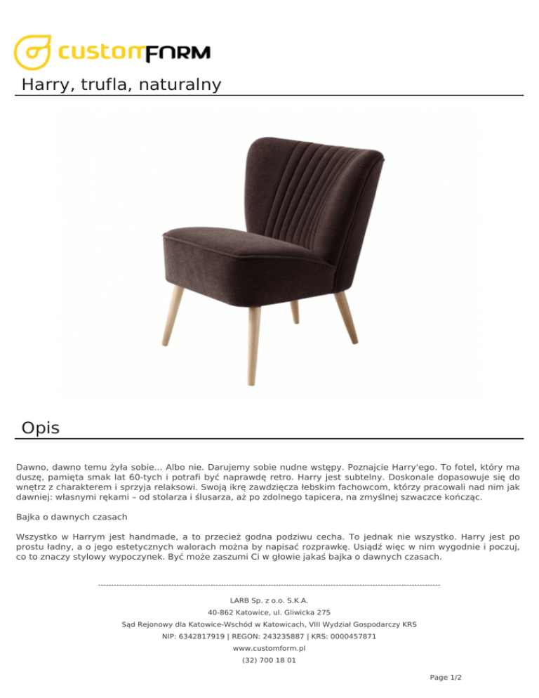 Harry, trufla, naturalny Opis Dawno, dawno temu żyła sobie... Albo nie. Darujemy sobie nudne wstępy. Poznajcie Harry'ego. To fotel, który ma duszę, pamięta smak lat 60-tych i potrafi być naprawdę retro. Harry jest subtelny. Doskonale dopasowuje się do wnętrz z charakterem i sprzyja relaksowi. Swoją ikrę zawdzięcza łebskim fachowcom, którzy pracowali nad nim jak dawniej: własnymi rękami – od stolarza i ślusarza, aż po zdolnego tapicera, na zmyślnej szwaczce kończąc. Bajka o dawnych czasach Wszystko w Harrym jest handmade, a to przecież godna podziwu cecha. To jednak nie wszystko. Harry jest po prostu ładny, a o jego estetycznych walorach można by napisać rozprawkę. Usiądź więc w nim wygodnie i poczuj, co to znaczy stylowy wypoczynek. Być może zaszumi Ci w głowie jakaś bajka o dawnych czasach. ----------------------------------------------------------------------------------------------------------------------------------LARB Sp. z o.o. S.K.A. 40-862 Katowice, ul. Gliwicka 275 Sąd Rejonowy dla Katowice-Wschód w Katowicach, VIII Wydział Gospodarczy KRS NIP: 6342817919 | REGON: 243235887 | KRS: 0000457871 www.customform.pl (32) 700 18 01 Page 1/2 Uwaga! Wybierz kolor, który najbardziej Ci odpowiada! Dostępna kolorystyka tapicerki w załącznikach: "Próbnik tkanin - I, II, III grupa cenowa”. Cena uzależniona jest od rodzaju wybranej tkaniny. Drewniane element wykończenia produktu możemy wykonać w kolorach naturalny - jasne drewno, orzech - ciemne drewno, biały oraz czarny. Specyfikacja Wysokość 71/s.41 cm Szerokość 60 cm Głębokość 51 cm Głębokość siedziska 41 cm Wykończenie tkanina: 100% poliester Siedzisko tkanina Podstawa drewno Dodatkowe zdjęcia ----------------------------------------------------------------------------------------------------------------------------------LARB Sp. z o.o. S.K.A. 40-862 Katowice, ul. Gliwicka 275 Sąd Rejonowy dla Katowice-Wschód w Katowicach, VIII Wydział Gospodarczy KRS NIP: 6342817919 | REGON: 243235887 | KRS: 0000457871 www.customform.pl (32) 700 18 01 Page 2/2 Powered by TCPDF (www.tcpdf.org)