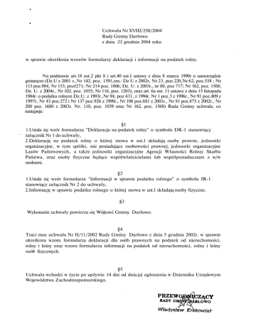 Uchwała Nr XVIII/250/2004 Rady Gminy Darłowo z dnia 22 grudnia 2004 roku w sprawie określenia wzorów formularzy deklaracji i informacji na podatek rolny. Na podstawie art.18 ust.2 pkt 8 i art.40 ust.l ustawy z dnia 8 marca 1990r o samorządzie gminnym (Dz.U z 2001 r,.Nr 142, poz. 1591,zm.: Dz U z 2002r, Nr 23, poz.220,Nr 62, poz.558 ; Nr 113 poz.984, Nr 153, pozl271; Nr 214 poz. 1806; Dz. U. z 2003r., nr 80, poz 717; Nr 162, poz. 1568; Dz. U. z 2004r., Nr 102, poz. 1055; Nr 116, poz. 1203), oraz art. 6a ust. 11 ustawy z dnia 15 listopada 1984r. o podatku rolnym Dz.U. z 1993r.,Nr 94, poz 431, z 1994r. Nr 1 poz.3 z 1996r., Nr 91 poz.409 z 1997r, Nr 43 poz.272 i Nr 137 poz.926 z 1998r., Nr 108 poz.681 z 2001r., Nr 81 poz.875 z 2002r., Nr 200 poz. 1680 z 2003r. Nr. 110, poz. 1039 oraz Nr 162, poz. 1568) Rada Gminy uchwala, co następuje: §1 1.Ustala się wzór formularza "Deklaracja na podatek rolny" o symbolu DR-1 stanowiący załącznik Nr 1 do uchwały, 2.Deklarację na podatek rolny o której mowa w ust.l składają osoby prawne, jednostki organizacyjne, w tym spółki, nie posiadające osobowości prawnej, jednostki organizacyjne Lasów Państwowych, a także jednostki organizacyjne Agencji Własności Rolnej Skarbu Państwa, oraz osoby fizyczne będące współwłaścicielami lub współposiadaczami z w/w osobami. §2 1.Ustala się wzór formularza "Informacji w sprawie podatku rolnego" o symbolu IR-1 stanowiący załącznik Nr 2 do uchwały, 2.Informację w sprawie podatku rolnego o której mowa w ust.l składają osoby fizyczne. §3 Wykonanie uchwały powierza się Wójtowi Gminy Darłowo. §4 Traci moc uchwała Nr II/11/2002 Rady Gminy Darłowo z dnia 5 grudnia 2002r. w sprawie określenia wzoru formularza deklaracji dla osób prawnych na podatek od nieruchomości, rolny i leśny oraz wzoru formularza informacji na podatek od nieruchomości, rolny i leśny osób fizycznych. §5 Uchwała wchodzi w życie po upływie 14 dni od dnia jej ogłoszenia w Dzienniku Urzędowym Województwa Zachodniopomorskiego.