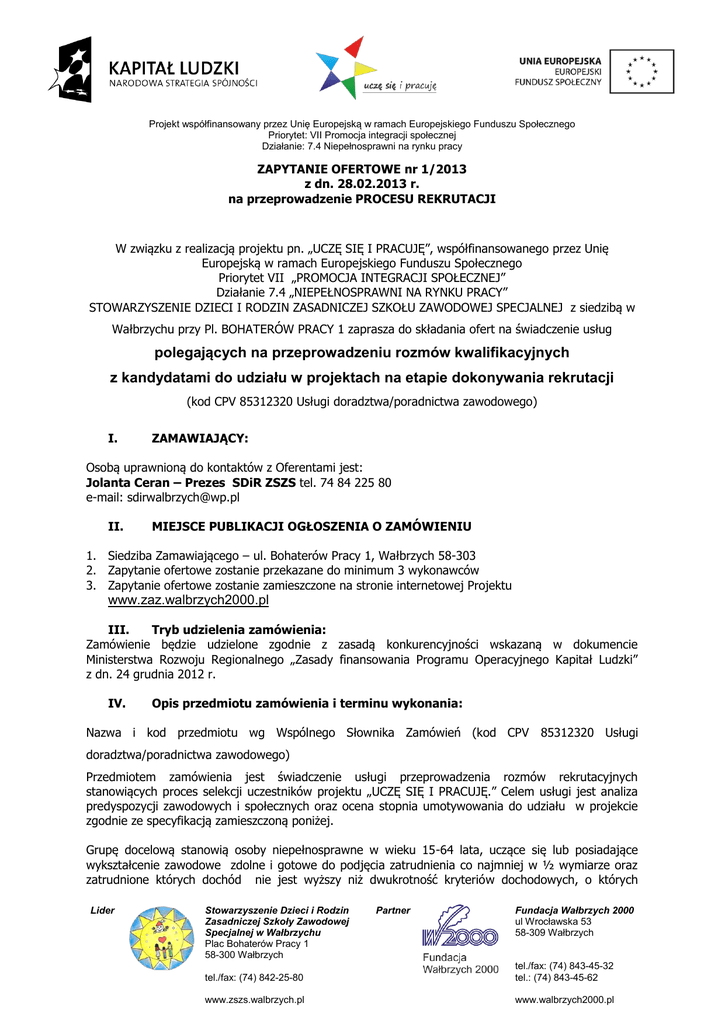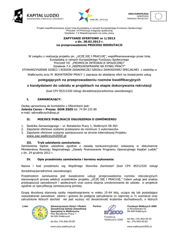 Projekt współfinansowany przez Unię Europejską w ramach Europejskiego Funduszu Społecznego Priorytet: VII Promocja integracji społecznej Działanie: 7.4 Niepełnosprawni na rynku pracy ZAPYTANIE OFERTOWE nr 1/2013 z dn. 28.02.2013 r. na przeprowadzenie PROCESU REKRUTACJI W związku z realizacją projektu pn. „UCZĘ SIĘ I PRACUJĘ”, współfinansowanego przez Unię Europejską w ramach Europejskiego Funduszu Społecznego Priorytet VII „PROMOCJA INTEGRACJI SPOŁECZNEJ” Działanie 7.4 „NIEPEŁNOSPRAWNI NA RYNKU PRACY” STOWARZYSZENIE DZIECI I RODZIN ZASADNICZEJ SZKOŁU ZAWODOWEJ SPECJALNEJ z siedzibą w Wałbrzychu przy Pl. BOHATERÓW PRACY 1 zaprasza do składania ofert na świadczenie usług polegających na przeprowadzeniu rozmów kwalifikacyjnych z kandydatami do udziału w projektach na etapie dokonywania rekrutacji (kod CPV 85312320 Usługi doradztwa/poradnictwa zawodowego) I. ZAMAWIAJĄCY: Osobą uprawnioną do kontaktów z Oferentami jest: Jolanta Ceran – Prezes SDiR ZSZS tel. 74 84 225 80 e-mail: [email protected] II. MIEJSCE PUBLIKACJI OGŁOSZENIA O ZAMÓWIENIU 1. Siedziba Zamawiającego – ul. Bohaterów Pracy 1, Wałbrzych 58-303 2. Zapytanie ofertowe zostanie przekazane do minimum 3 wykonawców 3. Zapytanie ofertowe zostanie zamieszczone na stronie internetowej Projektu www.zaz.walbrzych2000.pl III. Tryb udzielenia zamówienia: Zamówienie będzie udzielone zgodnie z zasadą konkurencyjności wskazaną w dokumencie Ministerstwa Rozwoju Regionalnego „Zasady finansowania Programu Operacyjnego Kapitał Ludzki” z dn. 24 grudnia 2012 r. IV. Opis przedmiotu zamówienia i terminu wykonania: Nazwa i kod przedmiotu wg Wspólnego Słownika Zamówień (kod CPV 85312320 Usługi doradztwa/poradnictwa zawodowego) Przedmiotem zamówienia jest świadczenie usługi przeprowadzenia rozmów rekrutacyjnych stanowiących proces selekcji uczestników projektu „UCZĘ SIĘ I PRACUJĘ.” Celem usługi jest analiza predyspozycji zawodowych i społecznych oraz ocena stopnia umotywowania do udziału w projekcie zgodnie ze specyfikacją zamieszczoną poniżej. Grupę docelową stanowią osoby niepełnosprawne w wieku 15-64 lata, uczące się lub posiadające wykształcenie zawodowe zdolne i gotowe do podjęcia zatrudnienia co najmniej w ½ wymiarze oraz zatrudnione których dochód nie jest wyższy niż dwukrotność kryteriów dochodowych, o których Lider Stowarzyszenie Dzieci i Rodzin Zasadniczej Szkoły Zawodowej Specjalnej w Wałbrzychu Plac Bohaterów Pracy 1 58-300 Wałbrzych Partner Fundacja Wałbrzych 2000 ul Wrocławska 53 58-309 Wałbrzych tel./fax: (74) 842-25-80 tel./fax: (74) 843-45-32 tel.: (74) 843-45-62 www.zszs.walbrzych.pl www.walbrzych2000.pl Projekt współfinansowany przez Unię Europejską w ramach Europejskiego Funduszu Społecznego Priorytet: VII Promocja integracji społecznej Działanie: 7.4 Niepełnosprawni na rynku pracy mowa w art.8 ustawy o pomocy społecznej. Osoby zamieszkują powiat wałbrzyski i posiadają stopień umiarkowany lub znaczny niepełnosprawności (różny rodzaj) Specyfikacja przedmiotu zamówienia: Wykonawca będzie zobowiązany do: a) przeprowadzenia procesu selekcji, zgodnie z zakresem określonym w niniejszej charakterystyce; b) przygotowania opinii dotyczącej każdego kandydata; c) przygotowania na potrzeby realizowanego procesu własnych materiałów, które będą wykorzystywane w trakcie prowadzonych rozmów rekrutacyjnych wspomagających proces selekcji uczestników/czek . Materiały zostaną ologowane zgodnie z wytycznymi obowiązującymi dla projektów realizowanych w ramach Programu operacyjnego Kapitał Ludzki. d) Zapewnienia i pokrycia kosztów dojazdu do miejsca zamieszkania kandydata na uczestnika projektu jeśli będzie to wymagane przez Zamawiającego. e) wykorzystania testów/ kwestionariuszy badania predyspozycji zawodowych i poziomu motywacji f) realizowania usługi z należytą starannością w wyznaczonym czasie (harmonogram zostanie ustalony pomiędzy Wykonawcą a Zamawiającym po rozstrzygnięciu przedmiotowego postępowania, przed podpisaniem umowy); g) terminowego dotarcia do miejsca świadczenia usługi, znajdującego się na terenie Wałbrzycha. Miejsce zostanie wskazane przez Zamawiającego. Zamawiający nie pokrywa kosztów podróży, wyżywienia i ewentualnego zakwaterowania Wykonawcy. Terminy etapów selekcji rekrutacja będzie się odbywała się w dniach od poniedziałku do niedzieli, w okresie od marca 2013 r. do września 2014 r. w 3 etapach Wymiar godzinowy 45 godzin w marcu 2013 r. (od 09.03.2013) oraz 45 godzin w kwietniu 2013 r. - wybór co najmniej 20 uczestników 90-135 godzin w II/III kwartale 2013 r. (max 45 godzin w miesiącu) – wybór co najmniej 20 uczestników 90 godzin w III kwartale 2014 r. (max 45 godzin w miesiącu)– wybór co najmniej 20 uczestników liczba edycji selekcji liczba kandydatów minimalny zakres 3 20-30 osób w 1 etapie określenie predyspozycji zawodowo społecznych ocena poziomu motywacji do udziału w projekcie ocena poziomu gotowości do zmian Lider Stowarzyszenie Dzieci i Rodzin Zasadniczej Szkoły Zawodowej Specjalnej w Wałbrzychu Plac Bohaterów Pracy 1 58-300 Wałbrzych Partner Fundacja Wałbrzych 2000 ul Wrocławska 53 58-309 Wałbrzych tel./fax: (74) 842-25-80 tel./fax: (74) 843-45-32 tel.: (74) 843-45-62 www.zszs.walbrzych.pl www.walbrzych2000.pl Projekt współfinansowany przez Unię Europejską w ramach Europejskiego Funduszu Społecznego Priorytet: VII Promocja integracji społecznej Działanie: 7.4 Niepełnosprawni na rynku pracy Warunki wykonania usługi: Kryteria oceny oferty Kryteria merytoryczne: przy wyborze Oferty Zamawiający będzie kierował się kryterium: Cena – waga punktowa 80% Przeprowadzenie w ciągu pięciu ostatnich lat usług doradztwa zawodowego dla osób niepełnosprawnych – waga punktowa 20% Oferta zostanie oceniona na podstawie ceny brutto za przeprowadzenie 1 godzinnego procesu rozmowy rekrutacyjnej zawartej w Formular