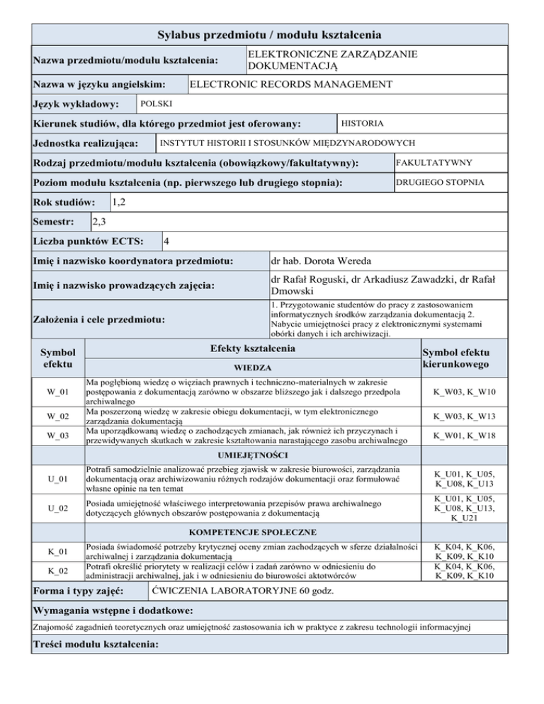 Sylabus przedmiotu / modułu kształcenia Nazwa przedmiotu/modułu kształcenia: Nazwa w języku angielskim: Język wykładowy: ELEKTRONICZNE ZARZĄDZANIE DOKUMENTACJĄ ELECTRONIC RECORDS MANAGEMENT POLSKI Kierunek studiów, dla którego przedmiot jest oferowany: Jednostka realizująca: HISTORIA INSTYTUT HISTORII I STOSUNKÓW MIĘDZYNARODOWYCH Rodzaj przedmiotu/modułu kształcenia (obowiązkowy/fakultatywny): FAKULTATYWNY Poziom modułu kształcenia (np. pierwszego lub drugiego stopnia): DRUGIEGO STOPNIA Rok studiów: Semestr: 1,2 2,3 Liczba punktów ECTS: 4 Imię i nazwisko koordynatora przedmiotu: dr hab. Dorota Wereda Imię i nazwisko prowadzących zajęcia: dr Rafał Roguski, dr Arkadiusz Zawadzki, dr Rafał Dmowski Założenia i cele przedmiotu: 1. Przygotowanie studentów do pracy z zastosowaniem informatycznych środków zarządzania dokumentacją 2. Nabycie umiejętności pracy z elektronicznymi systemami obórki danych i ich archiwizacji. Efekty kształcenia Symbol efektu W_01 W_02 W_03 WIEDZA Ma pogłębioną wiedzę o więziach prawnych i techniczno-materialnych w zakresie postępowania z dokumentacją zarówno w obszarze bliższego jak i dalszego przedpola archiwalnego Ma poszerzoną wiedzę w zakresie obiegu dokumentacji, w tym elektronicznego zarządzania dokumentacją Ma uporządkowaną wiedzę o zachodzących zmianach, jak również ich przyczynach i przewidywanych skutkach w zakresie kształtowania narastającego zasobu archiwalnego Symbol efektu kierunkowego K_W03, K_W10 K_W03, K_W13 K_W01, K_W18 UMIEJĘTNOŚCI U_01 Potrafi samodzielnie analizować przebieg zjawisk w zakresie biurowości, zarządzania dokumentacją oraz archiwizowaniu różnych rodzajów dokumentacji oraz formułować własne opinie na ten temat K_U01, K_U05, K_U08, K_U13 U_02 Posiada umiejętność właściwego interpretowania przepisów prawa archiwalnego dotyczących głównych obszarów postępowania z dokumentacją K_U01, K_U05, K_U08, K_U13, K_U21 KOMPETENCJE SPOŁECZNE K_01 K_02 Posiada świadomość potrzeby krytycznej oceny zmian zachodzących w sferze działalności archiwalnej i zarządzania dokumentacją Potrafi określić priorytety w realizacji celów i zadań zarówno w odniesieniu do administracji archiwalnej, jak i w odniesieniu do biurowości aktotwórców Forma i typy zajęć: K_K04, K_K06, K_K09, K_K10 K_K04, K_K06, K_K09, K_K10 ĆWICZENIA LABORATORYJNE 60 godz. Wymagania wstępne i dodatkowe: Znajomość zagadnień teoretycznych oraz umiejętność zastosowania ich w praktyce z zakresu technologii informacyjnej Treści modułu kształcenia: Semestr 2: 1. Charakterystyka podstawowej literatury z zakresu dokumentacji elektronicznej oraz elektronicznego obiegu dokumentacji. 2. Historia dokumentacji elektronicznej oraz elektronicznego obiegu dokumentacji na świecie i w Polsce. 3. Przepisy prawne regulujące funkcjonowanie dokumentu elektronicznego oraz elektronicznego obiegu dokumentacji w Polsce. 4. Podstawowe pojęcia odnoszące się do dokumentacji elektronicznej i elektronicznego obiegu dokumentacji. 5. Minimalne warunki techniczne niezbędne do posługiwania się dokumentacją elektroniczną. 6. Struktura dokumentu elektronicznego w rozumieniu ustawy z dnia 17 lutego 2005 r. o informatyzacji działalności podmiotów realizujących zadania publiczne. 7. Korzyści i niebezpieczeństwa wynikające z posługiwania się dokumentacją elektroniczną. 8. Popularyzacja dokumentacji elektronicznej. 9. Archiwizowanie materiałów archiwalnych wchodzących w skład państwowego zasobu archiwalnego mających postać dokumentacji elektronicznej. 10. Rekapitulacja materiału i zaliczenie semestru. Semestr 3: 1. Minimalne warunki techniczne niezbędne do wdrożenia elektronicznego obiegu dokumentacji w jednostce organizacyjnej. 2. Elektroniczne zarządzanie dokumentacją w rozumieniu ustawy z dnia 17 lutego 2005 r. o informatyzacji działalności podmiotów realizujących zadania publiczne. 3. Podpis elektroniczny. 4. Korzyści i niebezpieczeństwa wynikające z wdrożenia elektronicznego obiegu dokumentacji. 5. Popularyzacja elektronicznego zarządzania dokumentacją. 6. Oprogramowanie do elektronicznego obiegu dokumentacji i archiwizacji dokumentacji elektronicznej. 7. Wizyta w jednostce organizacyjnej, w której wdrożono elektroniczny obieg dokumentacji. 8. Dokumentacja elektroniczna w warsztacie historyka. 9. Rekapitulacja materiału i zaliczenie semestru. Literatura podstawowa: Gałach A., Instrukcja postępowania z dokumentami elektronicznymi organów państwowych i państwowych jednostek organizacyjnych, organów jednostek samorządu terytorialnego i samorządowych jednostek organizacyjnych z komentarzem, Gdańsk 2007. Literatura dodatkowa: Janowski J., Podpis elektroniczny w obrocie prawnym, Warszawa-Kraków 2007. Janowski J., Technologia informacyjna dla prawników i administratywistów. Szanse i zagrożenia elektronicznego przetwarzania danych w obrocie prawnym i działaniu administracji, Warszawa 2009. Janowski J., Kontrakty elektroniczne w obrocie prawnym, Warszawa 2008. Monarcha-Matlak A., Obowiązki administracji w komunikacji elektronicznej, Warszawa 2008 Planowane formy/działania/metody dydaktyczne: Ćwiczenia laboratoryjne, sprawdzanie zakresu opanowanej wiedzy oraz zastosowanie opanowanej teorii w praktyce posługiwania się dokumentem elektronicznym oraz elektronicznym obiegiem dokumentacji. Sposoby weryfikacji efektów kształcenia osiąganych przez studenta: Weryfikacja efektów kształcenia następuję w trakcie zajęć ze studentami poprzez wypowiedzi ustne, sprawdziany pisemne, sprawdzanie pracy domowej, ocenę wygłoszonych referatów. Forma i sposób zaliczenia: Ocena przedmiotu stanowi średnią arytmetyczną ocen cząstkowych. W trakcie obu semestrów student musi wygłosić co najmniej jeden referat. Studentowi przysługuje na koniec semestru jednorazowa poprawa tylko jednego sprawdzianu pisemnego. Sprawdziany pisemne punktowane i oceniane na podstawie skali proc
