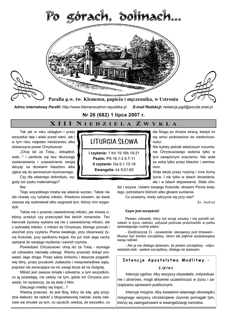 Nr 26 (682)/1 PO GÓRACH, DOLINACH... 1 lipca 2007 r. Parafia p.w. św. Klemensa, papieŜa i męczennika, w Ustroniu Adres internetowy Parafii: http://www.klemensustron.republika.pl E-mail Redakcji: [email protected] Nr 26 (682) 1 lipca 2007 r. X I I I N I E D Z I E L A Z W Y K Ł A Tak jak w roku ubiegłym i przez dla Niego po drodze stracą, kiedyś im wszystkie lata i wieki przed nami, tak i się wróci podniesione do nieskończow tym roku niejeden młodzieniec albo ności. dziewczyna powie Chrystusowi: Nie byłoby jednak właściwym rozumie„Chcę iść za Tobą... dokądkolnie Chrystusowego wołania tylko w I czytanie: 1 Krl 19,16b.19-21 wiek..." i zamknie się bez dłuŜszego tym zawęŜonym znaczeniu. Nie woła Psalm: PS 16,1-2.5.7-11 zastanawiania i uzasadniania swojej za sobą tylko przez klasztor i seminaII czytanie: Ga 5,1.13-18 decyzji za drzwiami klasztoru albo rium. Ewangelia: Łk 9,51-62 zgłosi się do seminarium duchownego. Woła takŜe przez rodzinę i inne formy Czy dla własnego dobrobytu, wyŜycia. I nie tylko w latach dorastania, gody lub zysku materialnego? ale i w latach dojrzewania. Stale choNie. dzi i wzywa. Ustami swojego Kościoła, słowami Pisma święTego wszystkiego trzeba się właśnie wyrzec. TakŜe nie tego, potrzebami bliźnich albo głosem sumienia. dla chwały czy ludzkiej miłości. Wiadomo bowiem, Ŝe świat Co powiemy, kiedy zatrzyma się przy nas? zawsze się wyśmiewał albo wygraŜał tym, którzy nim wzgarKs. Andrzej dzili. Czym jest szczęście! TakŜe nie z powodu zawiedzionej miłości, jak mówią ci, którzy przeŜyli czy przeczytali ileś tanich romansów. Ten Pewien człowiek, który był wciąŜ smutny i nie potrafił odkierunek Ŝyciowy wybiera się nie z zawiedzionej miłości, ale naleźć w Ŝyciu radości, usłyszał podczas przechadzki w parku śpiewającego cudnie ptaka: z wytrwałej miłości, z miłości do Chrystusa, którego poznali i - Zazdroszczę Ci - powiedział, stanąwszy pod drzewem ukochali przy czytaniu Pisma świętego, przy obserwacji ŜyMusisz być bardzo szczęśliwy, skoro tak pięknie wyśpiewujesz cia Kościoła, przy spotkaniu kogoś, kto juŜ miał Jego cechy swoja radość. wpisane do swojego myślenia i swoich czynów. - Ale ja nie dlatego śpiewam, Ŝe jestem szczęśliwy - odpoPowiedzieć Chrystusowi: chcę iść za Tobą - wymaga wiedział ptak - jestem szczęśliwy, dlatego Ŝe śpiewam. od człowieka niemałej odwagi. Wiemy przecieŜ dokąd prowadzi Jego droga. Przez salwy śmiechu i deszcze pogardliIntencje Apostolstwa Modlitwy wej śliny, przez pocałunki Judaszów i niesprawiedliwe sądy, poprzez nie zwracające na nic uwagi bicze aŜ na Golgotę. Lipiec Miłość jest zawsze śmiała i odwaŜna, a tym wszystkim, Intencja ogólna: Aby wszyscy obywatele, indywidualco ją posiadają, nie zaleŜy na tym, gdzie ich Chrystus pronie i zbiorowo, mogli aktywnie uczestniczyć w Ŝyciu i zawadzi. Im wystarczy, Ŝe są stale z Nim. rządzaniu sprawami publicznymi. Dlaczego mieliby się trapić...? Intencja misyjna: Aby świadomi własnego obowiązku Wiedzą przecieŜ, Ŝe jest Bóg, który da siłę, gdy przyjdzie słabość; da radość z błogosławionej nadziei, kiedy odemisyjnego wszyscy chrześcijanie czynnie pomagali tym, zwie się smutek za tym, co opuścili; wiedzą, Ŝe wszystko, co którzy są zaangaŜowani w ewangelizację narodów. LITURGIA SŁOWA Nr 26 (682)/2 PO GÓRACH, DOLINACH... Z ŻYCIA P ARAFI i w OKRESIE 01. 04. 2007 - 30. 06. 2007 - Kostka Krzysztof i Surma Barbara; - Jurasz Jacek i Wawrzacz Magdalena; - Ostafin Krzysztof i Legierska Anna; - Hadaszczak Andrzej i Macura Agata; - Pecka Piotr i Argalska Michalina - Czyba Marek i Początek Wiesława; - Korcz Jan; - Capińska Laura; - Krzywda Tycjan; - Śliwka Dawid; - Łuka Mikołaj; - Wnętrzak Hanna; - Praski Kacper; - Folwarczny Jakub; - Puzoń Piotr; - Juraszek Jakub; - Sztuka Karolina; - Białek Kacper; - Lipowczan Natalia; - Grabowski Rajmund; - Brudny Mieczysław; - Halski Romuald; - Naczas Krystyna; - Pydych Helena; - Dziwisz Anna; - Rosa Agnieszka; - Minkus Stefan; - Chlebik Wanda; - Schilleny-Rottermund Maria; - Michalak Władysław; Galas Joanna; 1 lipca 2007 r. Postna wstrzemięźliwość dzisiaj Gdzie dzisiaj przestrzega się postu? Ledwo tam, gdzie tego najbardziej oczekujemy, w klasztorach. Tam będzie wymienionych wiele powodów, dlaczego dzisiaj nie naleŜy pościć, jak kiedyś przewidziano w regule św. Benedykta z Nursji czy u św. Franciszka z AsyŜu. Trzeba więcej pracować niŜ dawniej, ludzie nie są tak zdrowi jak kiedyś. Przeciwko temu mają doświadczenia postne młodzi ludzie, chrześcijanie i niechrześcijanie. Stosują praktyki postne z rozmaitych powodów; poszczą dla pokoju, dla poszanowania Ŝycia. Post staje się środkiem i znakiem zaangaŜowania się dla wielu celów. Niektórzy poszczą, Ŝeby przekonać siebie o zapanowaniu nad sobą. Inni praktykują post dla celów dobra społecznego. Rezygnują z jedzenia i picia, aby pomagać innym. Jeszcze inni poszczą po to, by zintensyfikować własną modlitwę i dla szukania sposobów przełoŜenia Słowa BoŜego na codzienny styl Ŝycia. Ponadto jest wielu, którzy podejmują post ze względów zdrowotnych. Jadają mniej, dla utrzymania smukłej sylwetki, czaee4m poddają się kuracji postnej dla uwolnienia się z róŜnych chorób, zwłaszcza z takich, w stosunku do których tradycyjna medycyna jest bezradna. Istnieją teŜ pewne ujemne skutki stosowania praktyki postnej; tak jak kaŜdy środek, równieŜ i post, kiedy przekracza się odpowiednią miarę, staje się niebezpiecznym. Pierwsze niebezpieczeństwo bierze się z postawy zaprzeczającej Ŝyciu. Człowiek nadmiernie poszczący niczego przyjemnego sobie nie Ŝyczy, poniewaŜ ktoś gdzieś w świecie głoduje. Chodzi wszędzie z niespokojnym sumieniem, czy nie mógłby sobie jeszcze więcej odmówić. Rezygnuje z wielu wygód, Ŝeby innym na stole dopomagać. Odmawia sobie wielu przyjemności, by