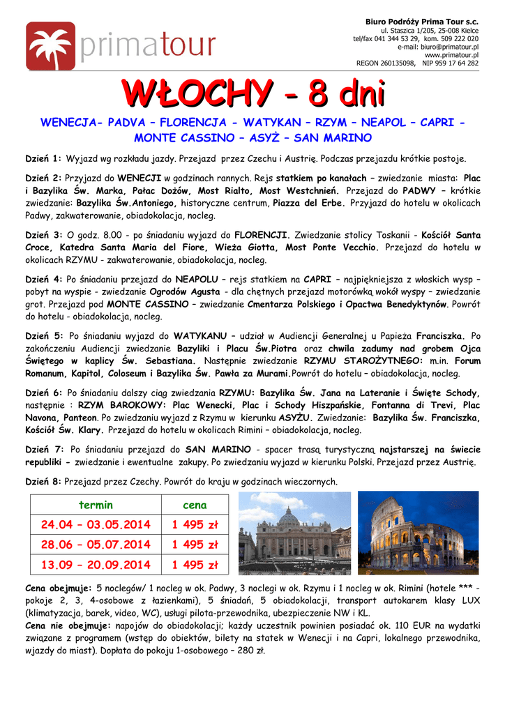 Biuro Podróży Prima Tour s.c. ul. Staszica 1/205, 25-008 Kielce tel/fax 041 344 53 29, kom. 509 222 020 e-mail: [email protected] www.primatour.pl REGON 260135098, NIP 959 17 64 282 WŁOCHY - 8 dni WENECJA- PADVA – FLORENCJA - WATYKAN – RZYM – NEAPOL – CAPRI MONTE CASSINO – ASYŻ – SAN MARINO Dzień 1: Wyjazd wg rozkładu jazdy. Przejazd przez Czechu i Austrię. Podczas przejazdu krótkie postoje. Dzień 2: Przyjazd do WENECJI w godzinach rannych. Rejs statkiem po kanałach – zwiedzanie miasta: Plac i Bazylika Św. Marka, Pałac Dożów, Most Rialto, Most Westchnień. Przejazd do PADWY – krótkie zwiedzanie: Bazylika Św.Antoniego, historyczne centrum, Piazza del Erbe. Przyjazd do hotelu w okolicach Padwy, zakwaterowanie, obiadokolacja, nocleg. Dzień 3: O godz. 8.00 - po śniadaniu wyjazd do FLORENCJI. Zwiedzanie stolicy Toskanii - Kościół Santa Croce, Katedra Santa Maria del Fiore, Wieża Giotta, Most Ponte Vecchio. Przejazd do hotelu w okolicach RZYMU - zakwaterowanie, obiadokolacja, nocleg. Dzień 4: Po śniadaniu przejazd do NEAPOLU – rejs statkiem na CAPRI – najpiękniejsza z włoskich wysp – pobyt na wyspie - zwiedzanie Ogrodów Agusta - dla chętnych przejazd motorówką wokół wyspy – zwiedzanie grot. Przejazd pod MONTE CASSINO – zwiedzanie Cmentarza Polskiego i Opactwa Benedyktynów. Powrót do hotelu - obiadokolacja, nocleg. Dzień 5: Po śniadaniu wyjazd do WATYKANU – udział w Audiencji Generalnej u Papieża Franciszka. Po zakończeniu Audiencji zwiedzanie Bazyliki i Placu Św.Piotra oraz chwila zadumy nad grobem Ojca Świętego w kaplicy Św. Sebastiana. Następnie zwiedzanie RZYMU STAROŻYTNEGO: m.in. Forum Romanum, Kapitol, Coloseum i Bazylika Św. Pawła za Murami.Powrót do hotelu – obiadokolacja, nocleg. Dzień 6: Po śniadaniu dalszy ciąg zwiedzania RZYMU: Bazylika Św. Jana na Lateranie i Święte Schody, następnie : RZYM BAROKOWY: Plac Wenecki, Plac i Schody Hiszpańskie, Fontanna di Trevi, Plac Navona, Panteon. Po zwiedzaniu wyjazd z Rzymu w kierunku ASYŻU. Zwiedzanie: Bazylika Św. Franciszka, Kościół Św. Klary. Przejazd do hotelu w okolicach Rimini – obiadokolacja, nocleg. Dzień 7: Po śniadaniu przejazd do SAN MARINO - spacer trasą turystyczną najstarszej na świecie republiki - zwiedzanie i ewentualne zakupy. Po zwiedzaniu wyjazd w kierunku Polski. Przejazd przez Austrię. Dzień 8: Przejazd przez Czechy. Powrót do kraju w godzinach wieczornych. termin cena 24.04 – 03.05.2014 1 495 zł 28.06 – 05.07.2014 1 495 zł 13.09 – 20.09.2014 1 495 zł Cena obejmuje: 5 noclegów/ 1 nocleg w ok. Padwy, 3 noclegi w ok. Rzymu i 1 nocleg w ok. Rimini (hotele *** pokoje 2, 3, 4-osobowe z łazienkami), 5 śniadań, 5 obiadokolacji, transport autokarem klasy LUX (klimatyzacja, barek, video, WC), usługi pilota-przewodnika, ubezpieczenie NW i KL. Cena nie obejmuje: napojów do obiadokolacji; każdy uczestnik powinien posiadać ok. 110 EUR na wydatki związane z programem (wstęp do obiektów, bilety na statek w Wenecji i na Capri, lokalnego przewodnika, wjazdy do miast). Dopłata do pokoju 1-osobowego – 280 zł.