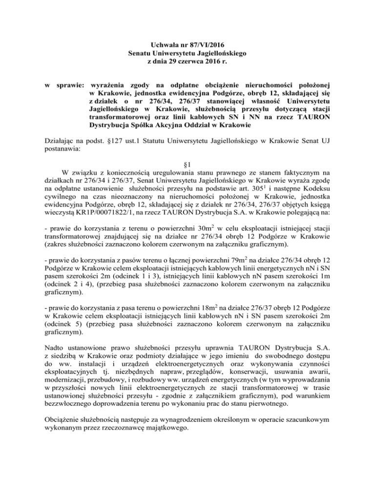 Uchwała nr 87/VI/2016 Senatu Uniwersytetu Jagiellońskiego z dnia 29 czerwca 2016 r. w sprawie: wyrażenia zgody na odpłatne obciążenie nieruchomości położonej w Krakowie, jednostka ewidencyjna Podgórze, obręb 12, składającej się z działek o nr 276/34, 276/37 stanowiącej własność Uniwersytetu Jagiellońskiego w Krakowie, służebnością przesyłu dotyczącą stacji transformatorowej oraz linii kablowych SN i NN na rzecz TAURON Dystrybucja Spółka Akcyjna Oddział w Krakowie Działając na podst. §127 ust.1 Statutu Uniwersytetu Jagiellońskiego w Krakowie Senat UJ postanawia: §1 W związku z koniecznością uregulowania stanu prawnego ze stanem faktycznym na działkach nr 276/34 i 276/37, Senat Uniwersytetu Jagiellońskiego w Krakowie wyraża zgodę na odpłatne ustanowienie służebności przesyłu na podstawie art. 3051 i następne Kodeksu cywilnego na czas nieoznaczony na nieruchomości położonej w Krakowie, jednostka ewidencyjna Podgórze, obręb 12, składającej się z działek nr 276/34, 276/37 objętych księgą wieczystą KR1P/00071822/1, na rzecz TAURON Dystrybucja S.A. w Krakowie polegającą na: - prawie do korzystania z terenu o powierzchni 30m2 w celu eksploatacji istniejącej stacji transformatorowej znajdującej się na działce nr 276/34 obręb 12 Podgórze w Krakowie (zakres służebności zaznaczono kolorem czerwonym na załączniku graficznym). - prawie do korzystania z pasów terenu o łącznej powierzchni 79m2 na działce 276/34 obręb 12 Podgórze w Krakowie celem eksploatacji istniejących kablowych linii energetycznych nN i SN pasem szerokości 2m (odcinek 1 i 3), istniejących linii kablowych nN pasem szerokości 1m (odcinek 2 i 4), (przebieg pasa służebności zaznaczono kolorem czerwonym na załączniku graficznym). - prawie do korzystania z pasa terenu o powierzchni 18m2 na działce 276/37 obręb 12 Podgórze w Krakowie celem eksploatacji istniejących linii kablowych nN i SN pasem szerokości 2m (odcinek 5) (przebieg pasa służebności zaznaczono kolorem czerwonym na załączniku graficznym). Nadto ustanowione prawo służebności przesyłu uprawnia TAURON Dystrybucja S.A. z siedzibą w Krakowie oraz podmioty działające w jego imieniu do swobodnego dostępu do ww. instalacji i urządzeń elektroenergetycznych oraz wykonywania czynności eksploatacyjnych tj. niezbędnych napraw, przeglądów, konserwacji, usuwania awarii, modernizacji, przebudowy, i rozbudowy ww. urządzeń energetycznych (w tym wyprowadzania w przyszłości nowych linii elektroenergetycznych ze stacji transformatorowej w trasie ustanowionej służebności przesyłu - zgodnie z załącznikiem graficznym), pod warunkiem bezzwłocznego doprowadzenia terenu po wykonaniu prac do stanu pierwotnego. Obciążenie służebnością następuje za wynagrodzeniem określonym w operacie szacunkowym wykonanym przez rzeczoznawcę majątkowego. §2 Wykonanie uchwały powierza się JM Rektorowi Uniwersytetu Jagiellońskiego w Krakowie. §3 Uchwała wchodzi w życie z dniem podjęcia.