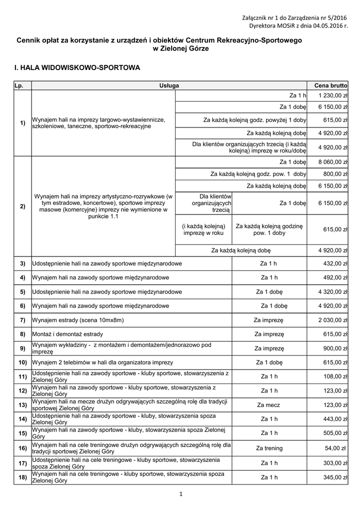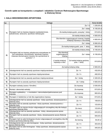 Załącznik nr 1 do Zarządzenia nr 5/2016 Dyrektora MOSiR z dnia 04.05.2016 r. Cennik opłat za korzystanie z urządzeń i obiektów Centrum Rekreacyjno-Sportowego w Zielonej Górze I. HALA WIDOWISKOWO-SPORTOWA Lp. 1) 2) Usługa Cena brutto Wynajem hali na imprezy targowo-wystawiennicze, szkoleniowe, taneczne, sportowo-rekreacyjne Wynajem hali na imprezy artystyczno-rozrywkowe (w tym estradowe, koncertowe), sportowe imprezy masowe (komercyjne) imprezy nie wymienione w punkcie 1.1 Za 1 h 1 230,00 zł Za 1 dobę 6 150,00 zł Za każdą kolejną godz. powyżej 1 doby 615,00 zł Za każdą kolejną dobę 4 920,00 zł Dla klientów organizujących trzecią (i każdą kolejną) imprezę w roku/dobę 4 920,00 zł Za 1 dobę 8 060,00 zł Za każdą kolejną godz. pow. 1 doby 800,00 zł Za każdą kolejną dobę 6 150,00 zł Za 1 dobę 6 150,00 zł Dla klientów organizujących trzecią (i każdą kolejną) imprezę w roku Za każdą kolejną godzinę pow. 1 doby Za każdą kolejną dobę 615,00 zł 4 920,00 zł 3) Udostępnienie hali na zawody sportowe międzynarodowe Za 1 h 432,00 zł 4) Wynajem hali na zawody sportowe międzynarodowe Za 1 h 492,00 zł 5) Udostępnienie hali na zawody sportowe międzynarodowe 6) Wynajem hali na zawody sportowe międzynarodowe 7) Wynajem estrady (scena 10mx8m) Za imprezę 2 030,00 zł 8) Montaż i demontaż estrady Za imprezę 615,00 zł 9) Wynajem wykładziny - z montażem i demontażem/jednorazowo pod imprezę Za imprezę 900,00 zł Za 1 dobę 615,00 zł Za 1 h 108,00 zł Za 1 h 123,00 zł Za mecz 123,00 zł Za 1 h 443,00 zł Za 1 h 505,00 zł Za trening 54,00 zł Za 1 h 303,00 zł Za 1 h 345,00 zł Za 1 dobę 10) Wynajem 2 telebimów w hali dla organizatora imprezy 11) 12) 13) 14) 15) 16) 17) 18) Za 1 dobę Udostępnienie hali na zawody sportowe - kluby sportowe, stowarzyszenia z Zielonej Góry Wynajem hali na zawody sportowe - kluby sportowe, stowarzyszenia z Zielonej Góry Wynajem hali na mecze drużyn odgrywających szczególną rolę dla tradycji sportowej Zielonej Góry Udostępnienie hali na zawody sportowe - kluby, stowarzyszenia spoza Zielonej Góry Wynajem hali na zawody sportowe - kluby, stowarzyszenia spoza Zielonej Góry Wynajem hali na cele treningowe drużyn odgrywających szczególną rolę dla tradycji sportowej Zielonej Góry Udostępnienie hali na cele treningowe - kluby sportowe, stowarzyszenia spoza Zielonej Góry Wynajem hali na cele treningowe - kluby sportowe, stowarzyszenia spoza Zielonej Góry 1 4 320,00 zł 4 920,00 zł Załącznik nr 1 do Zarządzenia nr 5/2016 Dyrektora MOSiR z dnia 04.05.2016 r. 19) Udostępnienie hali na imprezy rekreacyjno-sportowe i inne wg uzgodnień indywidualnych 20) Wynajem hali na imprezy rekreacyjno-sportowe Za 1 h 638,00 zł Za 1 h 726,00 zł 21) Udostępnienie hali na cele treningowe - klienci indywidualni oraz inne grupy zorganizowane z Zielonej Góry Za 1 h 443,00 zł 22) Wynajem hali na cele treningowe - klienci indywidualni oraz inne grupy zorganizowane z Zielonej Góry Za 1 h 505,00 zł 23) Udostępnienie hali na cele treningowe - klienci indywidualni oraz inne grupy zorganizowane spoza Zielonej Góry Za 1 h 594,00 zł 24) Wynajem hali na cele treningowe - klienci indywidualni oraz inne grupy zorganizowane spoza Zielonej Góry Za 1 h 677,00 zł Za 1 h 100,00 zł 25) Wynajem sali konferencyjnej (do 30 osób) 26) Obsługa techniczna i sprzątająca Za 1 dobę 1 476,00 zł 27) Koszty związane z przywróceniem do stanu gotowości klap dymowych Za imprezę 123 000,00 zł Uwaga: Powyższe ceny nie zawierają kosztów zużycia mediów. II. SALA ROZGRZEWKOWA Lp. Usługa Cena brutto 1) Udostępnienie sali na zajęcia wychowania fizycznego jednostki z Zielonej Góry Za 1 h 60,00 zł 2) Udostępnienie sali na cele treningowe – kluby sportowe, stowarzyszenia spoza Zielonej Góry Za 1 h 206,00 zł 3) Wynajem sali na cele treningowe – kluby sportowe, stowarzyszenia spoza Zielonej Góry Za 1 h 234,00 zł 4) Udostępnienie sali na mecze niższej rangi - kluby sportowe, stowarzyszenia spoza Zielonej Góry Za 1 h 303,00 zł 5) Wynajem sali na mecze niższej rangi - kluby sportowe, stowarzyszenia spoza Zielonej Góry Za 1 h 345,00 zł 6) Udostępnienie sali na imprezy rekreacyjno-sportowe Za 1 h 270,00 zł 7) Wynajem sali na imprezy rekreacyjno-sportowe Za 1 h 308,00 zł 8) Udostępnienie sali na cele treningowe - klienci indywidualni oraz inne grupy zorganizowane z Zielonej Góry Za 1 h 130,00 zł 9) Wynajem sali na cele treningowe - klienci indywidualni oraz inne grupy zorganizowane z Zielonej Góry Za 1 h 148,00 zł 10) Udostępnienie sali na cele treningowe - klienci indywidualni oraz inne grupy zorganizowane spoza Zielonej Góry Za 1 h 216,00 zł 11) Wynajem sali na cele treningowe - klienci indywidualni oraz inne grupy zorganizowane spoza Zielonej Góry Za 1 h 246,00 zł 2 Załącznik nr 1 do Zarządzenia nr 5/2016 Dyrektora MOSiR z dnia 04.05.2016 r. III. BASEN KRYTY Lp. 1) 0-1h Usługa 0 - 2h Powyżej 2h Cena brutto Do godz.15.00 BILET NORMALNY Poniedziałek – piątek 8,00 zł 10,00 zł Po godz. 15.00 12,00 zł 2) BILET NORMALNY Sobota, niedziela, święta 10,00 zł 15,00 zł 0,30 zł/min Do godz.15.00 3) BILET ULGOWY * 6,00 zł Poniedziałek – piątek 8,00 zł Po godz. 15.00 10,00 zł 4) BILET ULGOWY * 8,00 zł Sobota, niedziela, święta 2. BILET CAŁODNIOWY 12,00 zł (ważny jeden dzień) Cena brutto Lp. Rodzaj biletu 1) NORMALNY 40,00 zł 48,00 zł 2) ULGOWY * 36,00 zł 44,00 zł od poniedziałku do sobota, niedziela, święta piątku * Dzieci i młodzież szkolna oraz studencka do lat 26 (po okazaniu ważnej legitymacji szkolnej lub studenckiej), osoby niepełnosprawne (na podstawie dokumentów potwierdzających niepełnosprawność), emeryci i renciści (po okazaniu ważnej legitymacji), osoby po 60 roku życia (po okazaniu dowodu tożsamości). 3. BILETY DLA GRUP ZORGANIZOWANYCH Lp. 0 – 85 min. Usługa 86-145 min. Powyżej 145 min. Cena brutto 1) SZKOŁY z miasta Zielona Góra, Grupy zorgan
