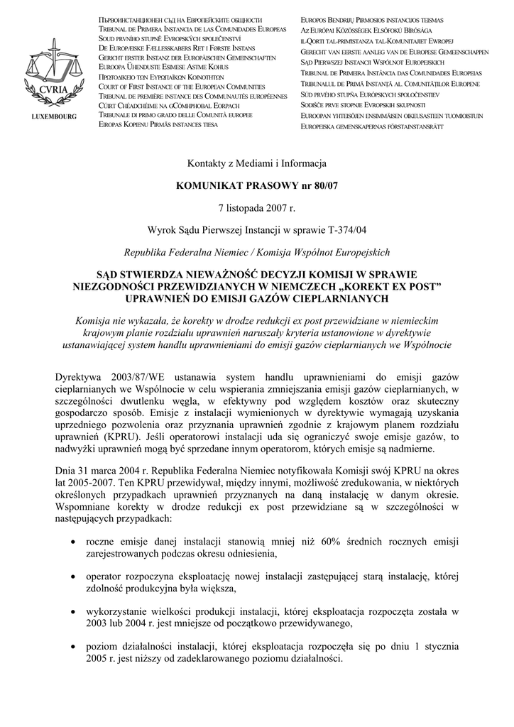 ПЪРВОИНСТАНЦИОНЕН СЪД НА ЕВРОПЕЙСКИТЕ ОБЩНОСТИ TRIBUNAL DE PRIMERA INSTANCIA DE LAS COMUNIDADES EUROPEAS SOUD PRVNÍHO STUPNĚ EVROPSKÝCH SPOLEČENSTVÍ DE EUROPÆISKE FÆLLESSKABERS RET I FØRSTE INSTANS GERICHT ERSTER INSTANZ DER EUROPÄISCHEN GEMEINSCHAFTEN EUROOPA ÜHENDUSTE ESIMESE ASTME KOHUS ΠΡΩΤΟ∆ΙΚΕΙΟ ΤΩΝ ΕΥΡΩΠΑΪΚΩΝ ΚΟΙΝΟΤΗΤΩΝ COURT OF FIRST INSTANCE OF THE EUROPEAN COMMUNITIES TRIBUNAL DE PREMIÈRE INSTANCE DES COMMUNAUTÉS EUROPÉENNES CÚIRT CHÉADCHÉIME NA GCÓMHPHOBAL EORPACH TRIBUNALE DI PRIMO GRADO DELLE COMUNITÀ EUROPEE EIROPAS KOPIENU PIRMĀS INSTANCES TIESA EUROPOS BENDRIJŲ PIRMOSIOS INSTANCIJOS TEISMAS Az EURÓPAI KÖZÖSSÉGEK ELSŐFOKÚ BÍRÓSÁGA IL-QORTI TAL-PRIM'ISTANZA TAL-KOMUNITAJIET EWROPEJ GERECHT VAN EERSTE AANLEG VAN DE EUROPESE GEMEENSCHAPPEN SĄD PIERWSZEJ INSTANCJI WSPÓLNOT EUROPEJSKICH TRIBUNAL DE PRIMEIRA INSTÂNCIA DAS COMUNIDADES EUROPEIAS TRIBUNALUL DE PRIMĂ INSTANŢĂ AL. COMUNITĂŢILOR EUROPENE SÚD PRVÉHO STUPŇA EURÓPSKYCH SPOLOČENSTIEV SODIŠČE PRVE STOPNJE EVROPSKIH SKUPNOSTI EUROOPAN YHTEISÖJEN ENSIMMÄISEN OIKEUSASTEEN TUOMIOISTUIN EUROPEISKA GEMENSKAPERNAS FÖRSTAINSTANSRÄTT Kontakty z Mediami i Informacja KOMUNIKAT PRASOWY nr 80/07 7 listopada 2007 r. Wyrok Sądu Pierwszej Instancji w sprawie T-374/04 Republika Federalna Niemiec / Komisja Wspólnot Europejskich SĄD STWIERDZA NIEWAŻNOŚĆ DECYZJI KOMISJI W SPRAWIE NIEZGODNOŚCI PRZEWIDZIANYCH W NIEMCZECH „KOREKT EX POST” UPRAWNIEŃ DO EMISJI GAZÓW CIEPLARNIANYCH Komisja nie wykazała, że korekty w drodze redukcji ex post przewidziane w niemieckim krajowym planie rozdziału uprawnień naruszały kryteria ustanowione w dyrektywie ustanawiającej system handlu uprawnieniami do emisji gazów cieplarnianych we Wspólnocie Dyrektywa 2003/87/WE ustanawia system handlu uprawnieniami do emisji gazów cieplarnianych we Wspólnocie w celu wspierania zmniejszania emisji gazów cieplarnianych, w szczególności dwutlenku węgla, w efektywny pod względem kosztów oraz skuteczny gospodarczo sposób. Emisje z instalacji wymienionych w dyrektywie wymagają uzyskania uprzedniego pozwolenia oraz przyznania uprawnień zgodnie z krajowym planem rozdziału uprawnień (KPRU). Jeśli operatorowi instalacji uda się ograniczyć swoje emisje gazów, to nadwyżki uprawnień mogą być sprzedane innym operatorom, których emisje są nadmierne. Dnia 31 marca 2004 r. Republika Federalna Niemiec notyfikowała Komisji swój KPRU na okres lat 2005-2007. Ten KPRU przewidywał, między innymi, możliwość zredukowania, w niektórych określonych przypadkach uprawnień przyznanych na daną instalację w danym okresie. Wspomniane korekty w drodze redukcji ex post przewidziane są w szczególności w następujących przypadkach: • roczne emisje danej instalacji stanowią mniej niż 60% średnich rocznych emisji zarejestrowanych podczas okresu odniesienia, • operator rozpoczyna eksploatację nowej instalacji zastępującej starą instalację, której zdolność produkcyjna była większa, • wykorzystanie wielkości produkcji instalacji, której eksploatacja rozpoczęta została w 2003 lub 2004 r. jest mniejsze od początkowo przewidywanego, • poziom działalności instalacji, której eksploatacja rozpoczęła się po dniu 1 stycznia 2005 r. jest niższy od zadeklarowanego poziomu działalności. Niemiecki KPRU przewiduje poza tym, że nieprzydzielone lub odebrane uprawnienia do emisji są przenoszone do rezerwy. Uprawnienia te są dostępne dla nowych operatorów znajdujących się na terytorium Niemiec. Na mocy decyzji z dnia 7 lipca 2004 r. Komisja uznała niemiecki KPRU w takim zakresie w jakim przewidywał on pewne korekty ex post za niezgodny z niektórymi kryteriami zawartymi w załączniku III do dyrektywy i zażądała ich usunięcia. Republika Federalna Niemiec wniosła do Sądu o stwierdzenie nieważności tej decyzji. W swoim dzisiejszym wyroku Sąd, zbadał zgodność z prawem dokonanej przez Komisję oceny korekt ex post przewidzianych w niemieckim KPRU w odniesieniu do jakoby naruszonych kryteriów. Wymóg, zgodnie z którym KPRU powinien zawierać wykaz instalacji objętych dyrektywą wraz z ilościami uprawnień przeznaczonych do rozdzielenia każdej z nich (kryterium nr 10) Sąd uznał, że Komisja niewłaściwie określiła znaczenie tego kryterium, rozumianego w świetle celów dyrektywy, ponieważ zakwalifikowała ona sporne korekty ex post jako sprzeczne z systemem i ogólną strukturą tej dyrektywy. Sąd przypomniał, że głównym zadeklarowanym celem jest zmniejszenie, w znaczący sposób, emisji gazów cieplarnianych. W zmierzaniu do tego celu, rozdział uprawnień winien jednak dokonywać się z poszanowaniem „podcelów”, takich jak zachowanie spójności rynku wewnętrznego oraz unikanie zakłóceń konkurencji. Sąd uznał, że sama okoliczność, że sporne korekty ex-post mogą odwieść operatorów od obniżenia ich poziomów produkcji, a w konsekwencji ich poziomów emisji, nie wystarcza by podważyć zgodność z prawem tych korekt w świetle ogółu celów dyrektywy, takich jak utrzymanie korzystnych i efektywnych warunków gospodarczych, zmniejszenie emisji w drodze usprawnień technicznych i zachowanie spójności rynku wewnętrznego oraz utrzymanie warunków konkurencji. Komisja zatem nie wykazała, by zawarty w dyrektywie wymóg wskazania w KPRU uprawnień przeznaczonych do rozdzielenia każdej z instalacji, ograniczał zakres swobody państwa członkowskiego co do form i środków transpozycji tej dyrektywy w prawie krajowym w taki sposób, który zakazywałby zastosowania spornych korekt ex post w Republice Federalnej Niemiec. Zakaz dyskryminacji przedsiębiorstw lub sektorów w sposób, który może niesłusznie sprzyjać niektórym przedsiębiorstwom lub działaniom (kryterium nr 5) Sąd uznał, że Komisja nie wykazała, że korekty ex-post stosujące się do nowych operato