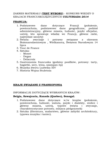 ZAKRES MATERIAŁU (TEST WYBORU) - KONKURS WIEDZY O KRAJACH FRANCUSKOJĘZYCZNYCH CULTURIADA 2014 FRANCJA: 1. Podstawowe dane dotyczące Francji (położenie, powierzchnia, podstawowe dane geograficzne, podział administracyjny, główne miasta, ludność, języki oficjalne, ustrój, kto sprawuje władzę we Francji, główne rzeki, najwyższe szczyty) 2. Święta: zwyczaje i potrawy związane z okresem Bożonarodzeniowym , Wielkanocą, Świętem Narodowym 14 lipca 3. Tour de France 4. Sztuka: - Monet - Degas - Delacroix 5. Gastronomia francuska (godziny posiłków, potrawy: tarty, bagietki, sery, wina, szampan itp) 6. Muzyka dworu Ludwika XIV 7. Historia Wojna Stuletnia KRAJE ZWIĄZANE Z FRANKOFONIĄ INFORMACJE DOTYCZĄCE WYBRANYCH KRAJÓW: Belgia, Szwajcaria, Kanada (Quebec), Senegal. 1. Podstawowe dane dotyczące w/w krajów (położenie, powierzchnia, ludność, waluta, języki i dialekty, stolice i główne miasta, ustrój, typowe święta i zwyczaje, charakterystyczne potrawy, miejsca pielgrzymek) 2. Sztuka (literatura, malarstwo, główne zabytki architektury, typowa muzyka i taniec).