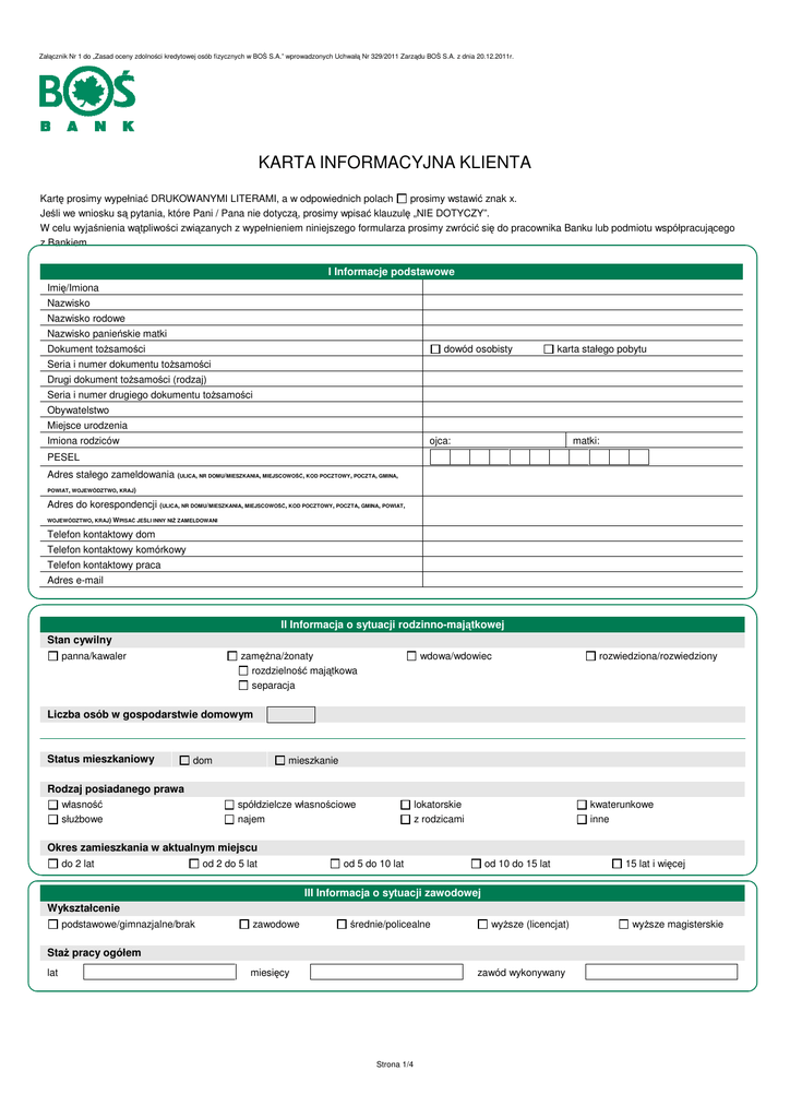 Załącznik Nr 1 do „Zasad oceny zdolności kredytowej osób fizycznych w BOŚ S.A.” wprowadzonych Uchwałą Nr 329/2011 Zarządu BOŚ S.A. z dnia 20.12.2011r. KARTA INFORMACYJNA KLIENTA Kartę prosimy wypełniać DRUKOWANYMI LITERAMI, a w odpowiednich polach prosimy wstawić znak x. Jeśli we wniosku są pytania, które Pani / Pana nie dotyczą, prosimy wpisać klauzulę „NIE DOTYCZY”. W celu wyjaśnienia wątpliwości związanych z wypełnieniem niniejszego formularza prosimy zwrócić się do pracownika Banku lub podmiotu współpracującego z Bankiem. I Informacje podstawowe Imię/Imiona Nazwisko Nazwisko rodowe Nazwisko panieńskie matki Dokument tożsamości dowód osobisty karta stałego pobytu Seria i numer dokumentu tożsamości Drugi dokument tożsamości (rodzaj) Seria i numer drugiego dokumentu tożsamości Obywatelstwo Miejsce urodzenia Imiona rodziców ojca: matki: PESEL Adres stałego zameldowania (ULICA, NR DOMU/MIESZKANIA, MIEJSCOWOŚĆ, KOD POCZTOWY, POCZTA, GMINA, POWIAT, WOJEWÓDZTWO, KRAJ) Adres do korespondencji (ULICA, NR DOMU/MIESZKANIA, MIEJSCOWOŚĆ, KOD POCZTOWY, POCZTA, GMINA, POWIAT, WOJEWÓDZTWO, KRAJ) WPISAĆ JEŚLI INNY NIŻ ZAMELDOWANI Telefon kontaktowy dom Telefon kontaktowy komórkowy Telefon kontaktowy praca Adres e-mail II Informacja o sytuacji rodzinno-majątkowej Stan cywilny panna/kawaler zamężna/żonaty rozdzielność majątkowa separacja wdowa/wdowiec rozwiedziona/rozwiedziony Liczba osób w gospodarstwie domowym Status mieszkaniowy dom mieszkanie Rodzaj posiadanego prawa własność służbowe spółdzielcze własnościowe najem lokatorskie z rodzicami kwaterunkowe inne Okres zamieszkania w aktualnym miejscu do 2 lat od 2 do 5 lat od 5 do 10 lat od 10 do 15 lat 15 lat i więcej III Informacja o sytuacji zawodowej Wykształcenie podstawowe/gimnazjalne/brak zawodowe średnie/policealne wyższe (licencjat) Staż pracy ogółem lat miesięcy zawód wykonywany Strona 1/4 wyższe magisterskie IV Informacja o sytuacji finansowej Okres zatrudnienia u obecnego pracodawcy / prowadzenia działalności w danej branży (lata i miesiące) Źródło dochodu Wysokość średniego m-cznego dochodu netto Zatrudnienie na czas nieokreślony za ost. 3 m-ce Zatrudnienie na czas określony (data) od do za ost. 3 m-ce Działalność gospodarcza: Księga przychodów i rozchodów lub księga rachunkowa -- za ost. 12 m-cy Ryczałt ewidencjonowany -- za ost. 12 m-cy Karta podatkowa -- Renta (data) od Emerytura za ost. 12 m-cy do za ost. m-c -- za ost. m-c Dział specjalny prod. rolnej za ost. 12 m-cy Rolnictwo za ost. 12 m-cy Wolny zawód za ost. 12 m-cy Kontrakt za ost. 6 m-cy Brak źródła dochodu -- -- Najem, dzierżawa nieruchomości -- za ost. 12 m-cy Umowy zlecenia umowy o dzieło -- za ost. 12 m-cy Inne (jakie?) -- za ost. 12 m-cy Częstotliwość uzyskiwania głównego dochodu rocznie tygodniowo półrocznie codziennie kwartalnie inne miesięcznie nieznane co dwa tygodnie Pracodawca o najdłuższym okresie uzyskiwania dochodu jednostka samorządowa prywatna firma – os. prawna administracja państwowa spółdzielnia firma państwowa nie dotyczy prywatna firma – os.fiz. inne (jakie?) Obciążenia dochodu (kwota w skali miesiąca) czynsz, CO, gaz, energia elektryczna opłaty alimenty inne zobowiązania Posiadane rachunki bankowe: Rodzaj (ROR, rach. oszczędnościowe, lokaty, inne) Waluta (nie dot. ROR) Bank Okres posiadania (lata, miesiące) Okres jaki upłynął od otwarcia pierwszego rachunku bankowego typu ROR: nie posiada od 2 lat do mniej niż 5 lat mniej niż 6 m-cy od 5 lat i więcej od 6 m-cy do mniej niż 1 rok od 1 roku do mniej niż 2 lata Posiadane ubezpieczenia indywidualne na życie Nazwa ubezpieczyciela : nieruchomości Nazwa ubezpieczyciela : Posiadany majątek Rodzaj nieruchomości (grunt, dom, mieszkanie, inne) Lokalizacja Zobowiązania finansowe: Zaciągnięte i wnioskowane kredyty/pożyczki (proszę podać wszystkie kredyty i pożyczki poza limitami kredytowymi) Nazwa banku / instytucji Rodzaj kredytu/pożyczki Pozostała do spłaty kwota i waluta zaciągniętego/wnioskowanego kredytu/pożyczki Strona 2/4 Miesięczna spłata (kwota i waluta) Data wygaśnięcia posiadanego lub wnioskowanego zobowiązania Przyznane limity kredytowe (limity w ROR, karty kredytowe, karty z odroczonym terminem płatności) Nazwa banku / instytucji Rodzaj limitu Kwota i waluta limitu Od kiedy posiadana jest karta kredytowa nie posiada od 36 do mniej niż 48 m-cy mniej niż 12 m-cy od 48 m-cy i więcej od 12 do mniej niż 24 m-cy od 24 do mniej niż 36 m-cy Udzielone poręczenia: Rodzaj kredytu/pożyczki/karty/ limitu Nazwa banku / instytucji Kwota kredytu/pożyczki pozostała do spłaty, kwota udzielonego limitu Miesięczna spłata (kwota i waluta) Data wygaśnięcia zobowiązania V Moje powiązania Powiązania kapitałowe i organizacyjne brak powiązań posiadane powiązania (wymienić poniżej) Nazwa, siedziba i forma prawna podmiotu powiązanego Powiązania kapitałowe (% kapitału/%głosów/stanowiska i funkcje/osoby) REGON/ PESEL Powiązania organizacyjne (stopień pokrewieństwa/rodzaj poręczenia/zależności handlowe) Powiązania z BOŚ SA brak powiązań pracownik akcjonariusz członek organów Banku inne (jakie?) W okresie ostatnich 10 lat złożyłem wniosek o upadłość nie złożyłem wniosku o upadłość ogłoszono moją upadłość nie ogłoszono mojej upadłości VI Zobowiązania finansowe i inne współmałżonka jeżeli nie jest współwnioskodawcą Imię / Imiona** Nazwisko** Nazwisko rodowe matki** Pesel** Dokument tożsamości** Seria i nr** Adres stałego zameldowania** Zaciągnięte i wnioskowane kredyty/pożyczki/zobowiązania (proszę podać wszystkie kredyty, pożyczki, zobowiązania (np. alimentacyjne) poza limitami kredytowymi Nazwa banku / instytucji Rodzaj kredytu/pożyczki Pozostała do spłaty kwota i waluta zaciągniętego / wnioskowanego kredytu / pożyczki Miesięczna spłata (kwota i waluta) Data wygaśnięcia posiada