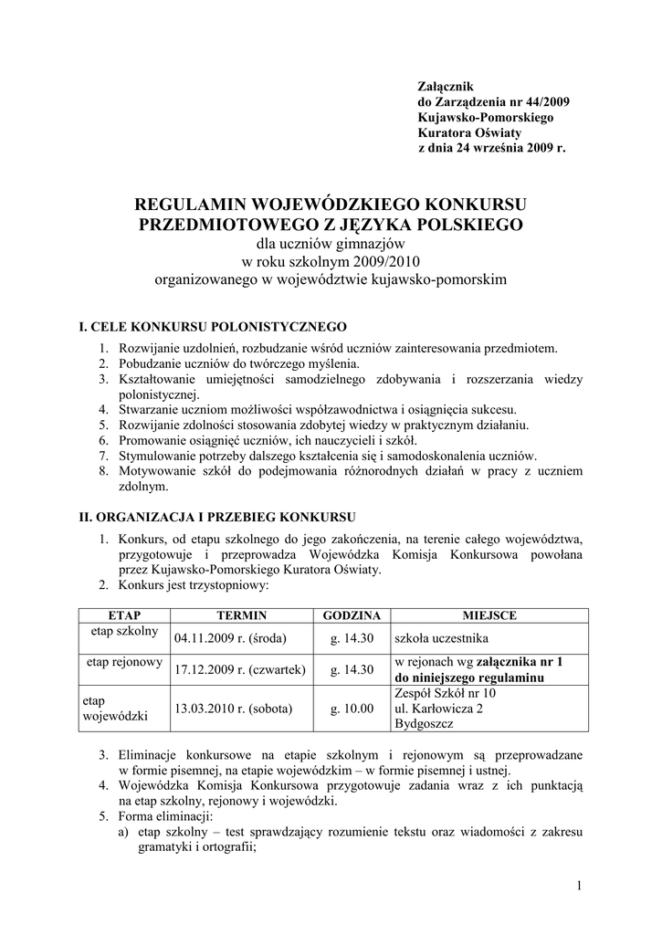 Załącznik do Zarządzenia nr 44/2009 Kujawsko-Pomorskiego Kuratora Oświaty z dnia 24 września 2009 r. REGULAMIN WOJEWÓDZKIEGO KONKURSU PRZEDMIOTOWEGO Z JĘZYKA POLSKIEGO dla uczniów gimnazjów w roku szkolnym 2009/2010 organizowanego w województwie kujawsko-pomorskim I. CELE KONKURSU POLONISTYCZNEGO 1. Rozwijanie uzdolnień, rozbudzanie wśród uczniów zainteresowania przedmiotem. 2. Pobudzanie uczniów do twórczego myślenia. 3. Kształtowanie umiejętności samodzielnego zdobywania i rozszerzania wiedzy polonistycznej. 4. Stwarzanie uczniom moŜliwości współzawodnictwa i osiągnięcia sukcesu. 5. Rozwijanie zdolności stosowania zdobytej wiedzy w praktycznym działaniu. 6. Promowanie osiągnięć uczniów, ich nauczycieli i szkół. 7. Stymulowanie potrzeby dalszego kształcenia się i samodoskonalenia uczniów. 8. Motywowanie szkół do podejmowania róŜnorodnych działań w pracy z uczniem zdolnym. II. ORGANIZACJA I PRZEBIEG KONKURSU 1. Konkurs, od etapu szkolnego do jego zakończenia, na terenie całego województwa, przygotowuje i przeprowadza Wojewódzka Komisja Konkursowa powołana przez Kujawsko-Pomorskiego Kuratora Oświaty. 2. Konkurs jest trzystopniowy: ETAP etap szkolny etap rejonowy etap wojewódzki TERMIN GODZINA 04.11.2009 r. (środa) g. 14.30 17.12.2009 r. (czwartek) g. 14.30 13.03.2010 r. (sobota) g. 10.00 MIEJSCE szkoła uczestnika w rejonach wg załącznika nr 1 do niniejszego regulaminu Zespół Szkół nr 10 ul. Karłowicza 2 Bydgoszcz 3. Eliminacje konkursowe na etapie szkolnym i rejonowym są przeprowadzane w formie pisemnej, na etapie wojewódzkim – w formie pisemnej i ustnej. 4. Wojewódzka Komisja Konkursowa przygotowuje zadania wraz z ich punktacją na etap szkolny, rejonowy i wojewódzki. 5. Forma eliminacji: a) etap szkolny – test sprawdzający rozumienie tekstu oraz wiadomości z zakresu gramatyki i ortografii; 1 b) etap rejonowy – test literacko-językowy (zadania zamknięte i otwarte o róŜnym stopniu trudności), redagowanie pracy stylistycznej; c) etap wojewódzki: część pisemna – praca stylistyczna na jeden z trzech zaproponowanych tematów; czas pisania – 45 minut; część ustna – interpretacja głosowa i literacka wylosowanego utworu poetyckiego, odpowiedź na pytanie dotyczące lektur podanych w wykazie. 6. Konkurs przeprowadza się w wydzielonych salach z uwzględnieniem zasady samodzielności. Część pisemną eliminacji przeprowadza się anonimowo, a prace są kodowane. 7. We wszystkich etapach konkursu w sali mogą przebywać wyłącznie uczestnicy, członkowie komisji konkursowej oraz obserwatorzy z ramienia Kuratora Oświaty. W składzie komisji nie moŜe zasiadać nauczyciel, który jest rodzicem uczestnika danego etapu konkursu. 8. Niestawienie się ucznia o godzinie rozpoczęcia konkursu oznacza rezygnację z udziału w konkursie. 9. KaŜdy uczestnik jest zobowiązany mieć ze sobą waŜną legitymację szkolną. 10. W etapie rejonowym konkursu moŜe wziąć udział co najwyŜej 600 uczestników konkursu, którzy uzyskali najwyŜszą liczbę punktów w etapie szkolnym, jednak nie mniej niŜ 65% punktów moŜliwych do uzyskania. 11. W etapie wojewódzkim konkursu moŜe wziąć udział co najwyŜej 150 uczestników konkursu, którzy uzyskali najwyŜszą liczbę punktów w etapie rejonowym, jednak nie mniej niŜ 75% punktów moŜliwych do uzyskania. 12. Tytuł laureata konkursu otrzymuje 40 uczestników konkursu, którzy uzyskali najwyŜszą liczbę punktów w etapie wojewódzkim, jednak nie mniej niŜ 80% punktów moŜliwych do uzyskania, a takŜe ci uczestnicy, którzy zdobyli identyczną liczbę punktów, jaką uzyskał czterdziesty finalista. JeŜeli jednak liczba laureatów jest mniejsza niŜ 10% uczniów biorących udział w finale konkursu wówczas naleŜy przyjąć, Ŝe laureatami zostają uczniowie, którzy uzyskali 80% ze średniej arytmetycznej punktów zdobytych przez pierwszych trzech uczniów z najlepszymi wynikami. 13. Sprawy nieuregulowane w niniejszym regulaminie rozstrzyga przewodniczący właściwej komisji konkursowej. II.1. Organizacja i przebieg etapu szkolnego 1) Eliminacje konkursowe stopnia szkolnego, na własny koszt, przeprowadzają szkolne komisje konkursowe. 2) Eliminacje szkolne odbywają się dnia 4 listopada 2009 roku o godz. 14.30. Czas trwania eliminacji szkolnych: 60 minut. 3) Udział uczniów w konkursie jest dobrowolny. W etapie szkolnym konkursu mogą brać udział wszyscy uczniowie zainteresowani konkursem. 4) Czas pracy uczniów zaczyna liczyć się od chwili otrzymania przez nich arkusza z zadaniami. 5) Do zadań dyrektora szkoły naleŜy: a) udzielanie uczniom, nauczycielom i rodzicom (prawnym opiekunom) informacji o organizacji Konkursu, jego terminie i zasadach udziału; b) powołanie (w formie pisemnej) szkolnej komisji konkursowej zgodnie z załącznikiem nr 3 do Regulaminu ogólnego konkursów w r. szk. 2009/2010; c) zabezpieczenie odpowiedniej ilości materiałów (w zaleŜności od liczby uczniów przystępujących do etapu szkolnego): stosownych ilości papieru do kopiowania 2 d) e) f) g) h) i) j) kart z zadaniami dla kaŜdego ucznia oraz papieru do rozwiązywania zadań i udzielania odpowiedzi; przestrzeganie tajności, terminów i procedury przeprowadzania szkolnego etapu konkursu przedmiotowego; zapewnienie uczniom moŜliwości przystąpienia do konkursów w innej szkole, jeśli nie jest organizowany konkurs w szkole macierzystej; stworzenie uczniom odpowiednich warunków do spokojnej i samodzielnej pracy; odebranie 27 października 2009 r. od godz. 12.00 do 15.00 odpowiednio w Kuratorium Oświaty w Bydgoszczy, Delegaturze w Toruniu lub w Delegaturze we Włocławku płyty CD z zadaniami i kluczem odpowiedzi. Klucz odpowiedzi dyrektor deponuje w sejfie szkoły; przekazanie przewodniczącemu szkolnej komisji konkursowej, po uprzednim zobowiązaniu go do zachowania tajności, materiałów konkursowych, karty zadań konkursowych do skopiowania dla kaŜdego ucznia i