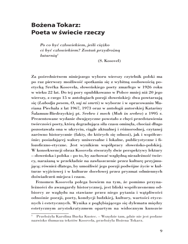 Bożena Tokarz: Poeta w świecie rzeczy Po co być człowiekiem, jeśli ciężko ci być człowiekiem? Zostań przydrożną latarnią1 (S. Kosovel) Za pośrednictwem niniejszego wyboru wierszy czytelnik polski ma po raz pierwszy możliwość spotkania się z wybitną osobowością poetycką Srečka Kosovela, słoweńskiego poety zmarłego w 1926 roku w wieku 22 lat. Do tej pory opublikowano w Polsce mniej niż 20 jego wierszy, z czego 15 w antologiach poezji słoweńskiej: dwa powtarzają się (Labodja pesem, O, saj ni smrti) w wyborze i w opracowaniu Mariana Piechala z lat 1967, 1973 oraz w antologii autorskiej Katariny Šalamun-Biedrzyckiej pt. Srebro i mech (Mah in srebro) z 1995 r. Prezentowane wydanie dwujęzyczne powstało z chęci przedstawienia twórczości poety, którą degradująca siła czasu ominęła, chociaż długo pozostawała ona w ukryciu, ciągle aktualnej i różnorodnej, czytanej zarówno historycznie (fakty, do których się odnosi), jak i współcześnie; posiadającej walory uniwersalne i lokalne, publicystyczne i filozoficzno-etyczne. Jest wynikiem współpracy słoweńsko-polskiej. W konsekwencji obraz Kosovela stworzyły dwie perspektywy lektury – słoweńska i polska – po to, by zachować względną niezależność twórcy, narażaną w przekładzie na zawłaszczenie przez kulturę przyjmującą; również dlatego, by umożliwić jego poezji podwójne życie w kulturze wyjściowej i w kulturze docelowej przez pryzmat odmiennych doświadczeń miejsca i czasu. Fenomen Kosovela polega bowiem na tym, że pomimo przynależności do awangardy historycznej, jest bliski współczesnemu odbiorcy ze względu na stawiane przez niego pytania i wątpliwości odnośnie poezji, poety, kondycji ludzkiej, kultury, wartości etycznych i estetycznych. Wynika z pogłębiającego się dylematu między estetycznym arystokratyzmem opartym na widocznym kunszcie Przełożyła Karolina Bucka Kustec. – Wszędzie tam, gdzie nie jest podane nazwisko tłumacza tekstów Kosovela, przełożyła Bożena Tokarz. 1 9 artystycznym a estetycznym plebejstwem sprawiającym wrażenie, że poezja pisze się sama, ponieważ zacierane są ślady tego kunsztu lub go po prostu nie ma. Artysta staje przed nim od początku XX wieku. Z jednej strony konsumpcjonizm kultury masowej dostarcza rozrywki o charakterze paraestetycznym, niewymagającej i nierozwijającej wrażliwości percepcyjnej, estetycznej i psychicznej odbiorcy w sferze intelektualnej i emocjonalnej. Jednocześnie za pośrednictwem mass-mediów odbywa się upowszechnienie wiedzy i informacji będącej poza zasięgiem przeciętnego odbiorcy. Z drugiej strony czytelnik pragnie alternatywnie uczestniczyć w rzeczywistości, co umożliwia mu sztuka swą nieprzypadkową formą. Jej kondycję określa bowiem status ontologiczny i sposób funkcjonowania. Sprawia, że odbiorca negocjacyjnie dystansuje się do codzienności, choć pozwala też na ucieczkę i przeżycie katharsis dzięki możliwości przebywania w odmiennej rzeczywistości. Poezja znalazła się przed koniecznością uwzględnienia tych dwóch tendencji ze względów praktycznych, co ma konsekwencje estetyczne i etyczne. W świecie rzeczy, zysku, dominacji i ambicji materialna niewymierność stanów psychicznych, wynikająca z przeżycia, doznania, emocji pozytywnych i negatywnych oraz umiejętności radzenia sobie z nimi (czułość – oschłość, przyjaźń – wrogość, miłość – nienawiść, podziw – pogarda, fascynacja – odrzucenie itp.), nie tyle pozostaje niedostrzegana, ile pozornie utrudnia zdobywanie praktycznego celu, ograniczając samozrozumienie, a w konsekwencji wrażliwość etyczną i emocjonalną. Stany te wpływają na sposób postrzegania, rozumienia i komunikowania w świecie ludzi i – z będącym z nim w relacji – świecie rzeczy. Sztuka umożliwia, m. in., zachowanie równowagi między tym, co wymierne i tym, co niewymierne, lecz zasięg jej oddziaływania zmienia się w zależności od kontekstu kulturowo-społecznego. Na przestrzeni XX wieku, rozszerzając się ilościowo, zasięg ten stopniowo zawęził się jakościowo, zagrażając redukcją przestrzeni mentalnej i aksjologicznej. Realny wpływ na rzeczywistość uzależniony jest od mass-mediów i ich odbiorców. Po to więc, by uczestniczyć w relacjach międzyludzkich, sztuka sięga do struktury powszechnych medialnie przekaźników. Antycypował to zjawisko Kosovel w swojej poezji, jak również artyści początku wieku XX. Uwzględniali je też polscy poeci międzywojenni 10 – Aleksander Wat i Tadeusz Peiper oraz inni poeci awangardy historycznej. Gesty artystyczne poetów nie zawsze były jednak zrozumiałe nie tylko dla szerszego odbiorcy.2 Zważywszy na los i kształt spuścizny literackiej słoweńskiego poety, szczególne znaczenie dla jej recepcji w Słowenii miał tom wierszy wybranych pt. Integrali (Całki), opublikowany pod redakcją Antona Ocvirka w 1967 roku, niebędący jednak rekonstrukcją tomu zapowiadanego przez poetę. W poprzedzonym przez redaktora obszernym studium krytycznym zwrócił uwagę na Kosovela jako na rewelatora poezji słoweńskiej. Swoisty renesans i odkrycie jego dzieła nastąpiło za sprawą młodych twórców w latach 70. i 80. (grupy „Laibach Kunst” i później grupy „Novi Kolektivizem”), ponieważ dostrzegli w nim artystę sobie współczesnego. W latach 20. Kosovel publikował pojedyncze wiersze i eseje w słoweńskich czasopismach oraz wygłaszał je na wieczorach i spotkaniach literackich. Był silnie zaangażowany w społeczne i awangardowe życie artystyczne Lublany tamtego czasu. Nie zdążył jednak zadebiutować samodzielnym tomikiem poetyckim. Do druku został przygotowany tom pt. Zlati čoln (Złota łódź), natomiast w opracowaniu znajdował się również inny, zatytułowany Integrali. O pracy nad tym drugim pisał poeta w listach do swej przyjaciółki Fanici Obidovej. Gotowy do druku tomik znajdował się w pozostawionej