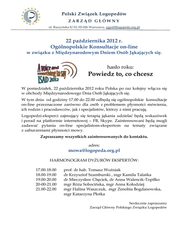 Polski Związek Logopedów ZARZĄD GŁÓWNY ul. Raszyńska 8/10, 02-026 Warszawa, [email protected] 22 października 2012 r. Ogólnopolskie Konsultacje on-line w związku z Międzynarodowym Dniem Osób Jąkających się. hasło roku: Powiedz to, co chcesz W poniedziałek, 22 października 2012 roku Polska po raz kolejny włącza się w obchody Międzynarodowego Dnia Osób Jąkających się. W tym dniu od godziny 17.00 do 22.00 odbędą się ogólnopolskie konsultacje on-line przeznaczone zarówno dla osób z problemem płynności mówienia, ich rodzin i pracodawców, jak i specjalistów, którzy z nimi pracują. Logopedzi-eksperci zajmujący się terapią jąkania udzielać będą wskazówek i porad na platformie internetowej – FB, Skype. Zainteresowani będą mogli zadawać pytania on-line specjalistom-ekspertom na tematy związane z zaburzeniami płynności mowy. Zapraszamy wszystkich zainteresowanych do kontaktu. adres: [email protected] HARMONOGRAM DYŻURÓW EKSPERTÓW: 17.00-18.00 18.00-19.00 19.00-20.00 20-00-21.00 21.00-22.00 prof. dr hab. Tomasz Woźniak dr Krzysztof Szamburski , mgr Kamila Talaśka dr Mieczysław Chęciek, dr Anna Walencik-Topiłko mgr Róża Sobocińska, mgr Anna Kołodziej mgr Halina Waszczuk, mgr Zenobia Bogdanowska, mgr Katarzyna Płotka Serdecznie zapraszamy Zarząd Główny Polskiego Związku Logopedów